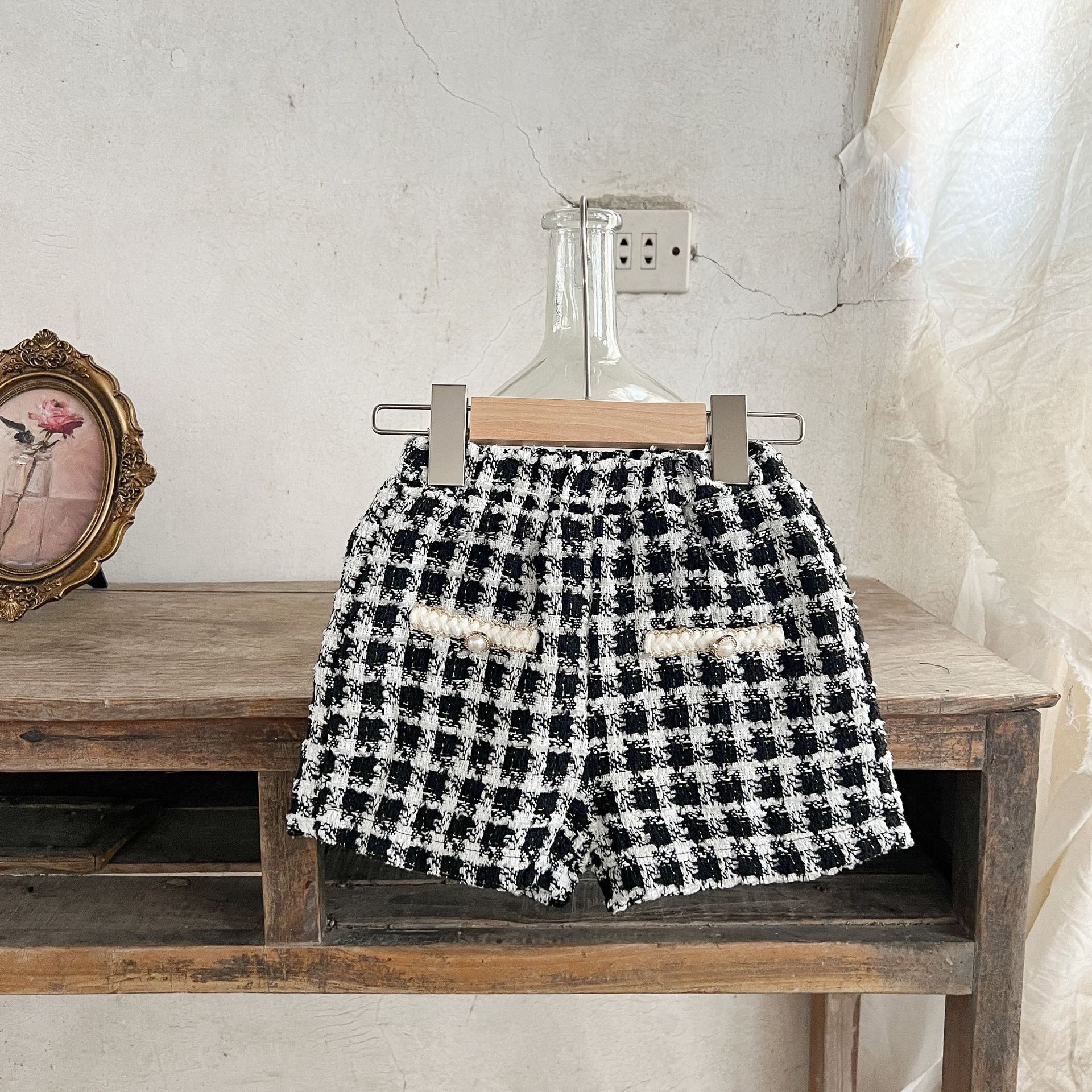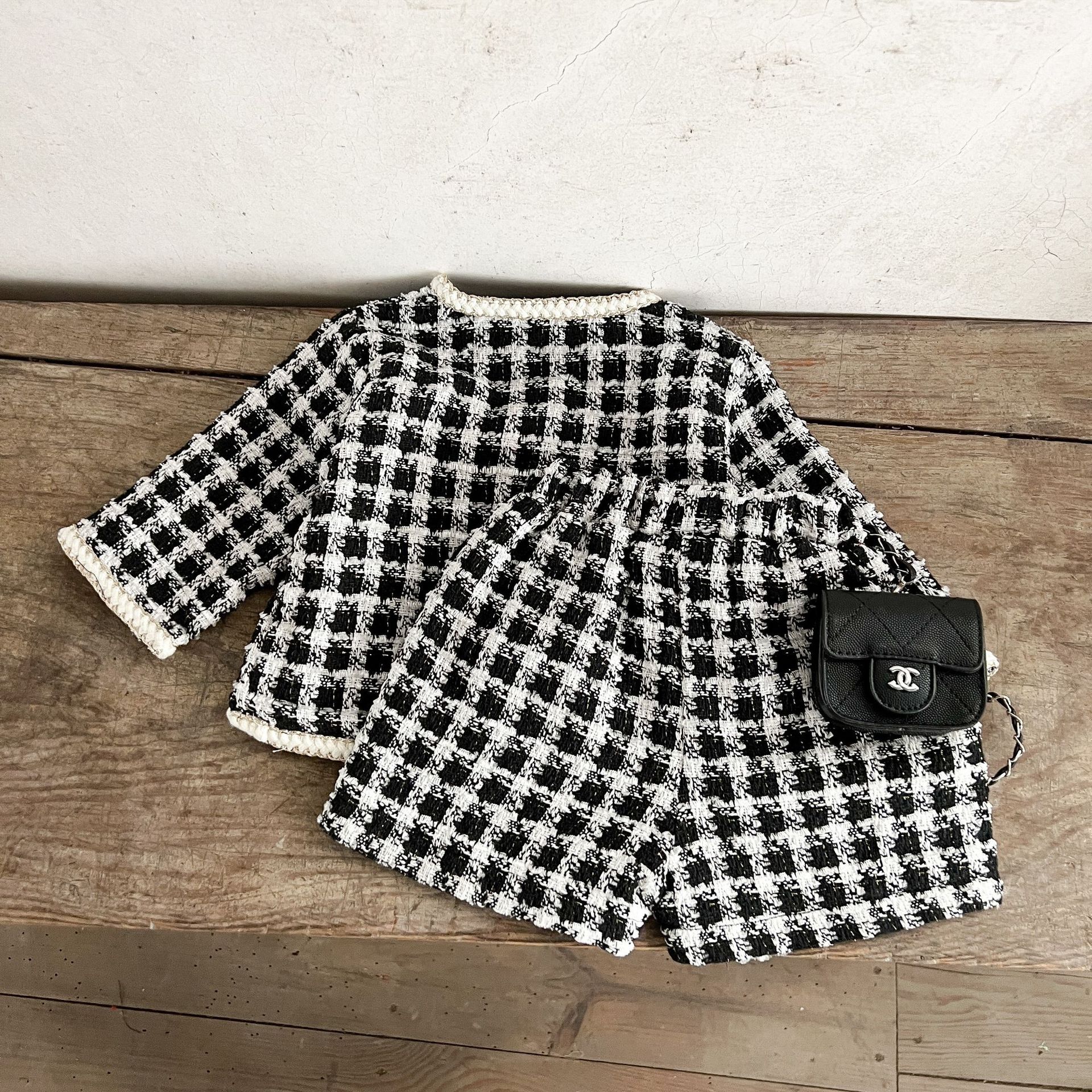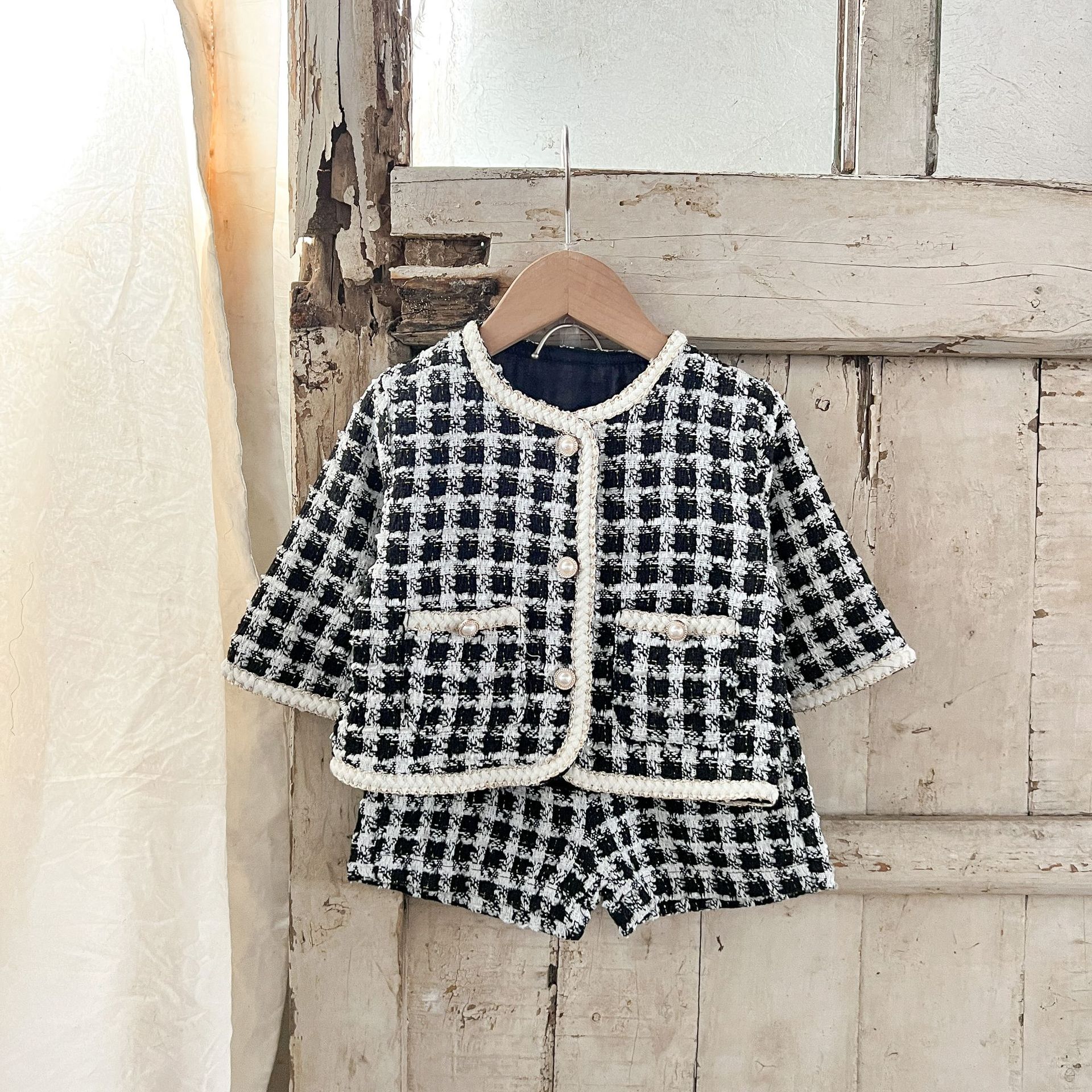 2023ins 봄 착용 아기 소녀 아기 트위드 격자 무늬 긴팔 셔츠 오픈 재킷 + 짧은 바지 투피스 세트