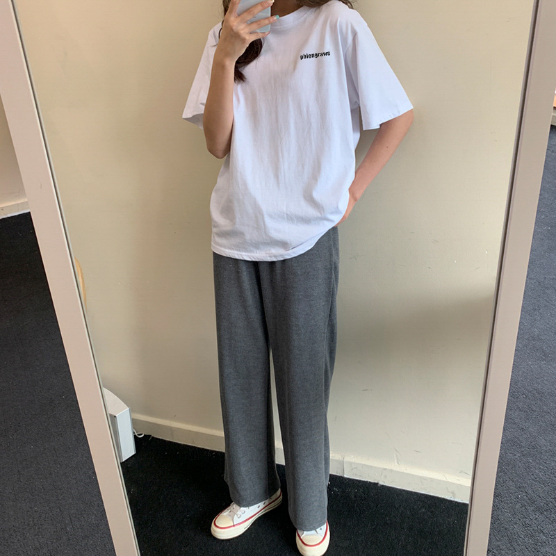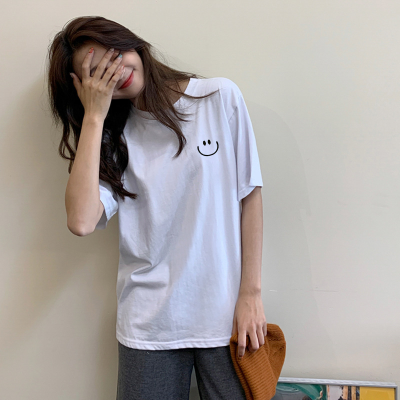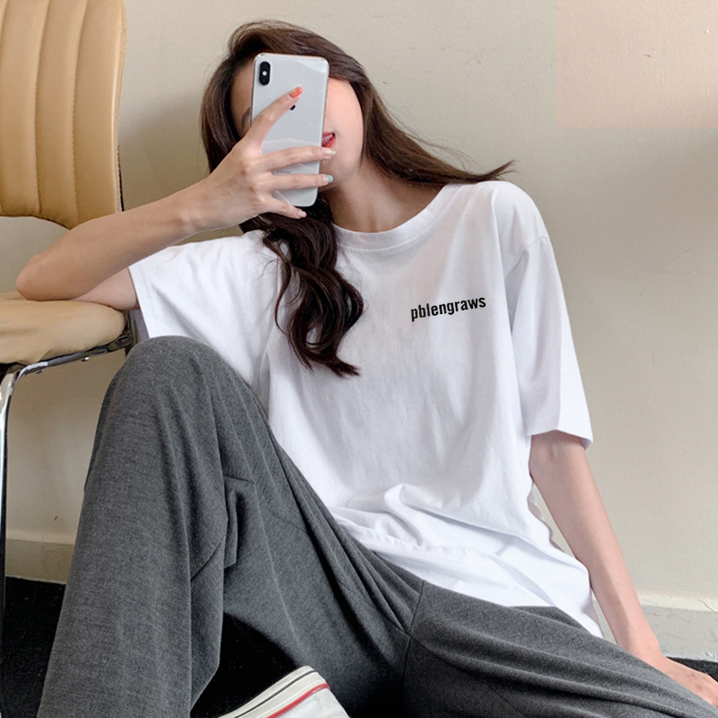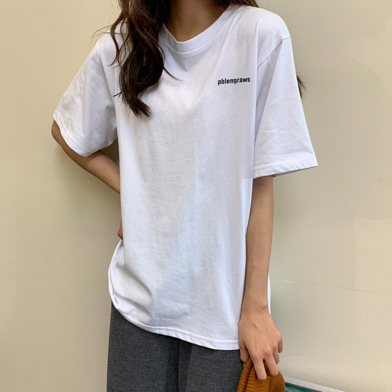 코튼 화이트 반팔 여성용 티셔츠 신학생 편지 심플 루즈한 플러스 사이즈 탑 라운드 넥 모든 매치 인 티셔츠스토어 가기