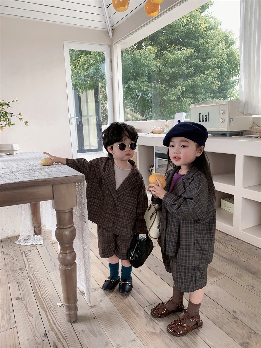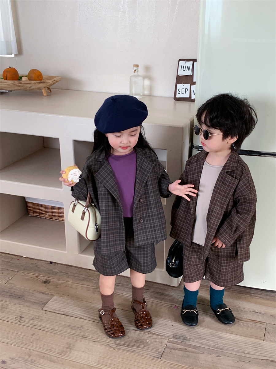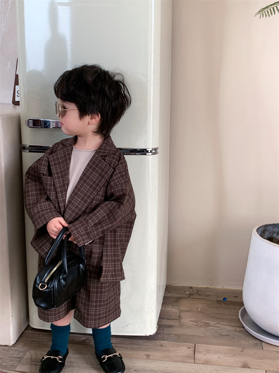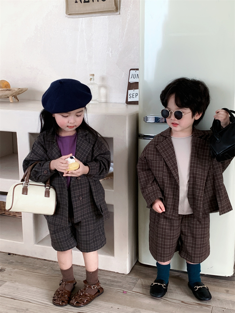 Jiaye 아동복 2025 봄 신상 아동 체크무늬 정장 재킷, 남녀 아기 숲풍 반바지 투피스 슈트스토어 가기