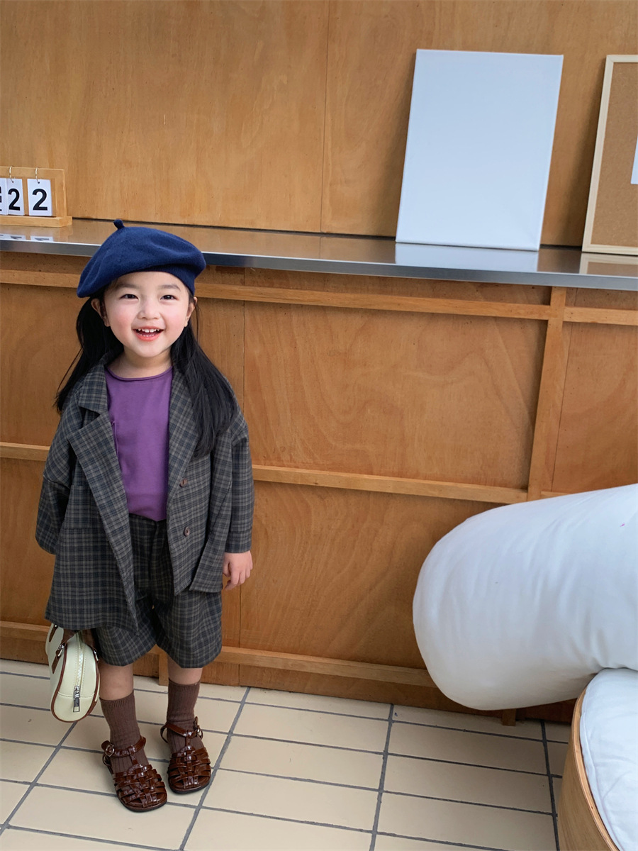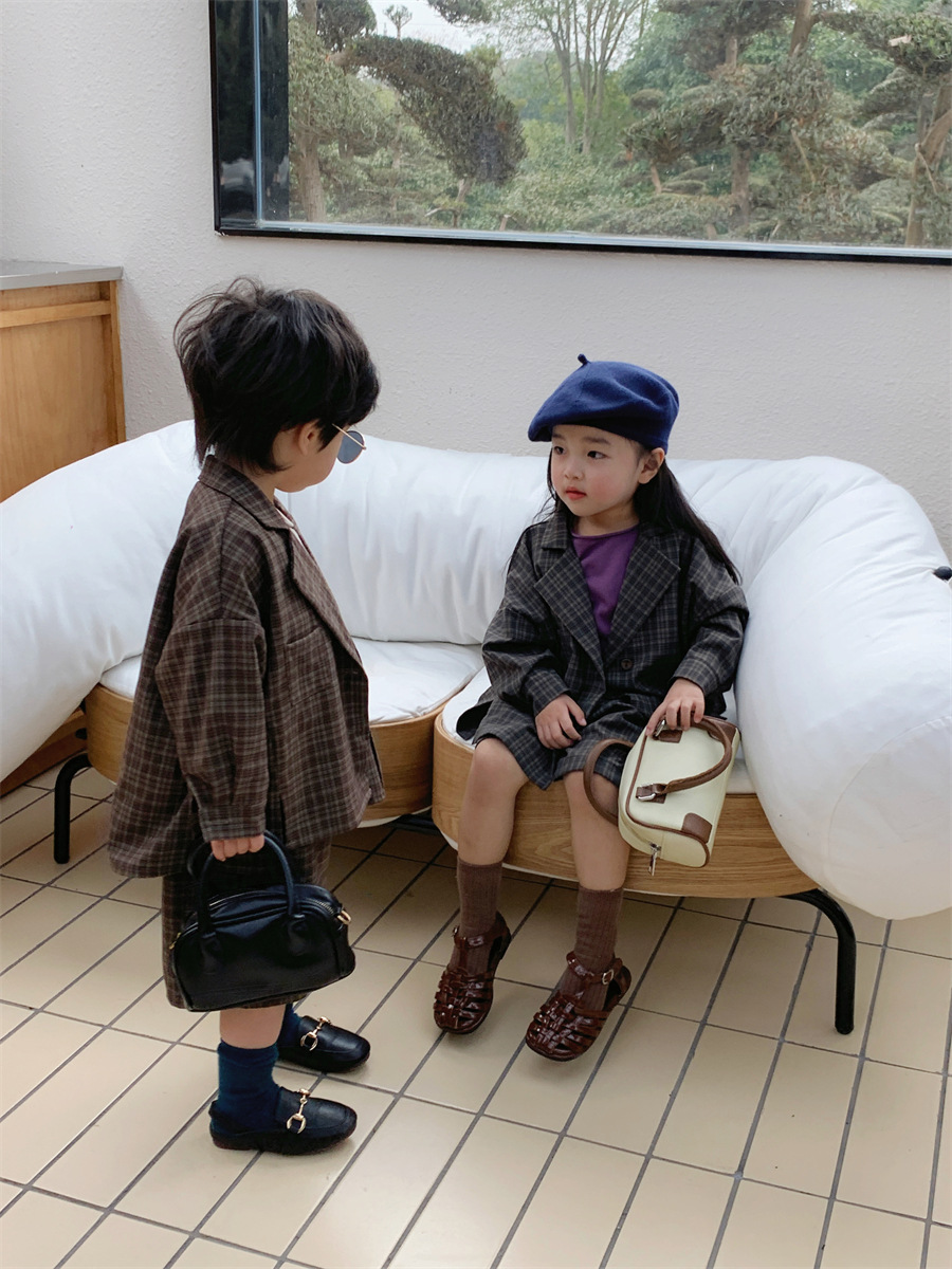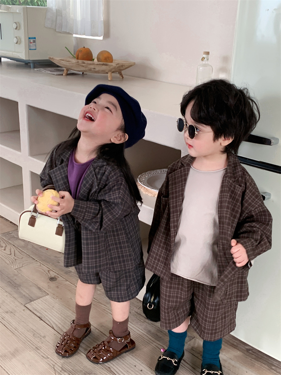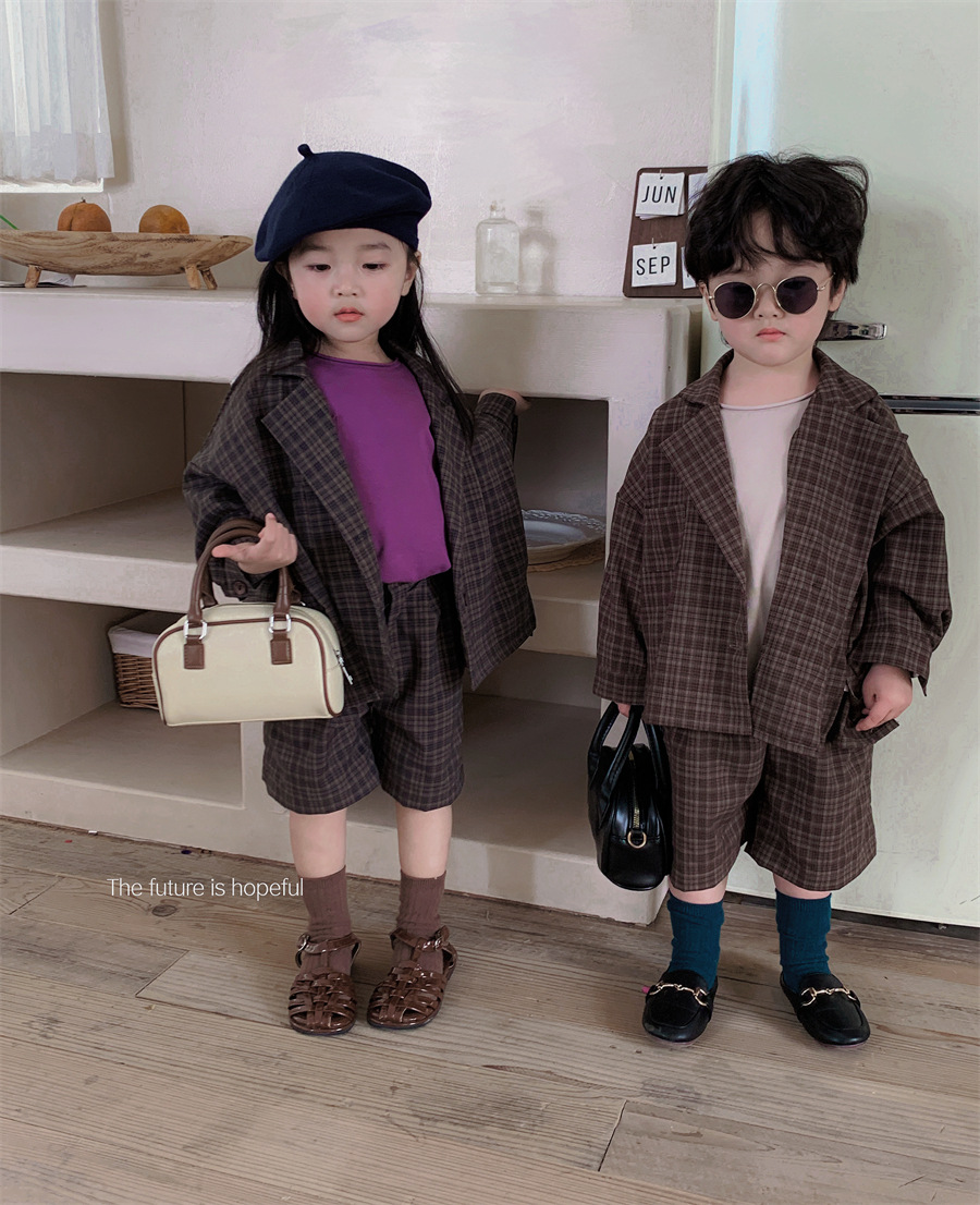 Jiaye 아동복 2025 봄 신상 아동 체크무늬 정장 재킷, 남녀 아기 숲풍 반바지 투피스 슈트스토어 가기