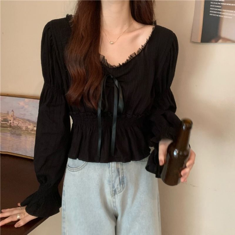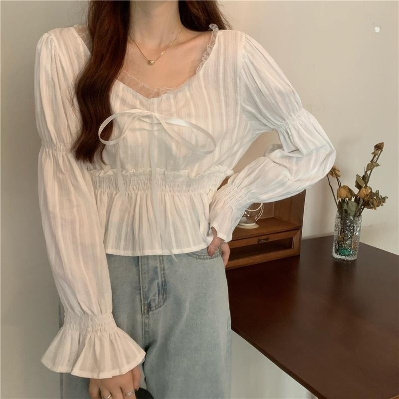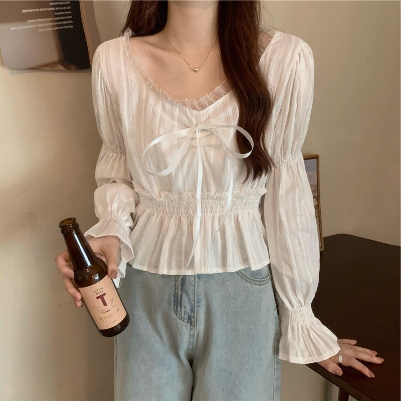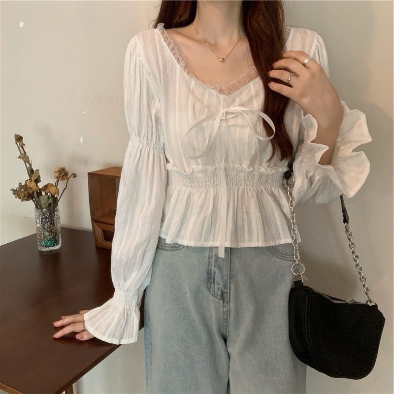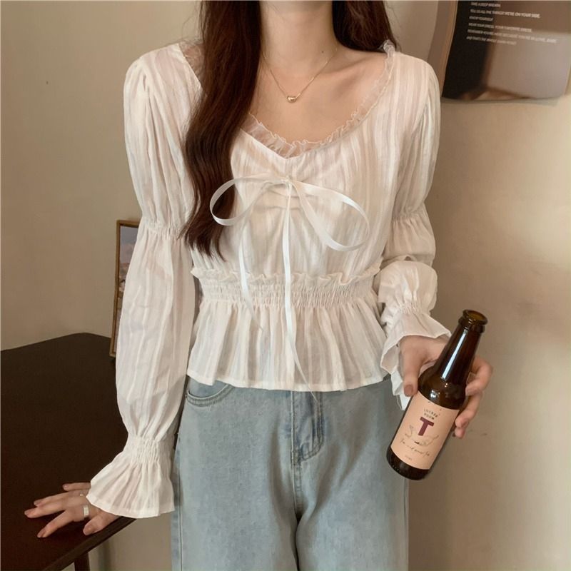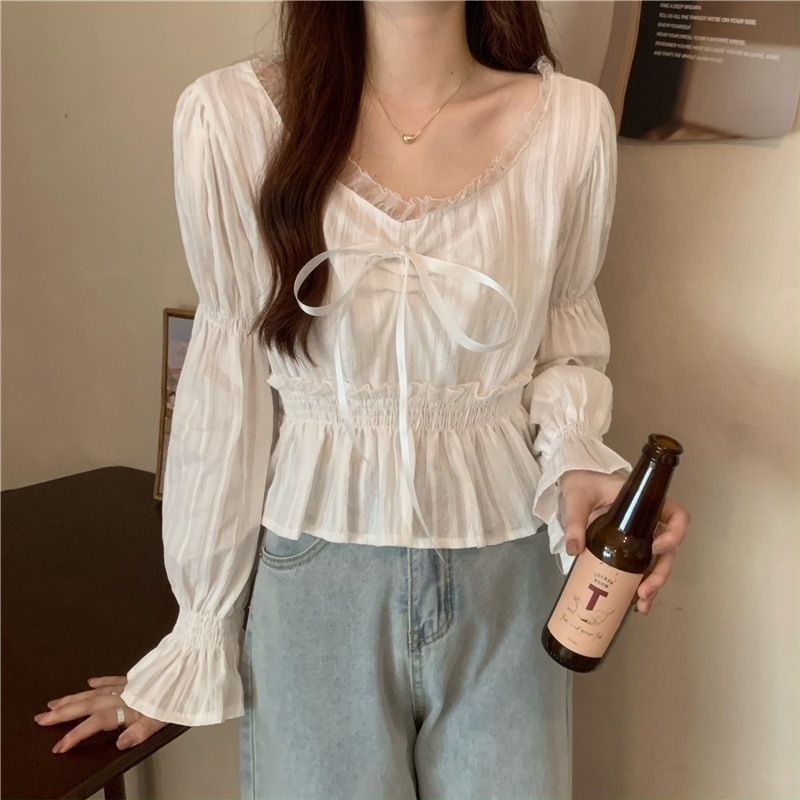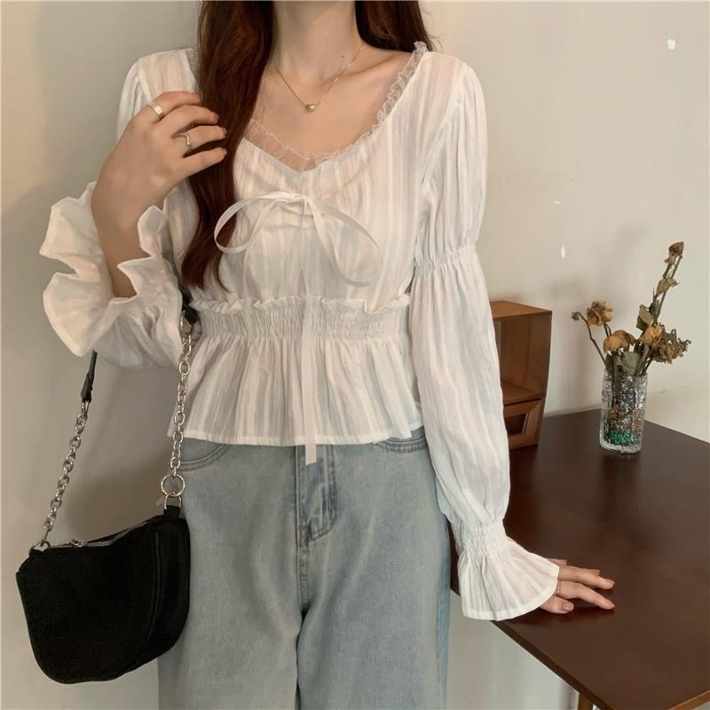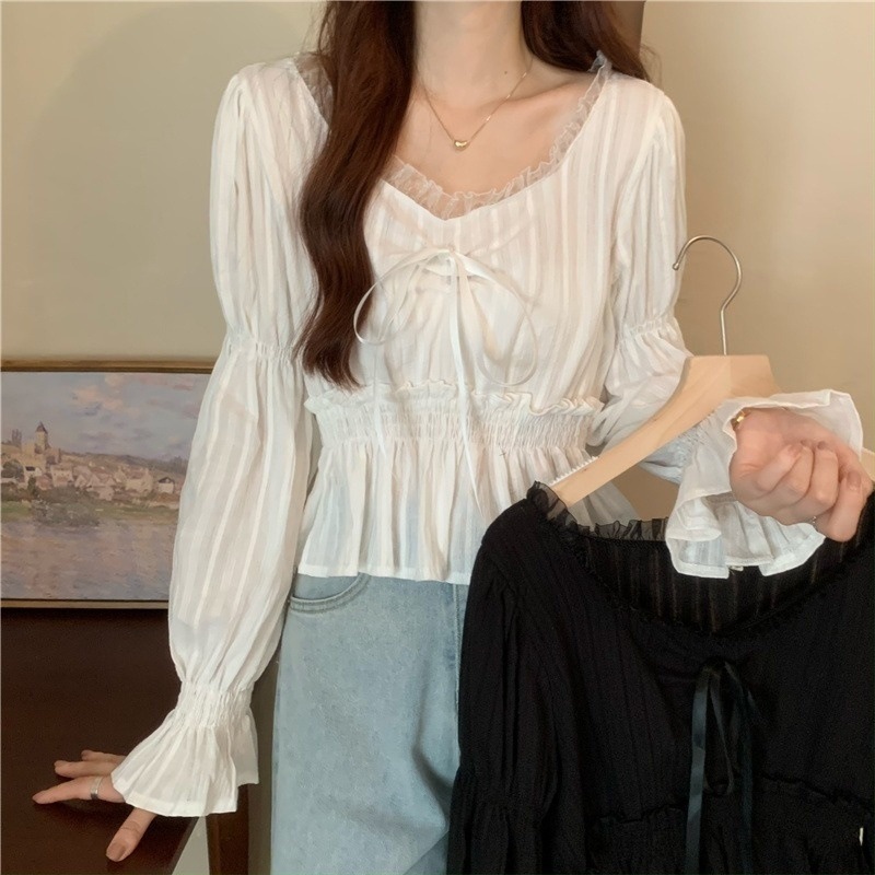 달콤하고 아름다운 요정 쉬폰 셔츠 패션 레이스 스티칭 허리 셔츠 여성용 2023 봄과 가을 새로운 주름 셔츠스토어 가기