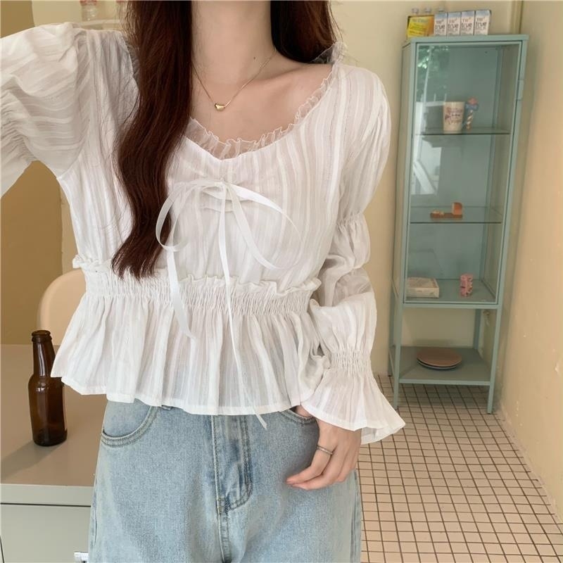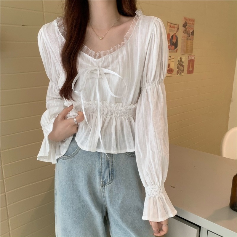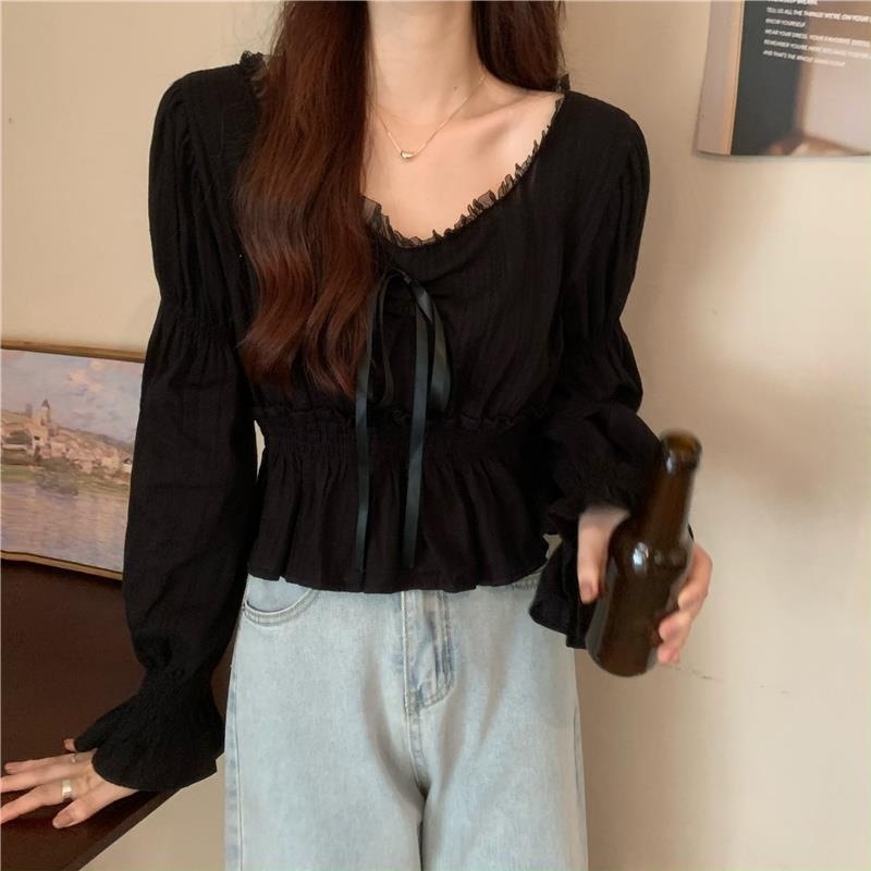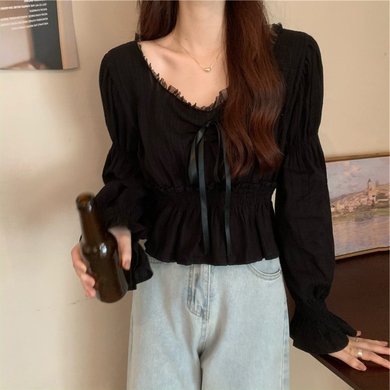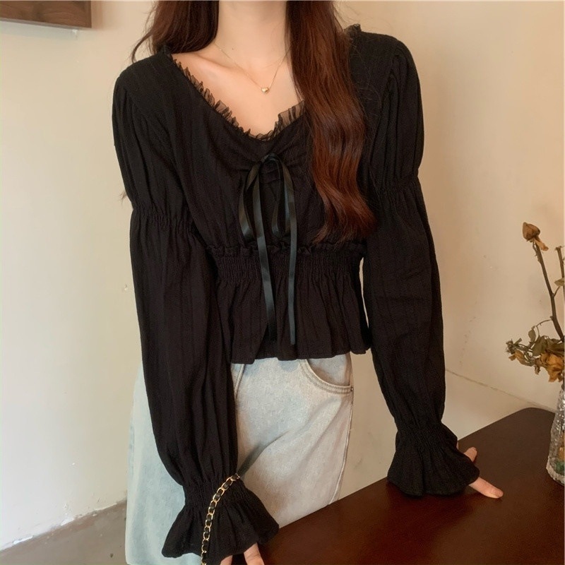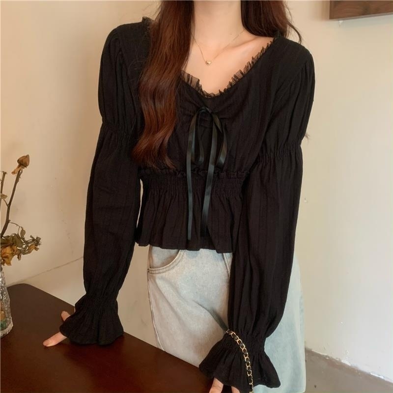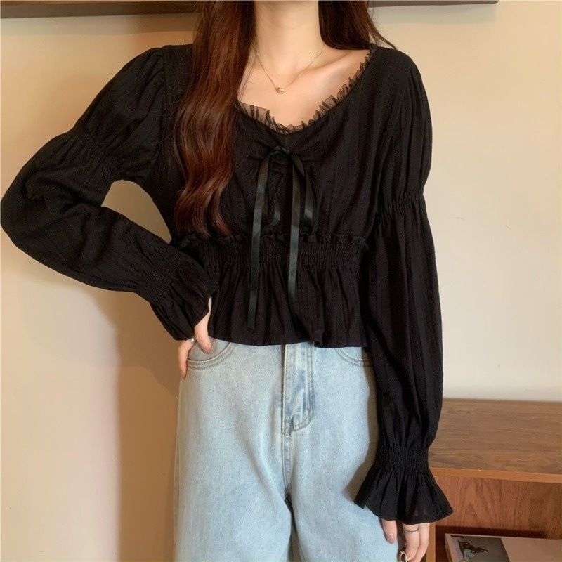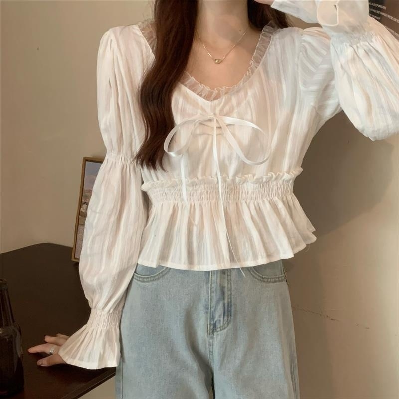 달콤하고 아름다운 요정 쉬폰 셔츠 패션 레이스 스티칭 허리 셔츠 여성용 2023 봄과 가을 새로운 주름 셔츠스토어 가기