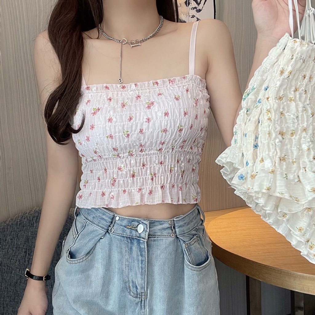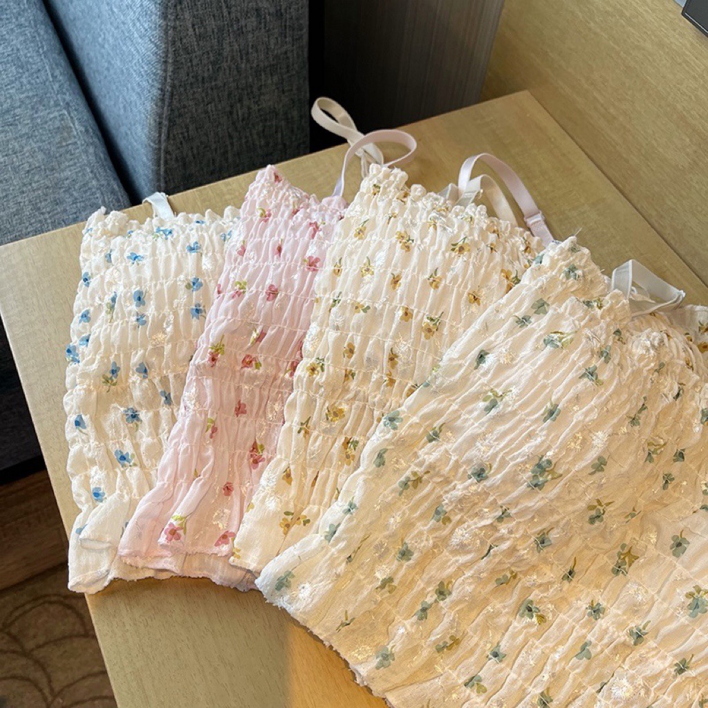 가슴 패드가 있는 여성용 신상 작은 꽃무늬 캐미솔, 주름진 아름다운 등 캐미솔, 가슴을 감싸는 튜브탑스토어 가기