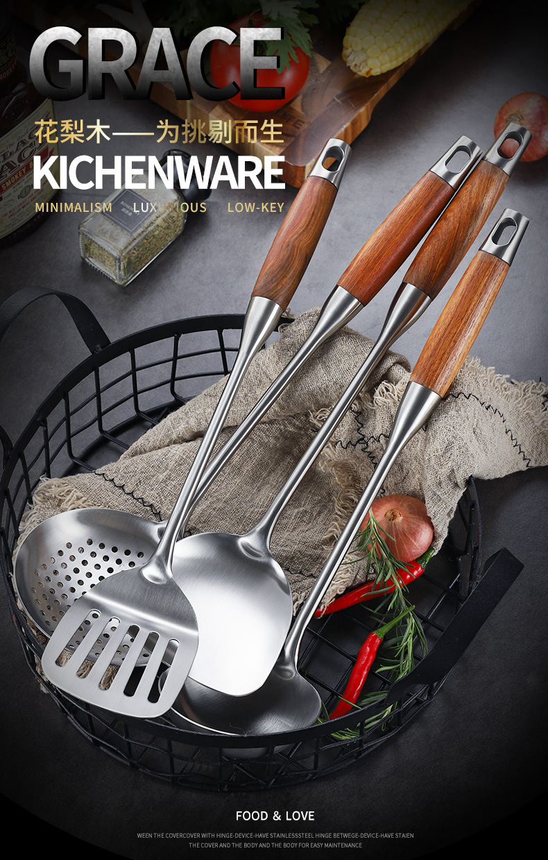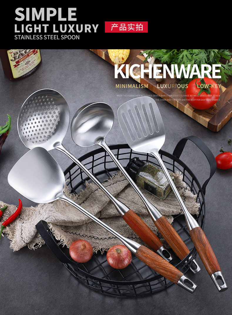 주걱 요리 주방 용품 세트 4 피스 세트 304 스테인레스 스틸 로즈 우드 볶음 주걱 세트 안티 콜딩 롱 핸들