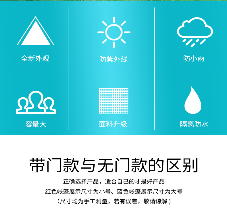 注意,支架为扁钢丝的帐篷,由于钢丝特性,受力方向改变后会使帐篷变形,矫正下即可恢复,此非质量问题,介意勿拍。