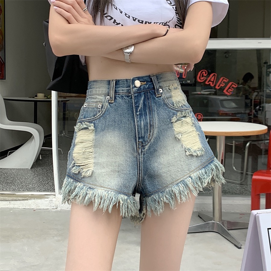 2023 여름 한국 스타일 디자인 센스 홀 워시 데님 반바지 여성용 하이 웨이스트 슬리밍 얇은 스트레이트 다리 바지 트렌디스토어 가기