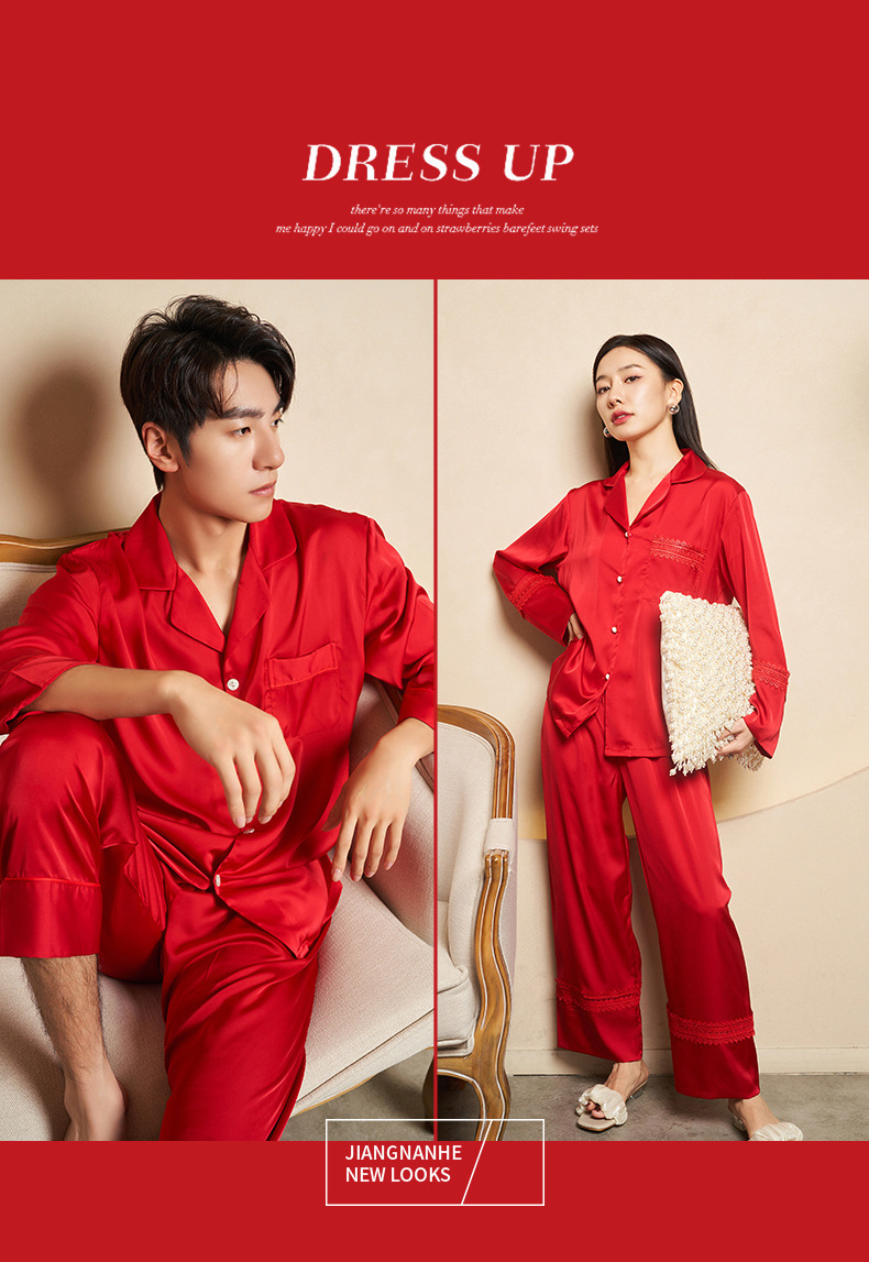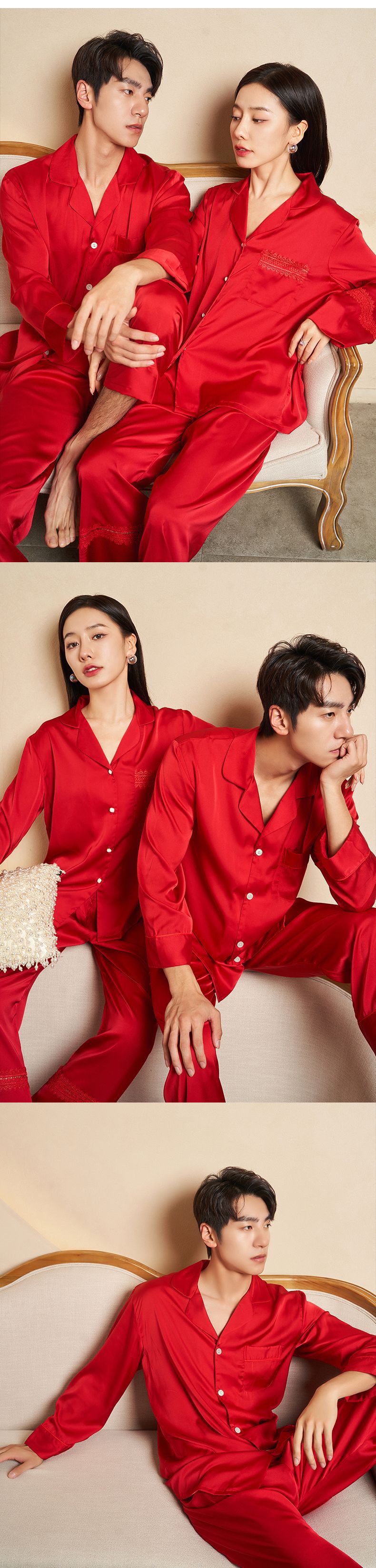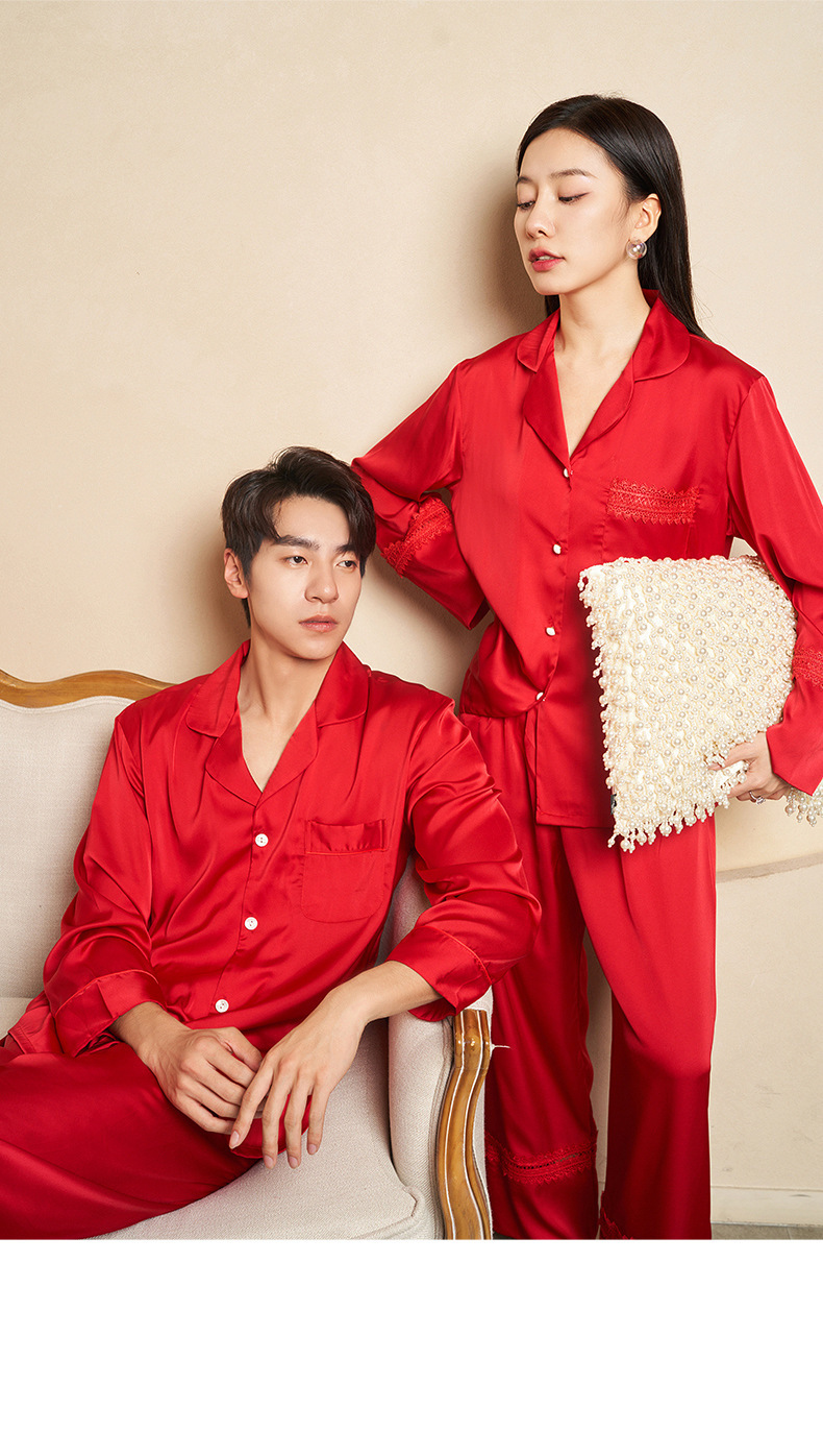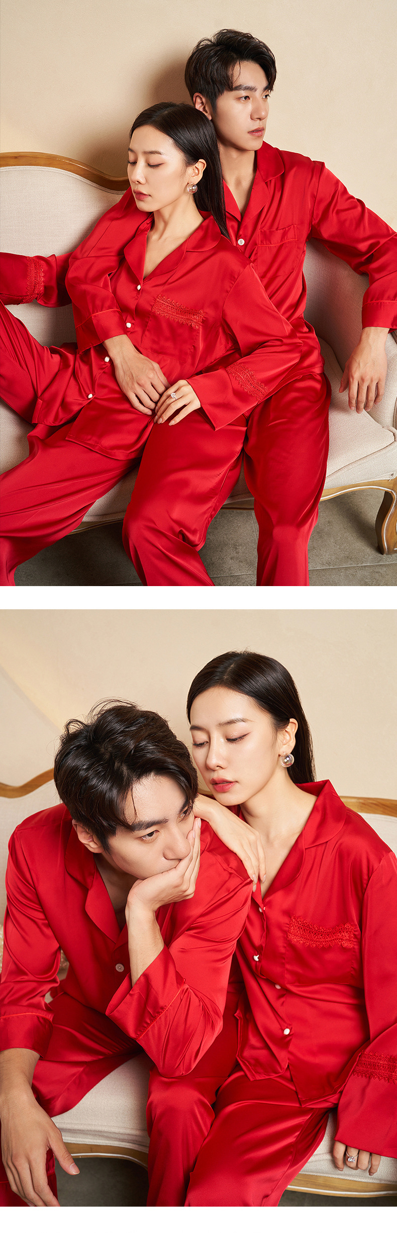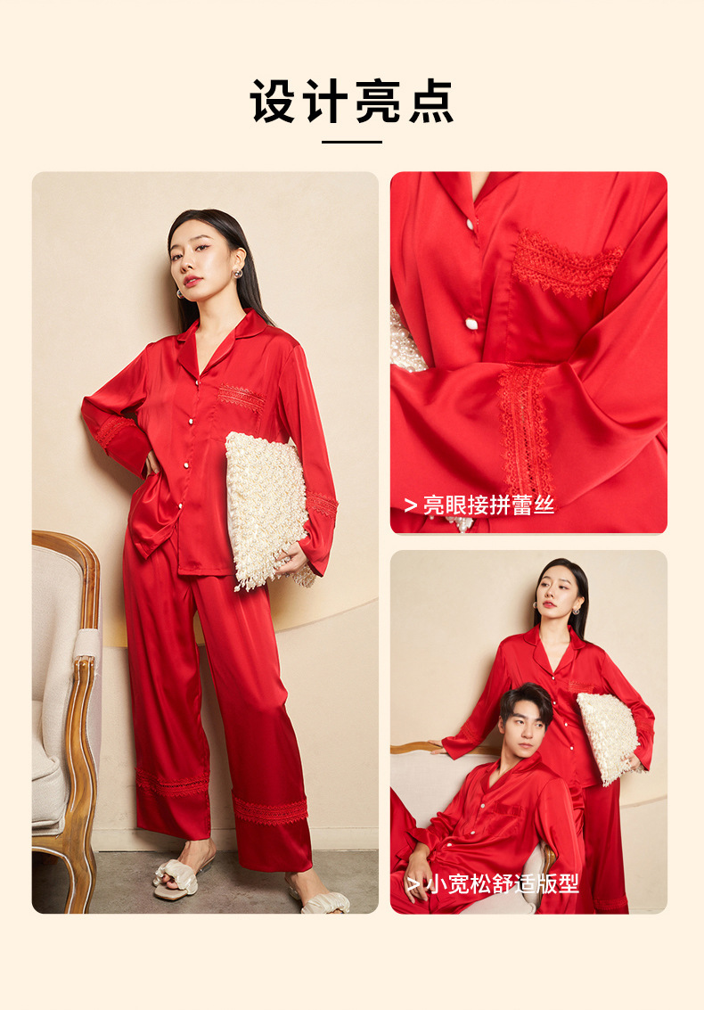 커플 잠옷 봄 아이스 실크 레이스 스티치 웨딩 세트 고급스러운 결혼 축하 홈웨어 라이트 럭셔리