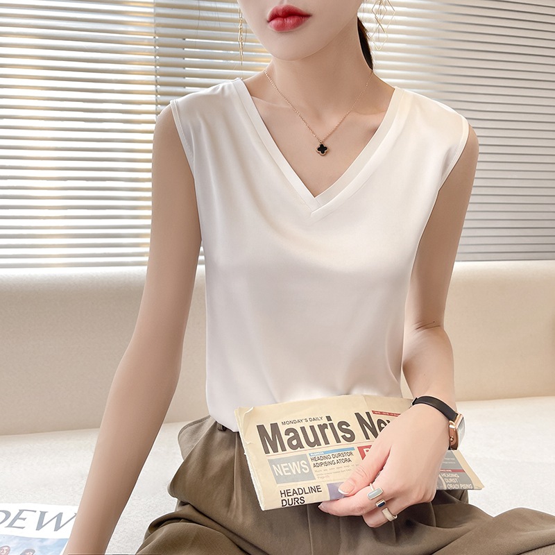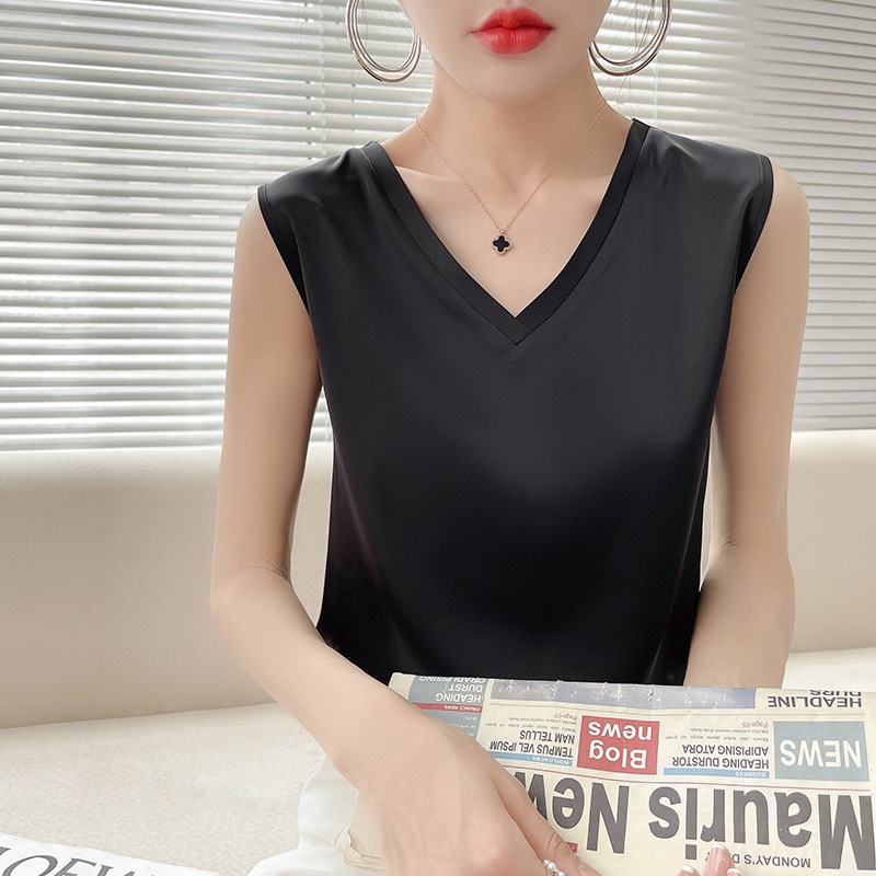 크로스보더 도매 봄철 넓은 어깨끈 아이스 실크 민소매 조끼 여성용 V넥 루즈핏 탑 무지 베이스 레이어 민소매스토어 가기