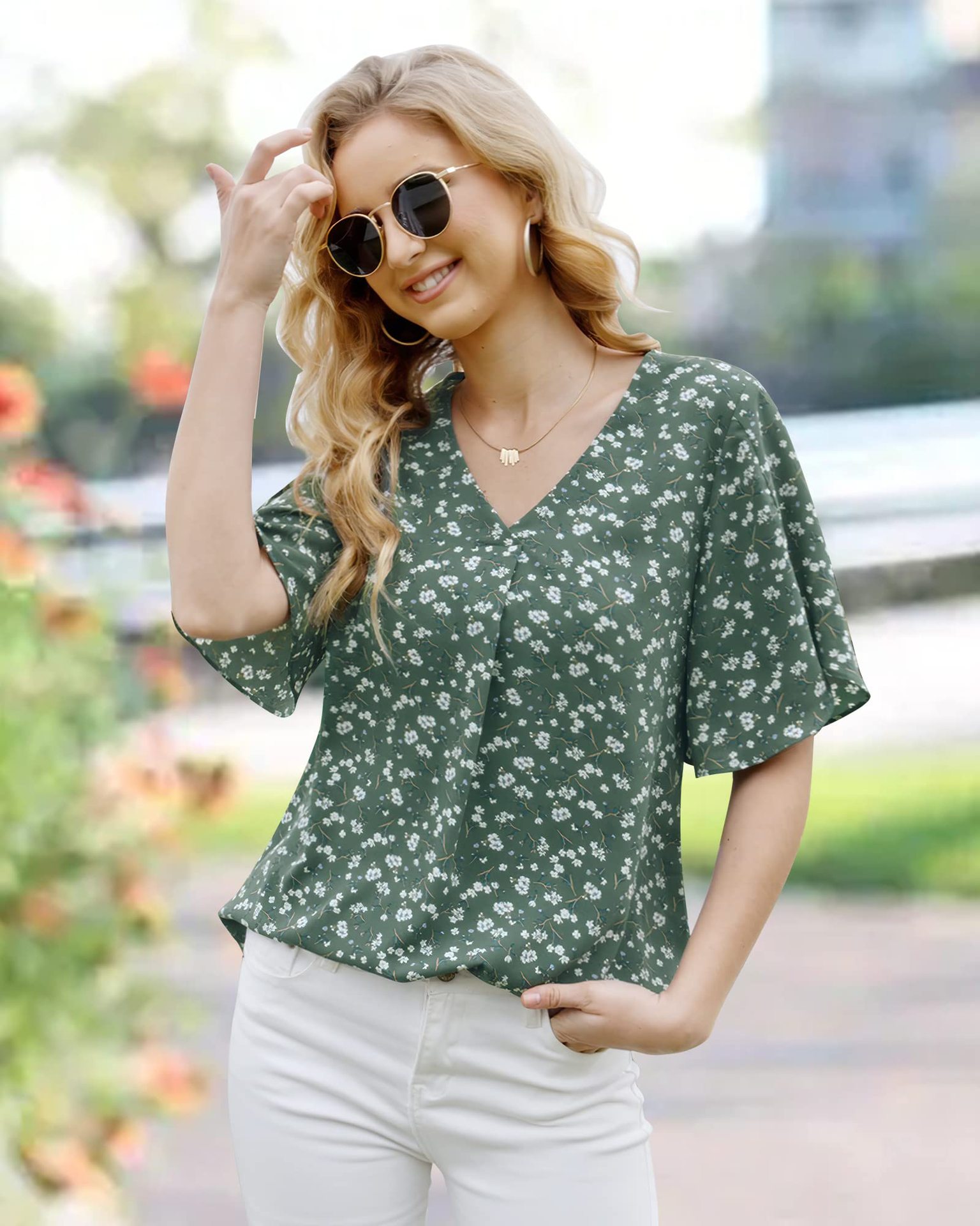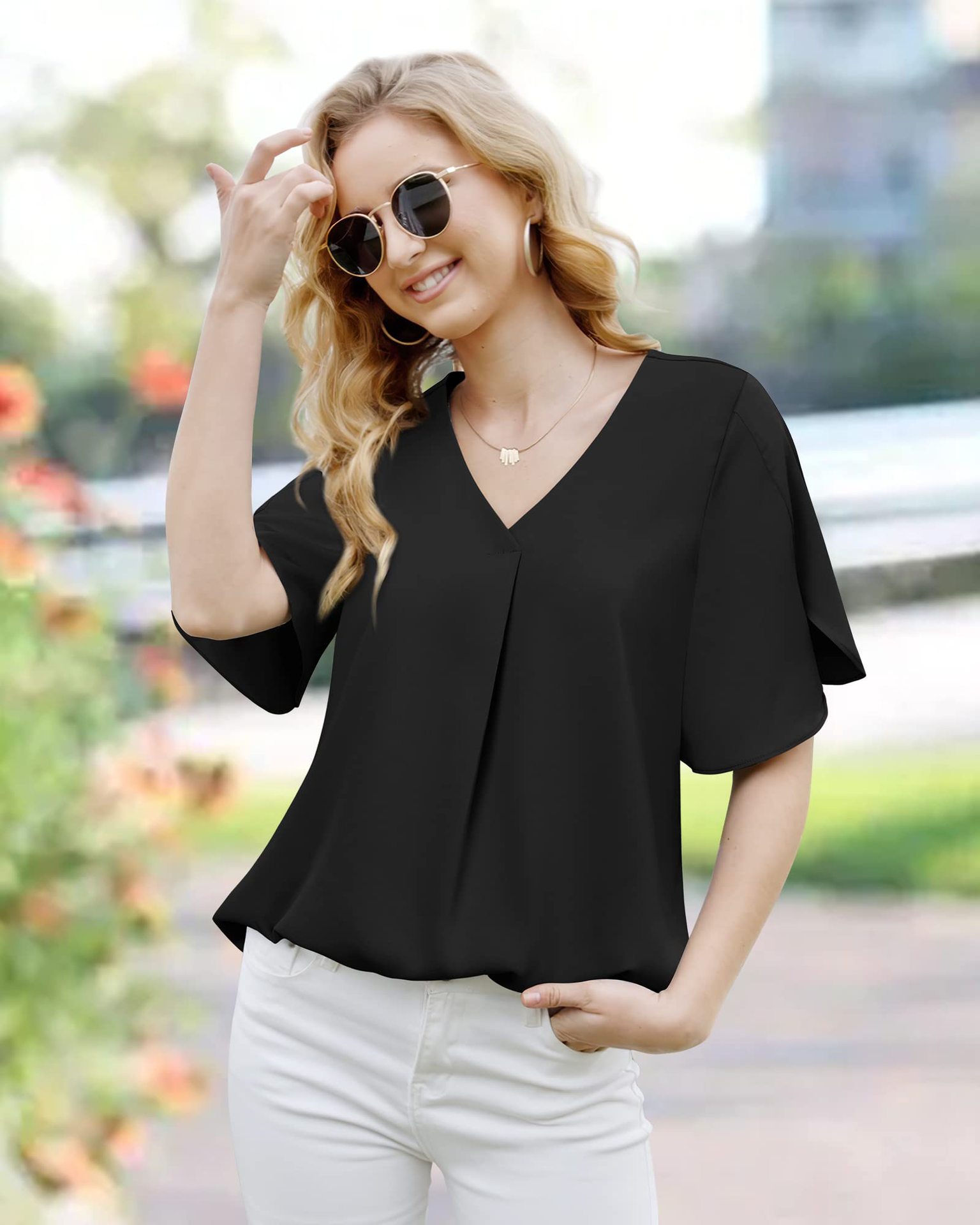 크로스 보더 2023 여름 새 쉬폰 셔츠 여성용 아마존 유럽과 미국 패션 반팔 V-넥 더브테일 셔츠 여성용스토어 가기