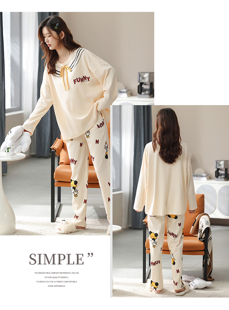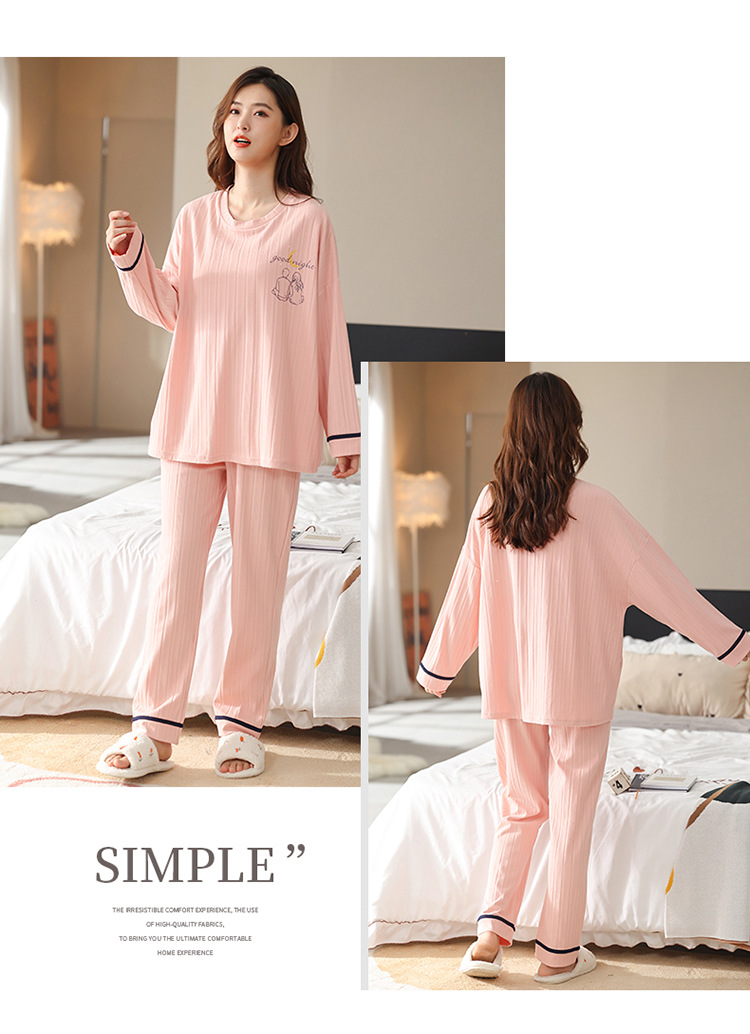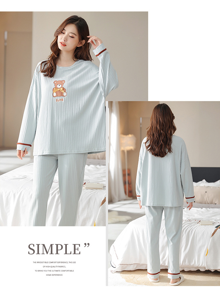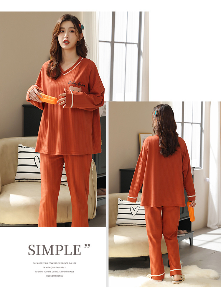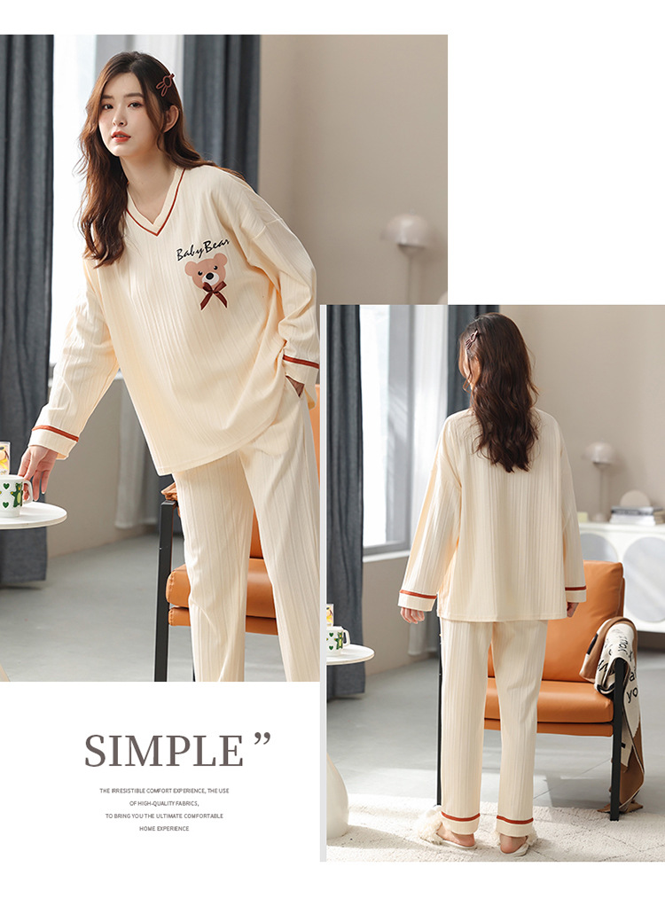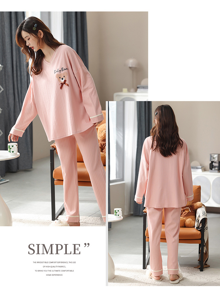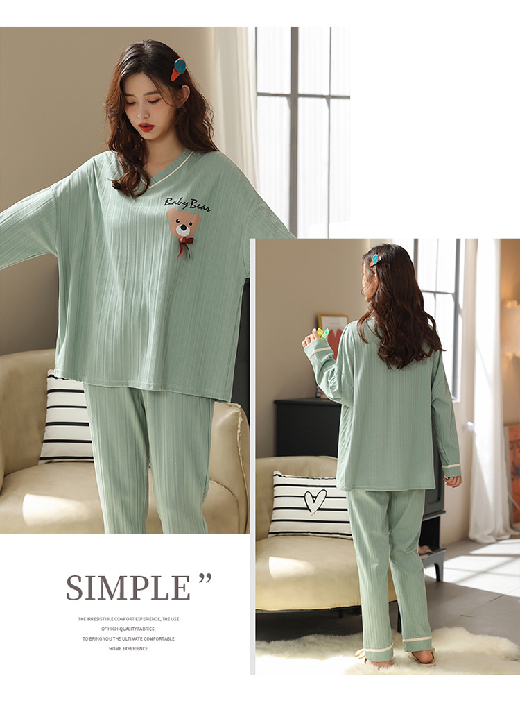 봄과 가을 잠옷 여성용 면 V-넥 긴팔 바지 세트 단색 곰 느슨한 플러스 사이즈 가정 의류 여성의 겉옷