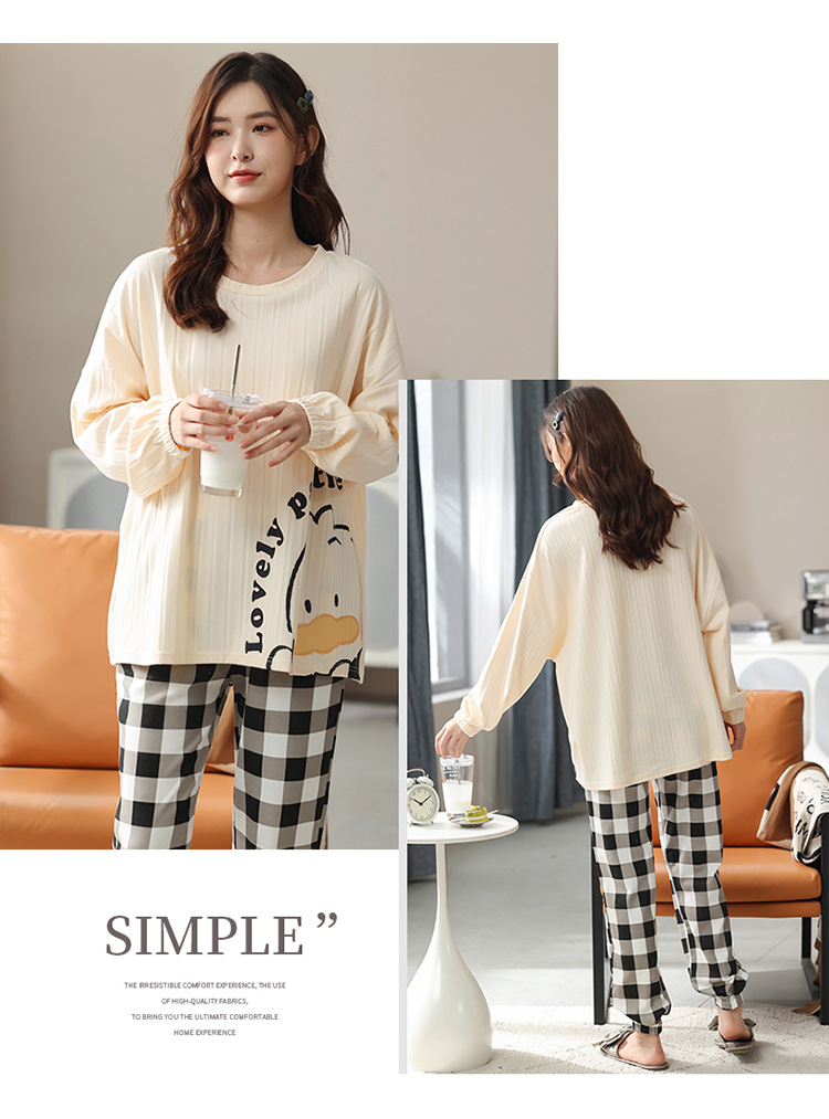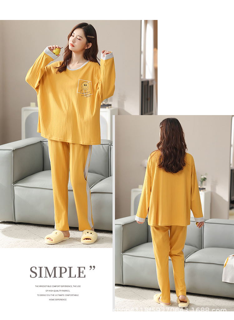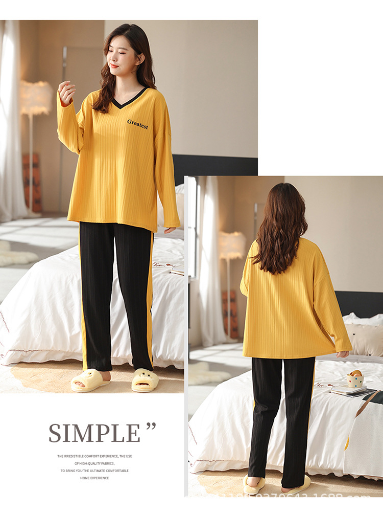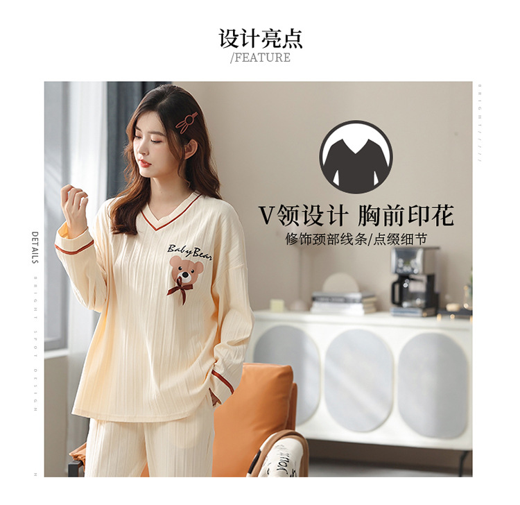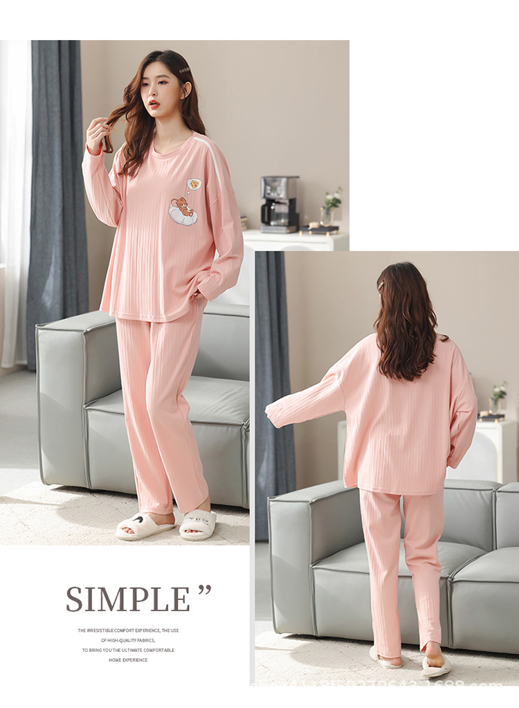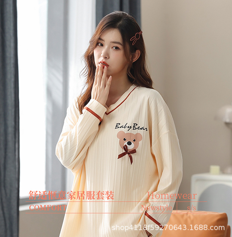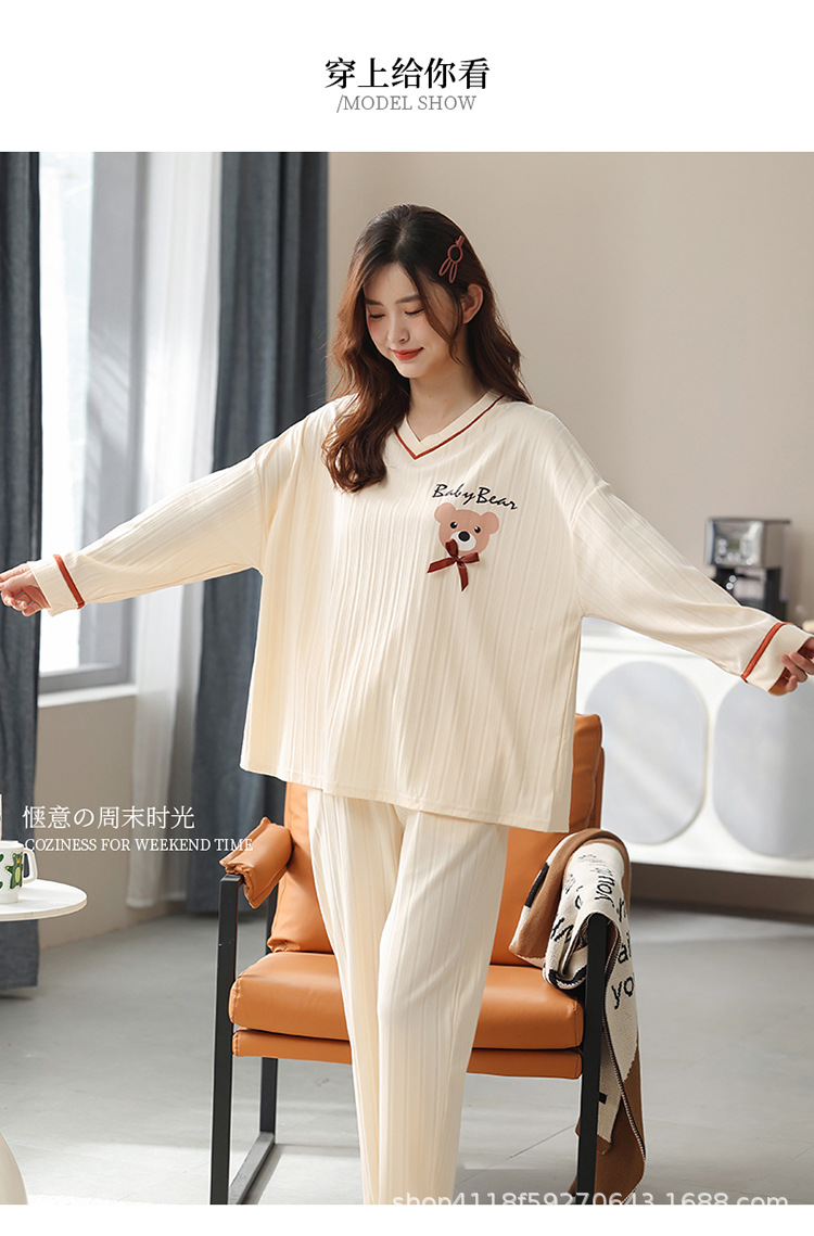 봄과 가을 잠옷 여성용 면 V-넥 긴팔 바지 세트 단색 곰 느슨한 플러스 사이즈 가정 의류 여성의 겉옷스토어 가기
