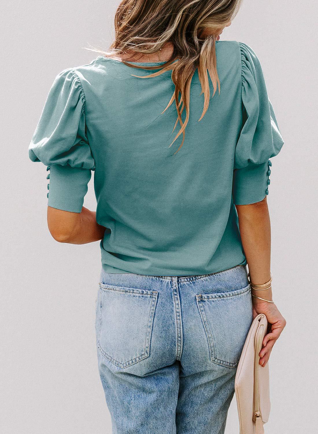 2023 여름 크로스 보더 유럽과 미국 대외 무역 여성 아마존 라운드 넥 단색 버튼 느슨한 캐주얼 반팔 티셔츠 여성스토어 가기
