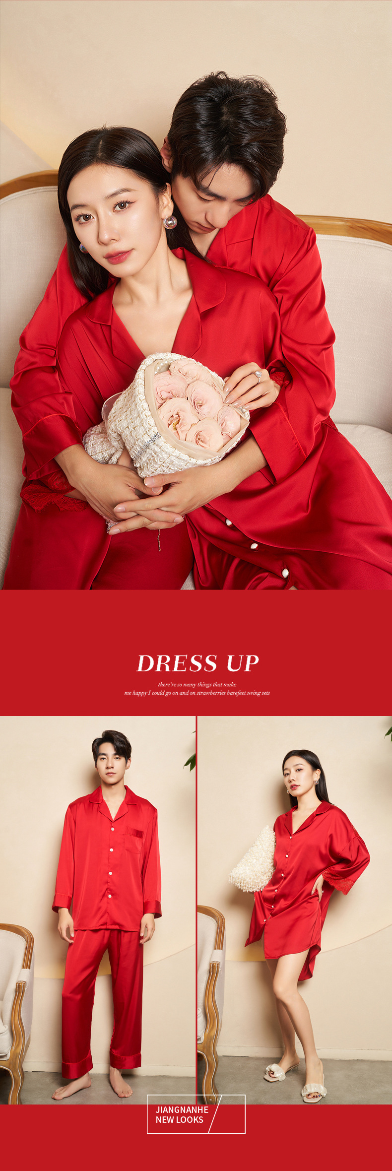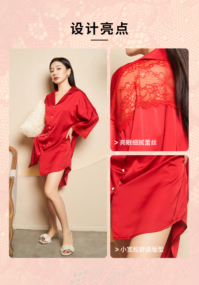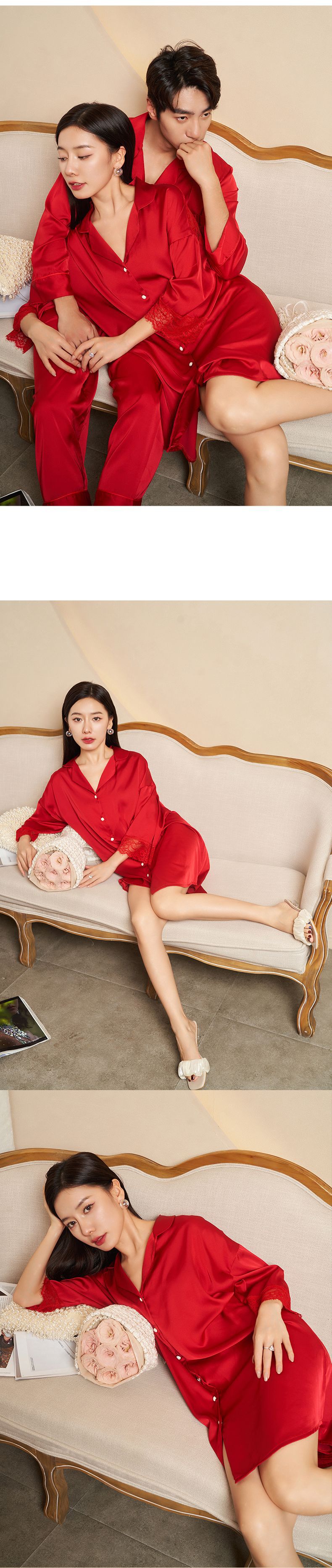 Jiangnan wo 2023 봄 새싹 실크 속이 빈 잠옷 커플 빨간 긴 소매 잠옷 얼음 실크 가정 옷의 세대 세트스토어 가기
