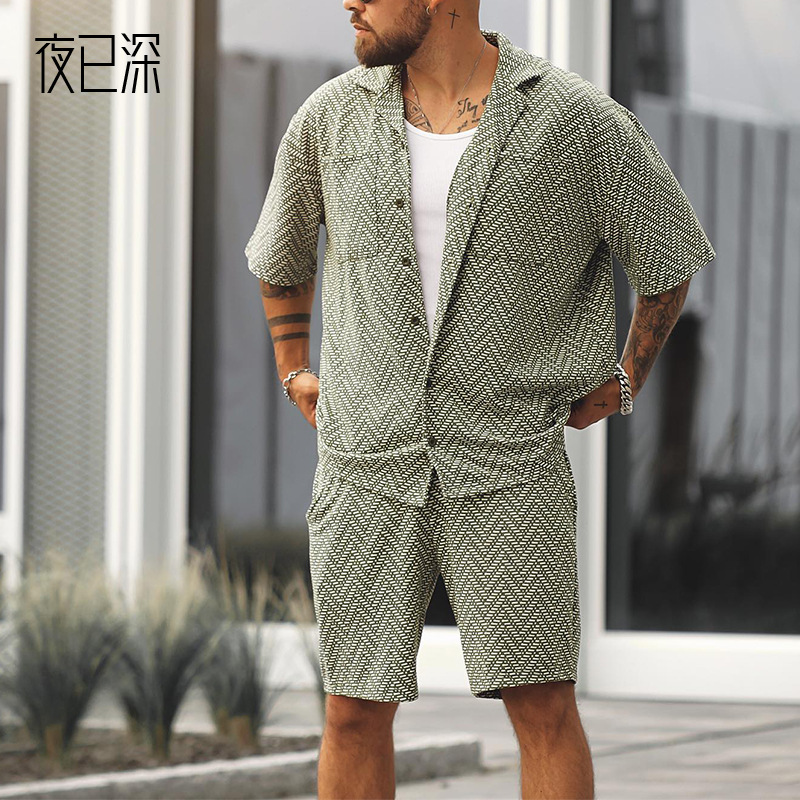 欧美跨境2025新款热卖休闲男士套装宽松翻领短袖长裤潮流男装套装