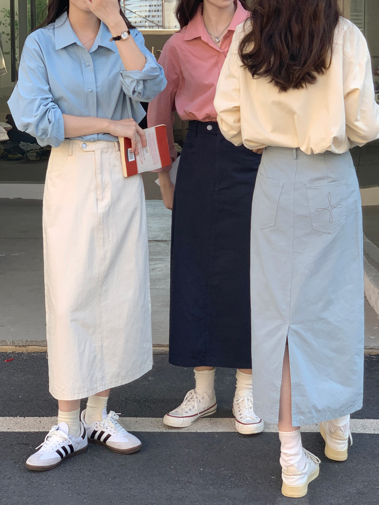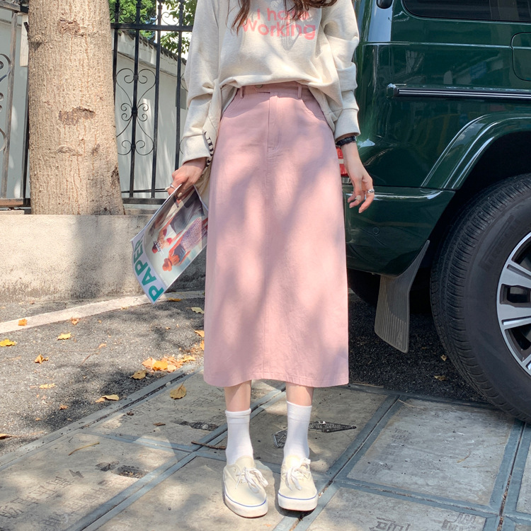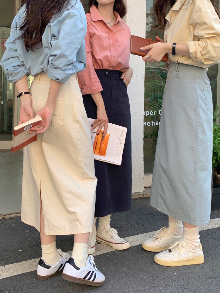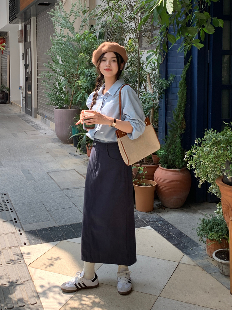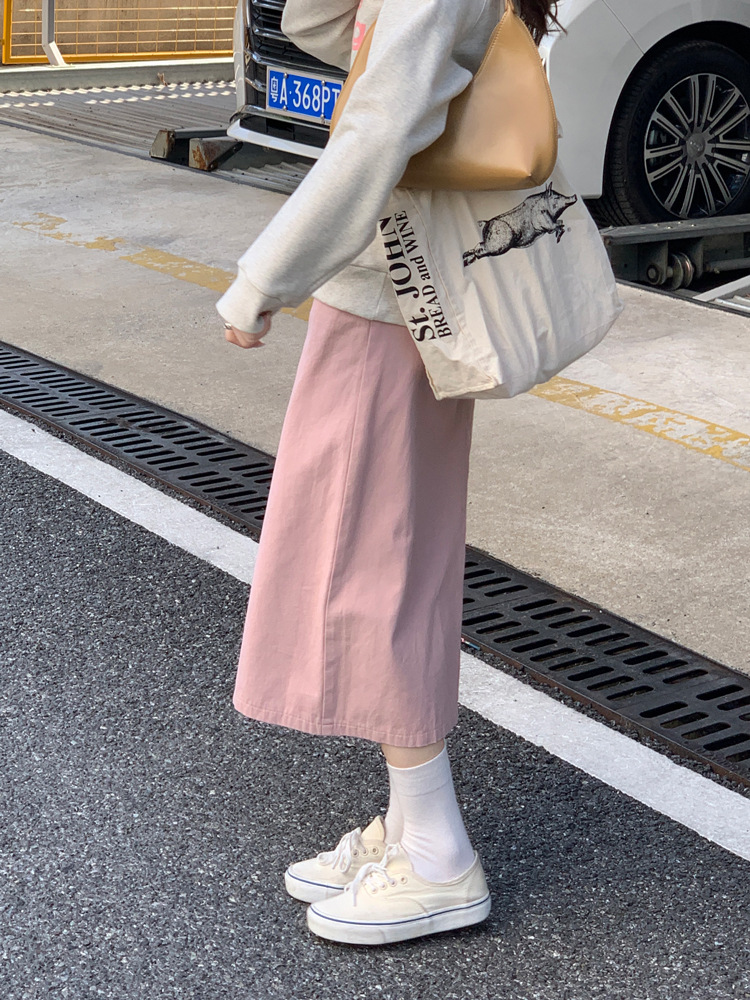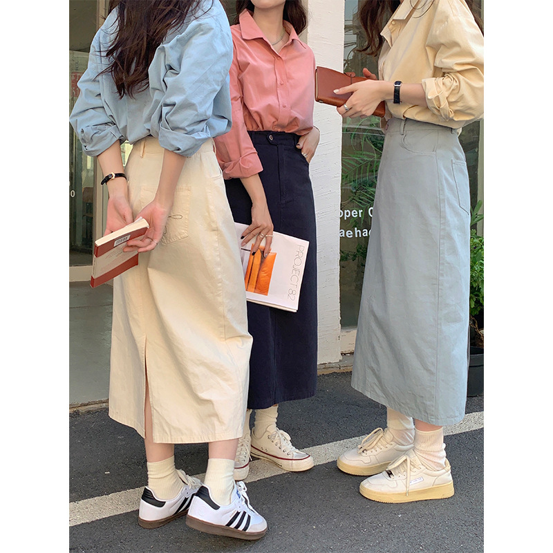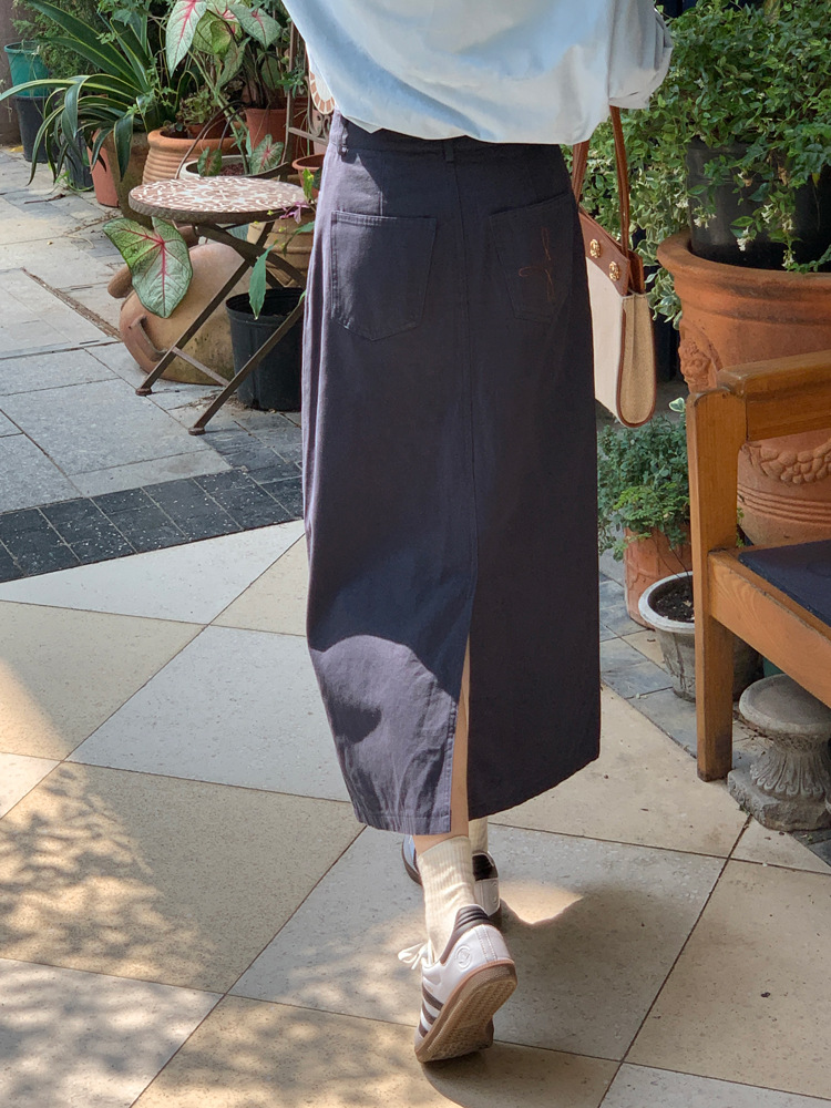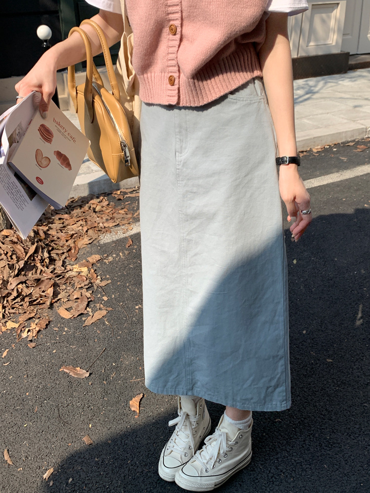 리얼 샷 2023 디자인 센스 리어 스플릿 스트레이트 스커트 여성용 초봄 하이 웨이스트 슬리밍 미드 길이 원 스텝 스커트스토어 가기