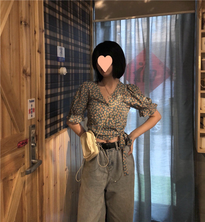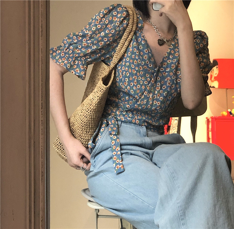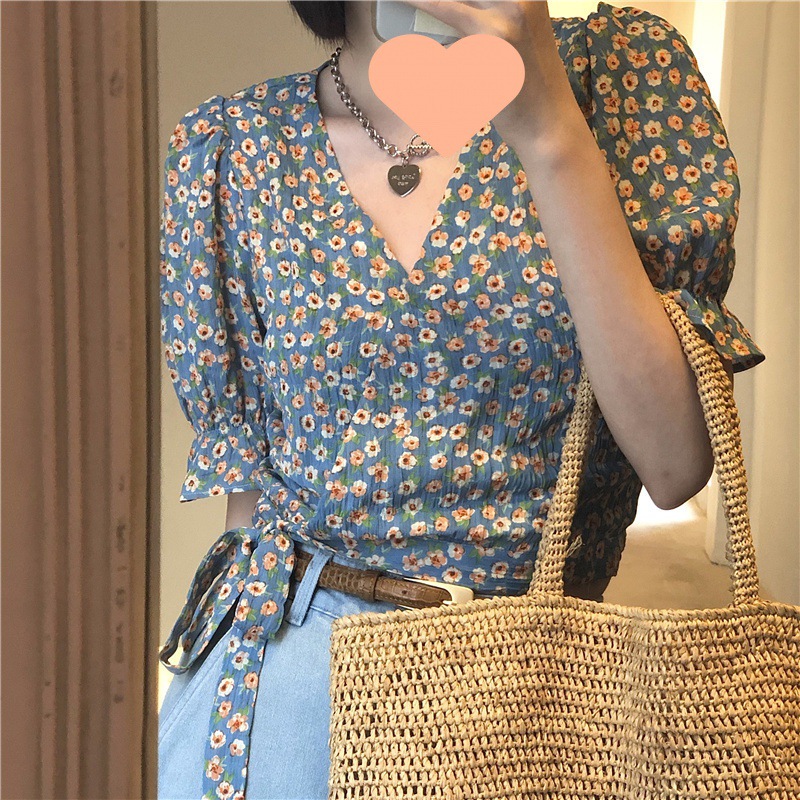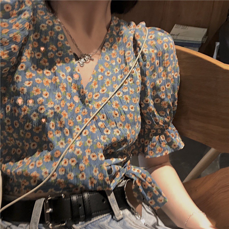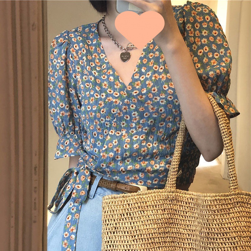 한국 스타일 꽃 셔츠 여성용 쉬폰 셔츠 여성 여름 느슨한 짧은 V-목 새 스타일 퍼프 소매 높은 허리 칼라 꽃 셔츠스토어 가기