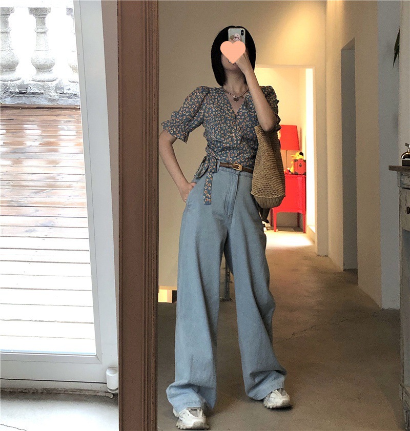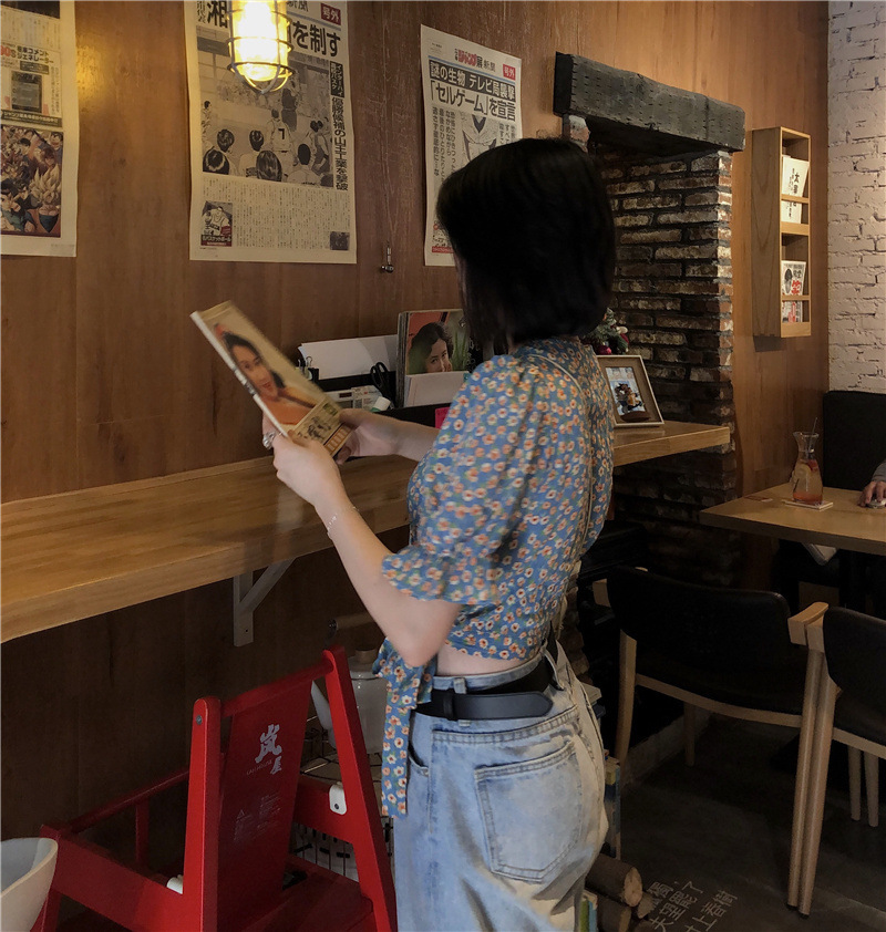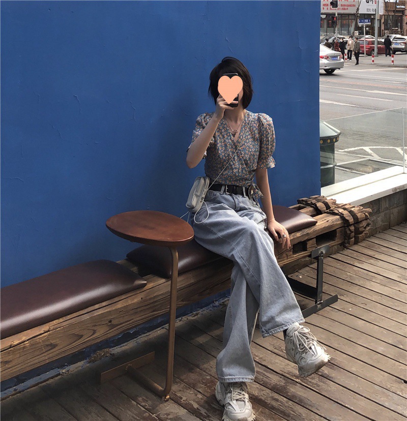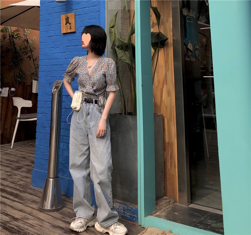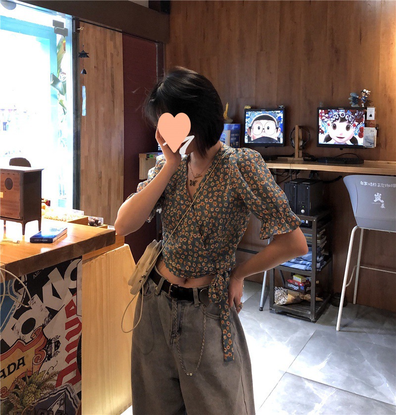 한국 스타일 꽃 셔츠 여성용 쉬폰 셔츠 여성 여름 느슨한 짧은 V-목 새 스타일 퍼프 소매 높은 허리 칼라 꽃 셔츠스토어 가기