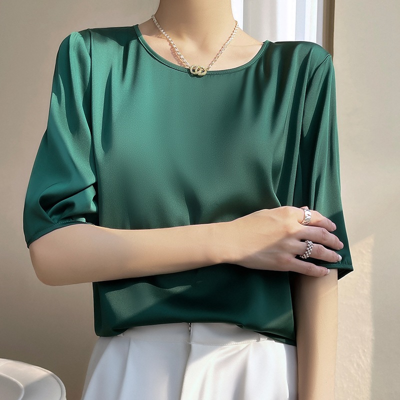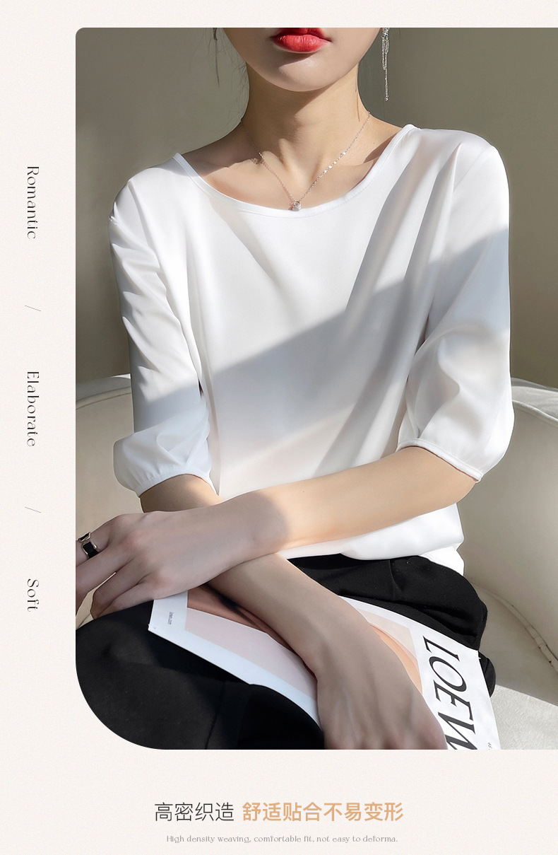 봄과 여름 얇은 실크 탑 여성의 둥근 목 반 소매 느슨한 새틴 반 소매 흑백 기질베이스 짧은 소매스토어 가기