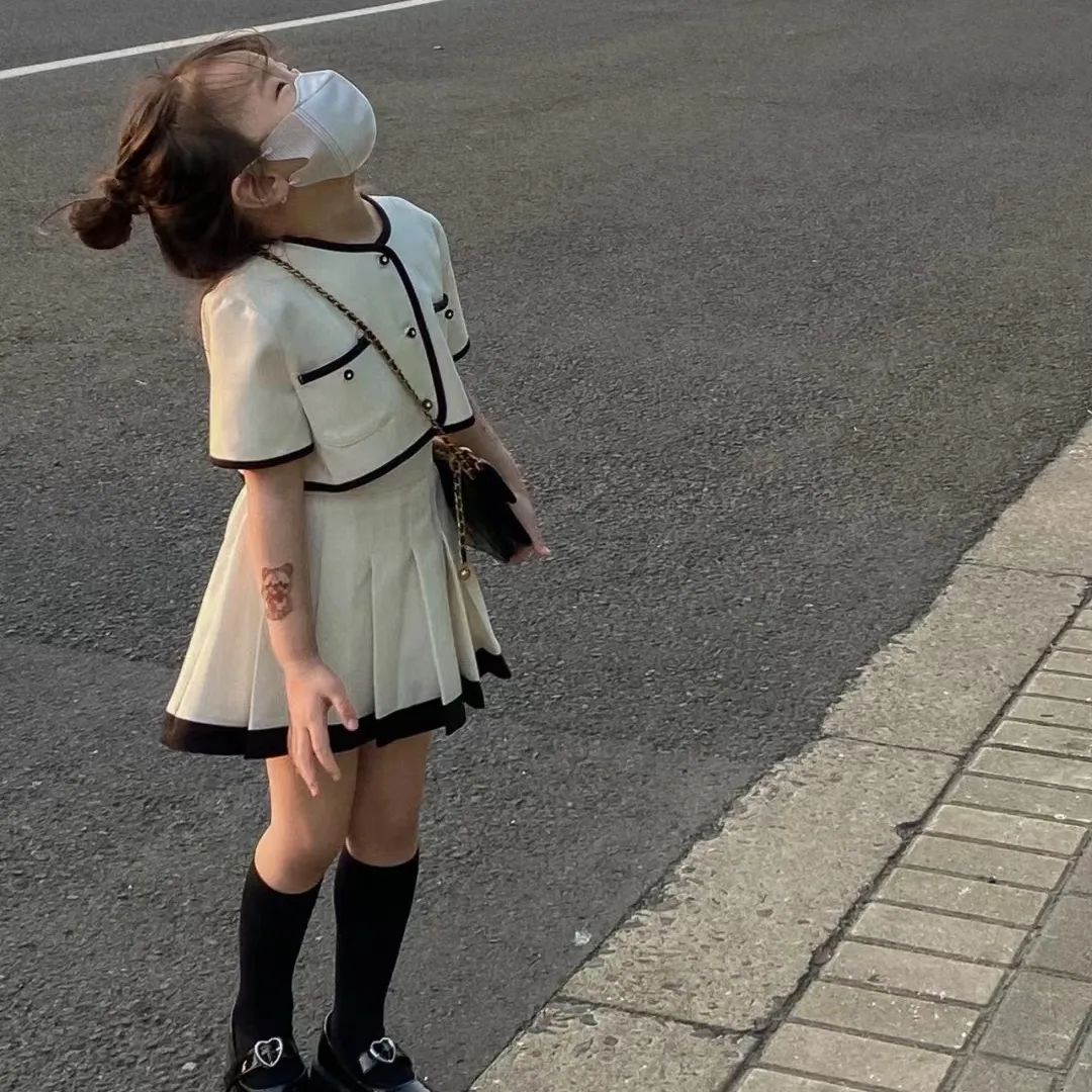 77138 여자 여름 새로운 스타일 샤넬 스타일 세트 여자의 단색 투피스 어린이 반팔 탑 플리츠 스커트스토어 가기