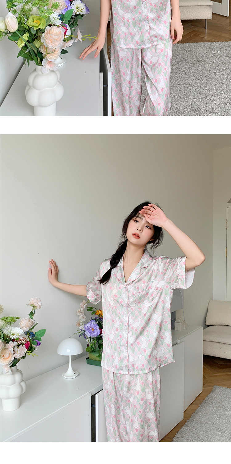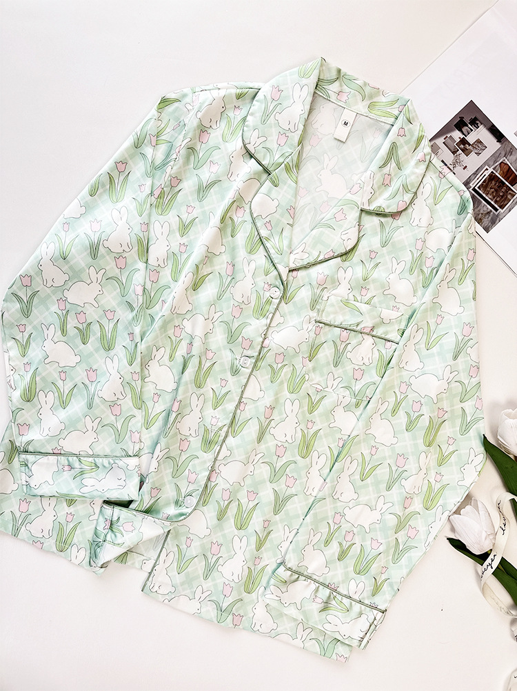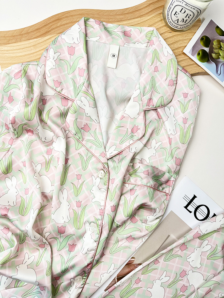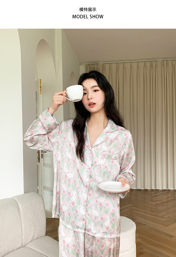 튤립 토끼 잠옷 여성 달콤한 소녀 얼음 실크 새틴 가정 옷 긴 소매 2023 봄 여름 얇은