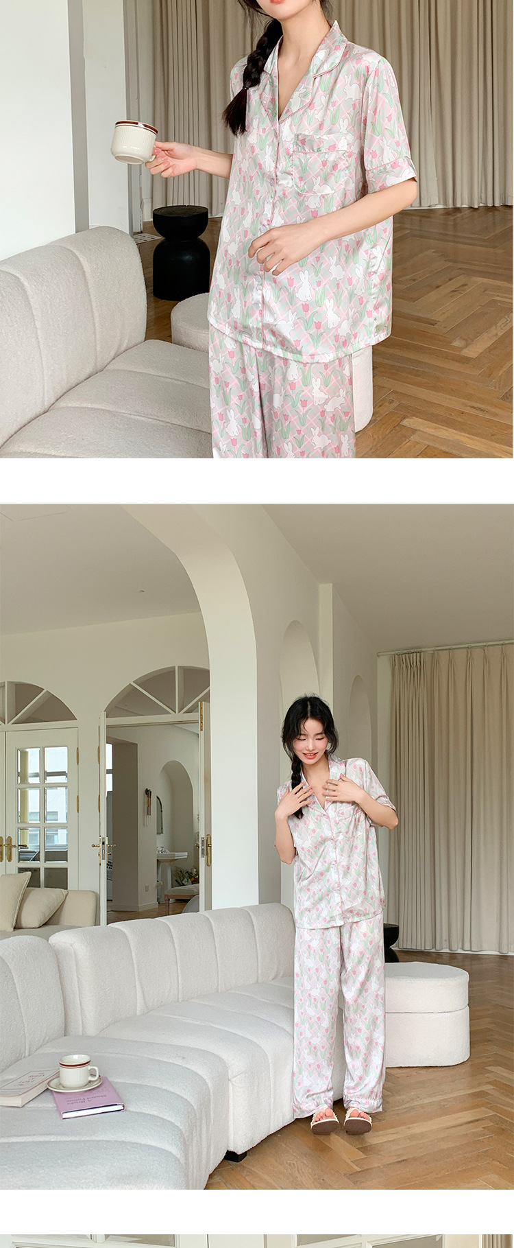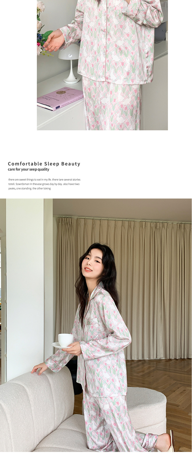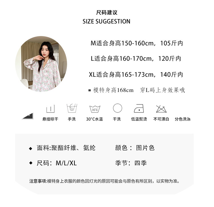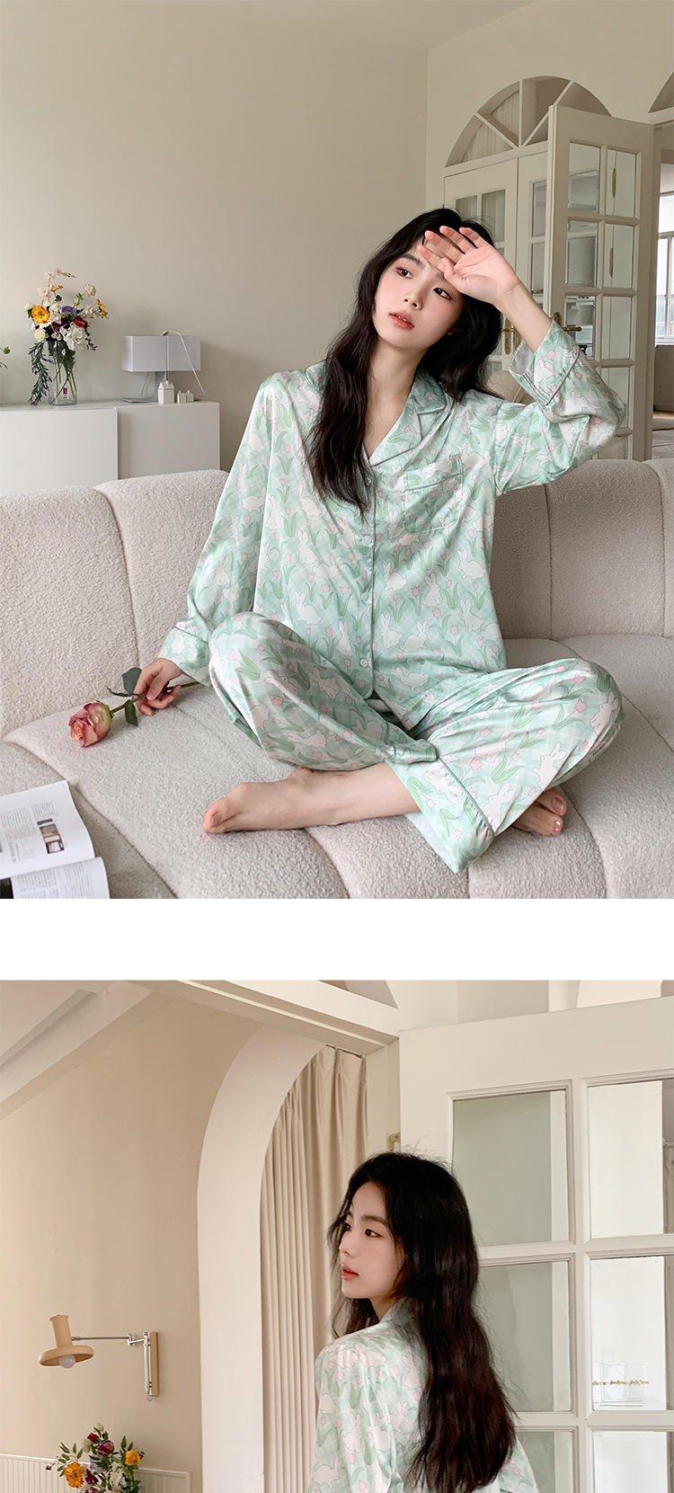 튤립 토끼 잠옷 여성 달콤한 소녀 얼음 실크 새틴 가정 옷 긴 소매 2023 봄 여름 얇은스토어 가기