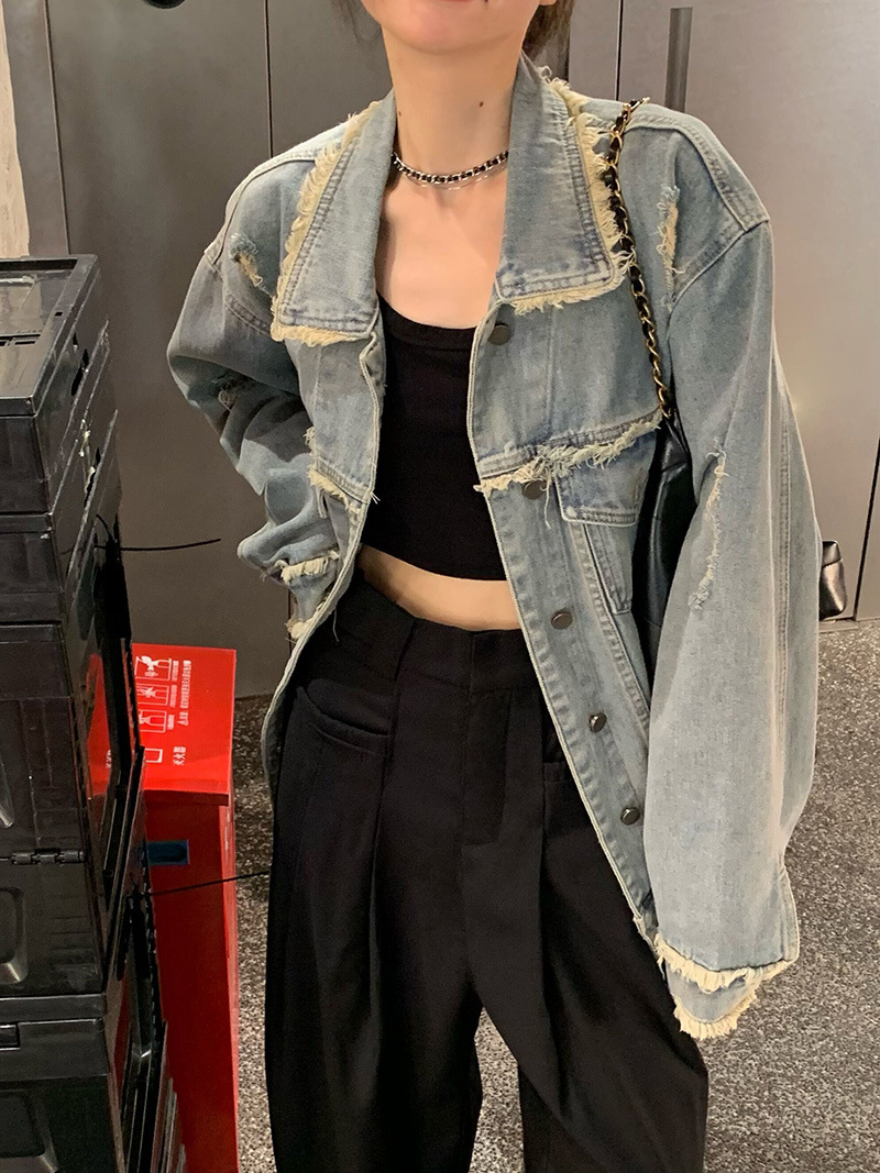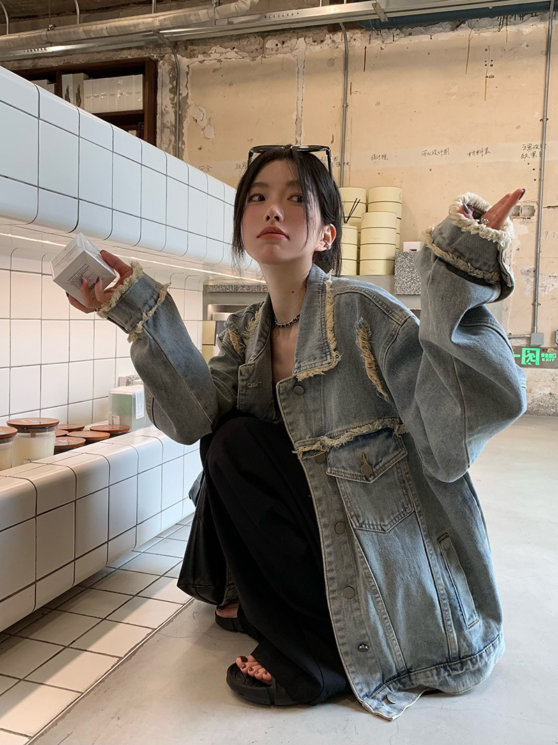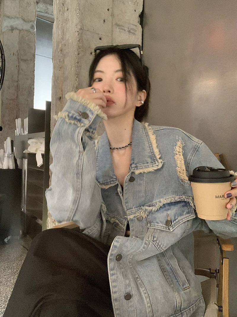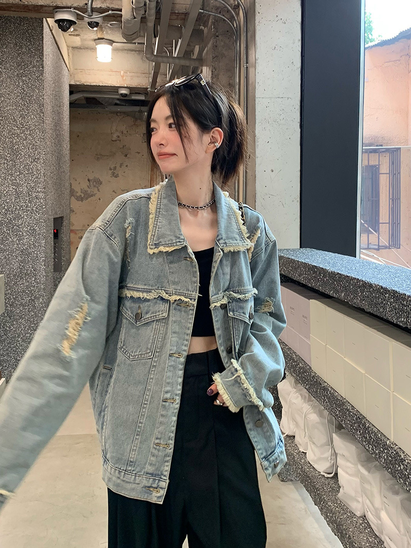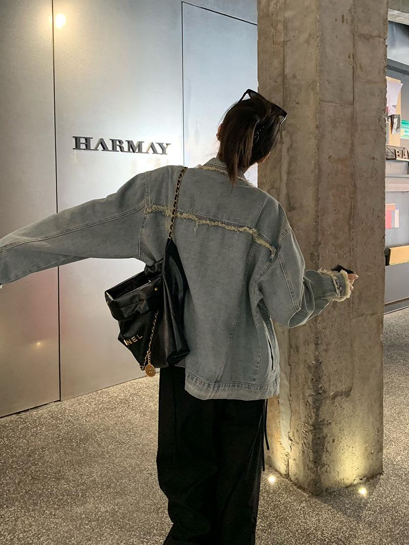 빈티지 버 에지 디스트레스드 데님 코트 여성의 봄과 가을 느슨한 캐주얼 모든 매치 작업복 긴팔 재킷 탑 트렌디 인스토어 가기