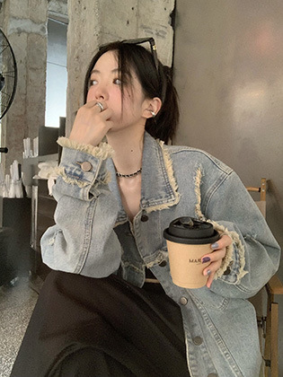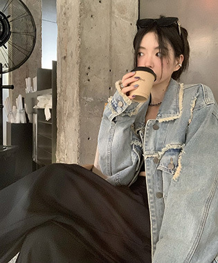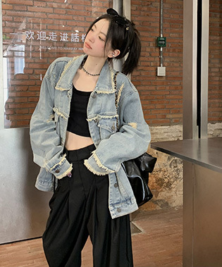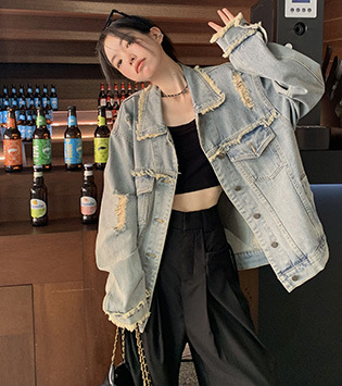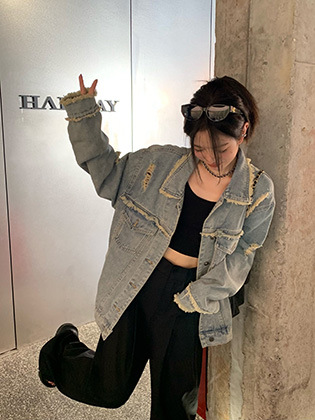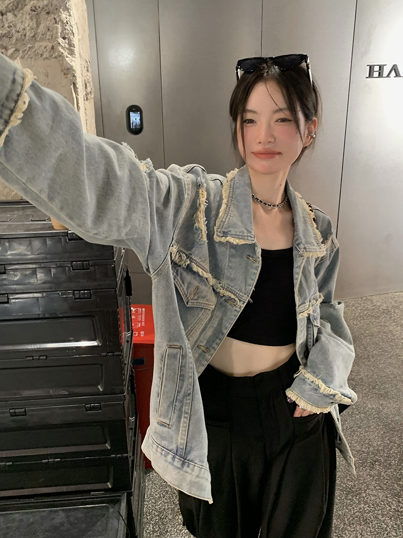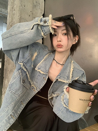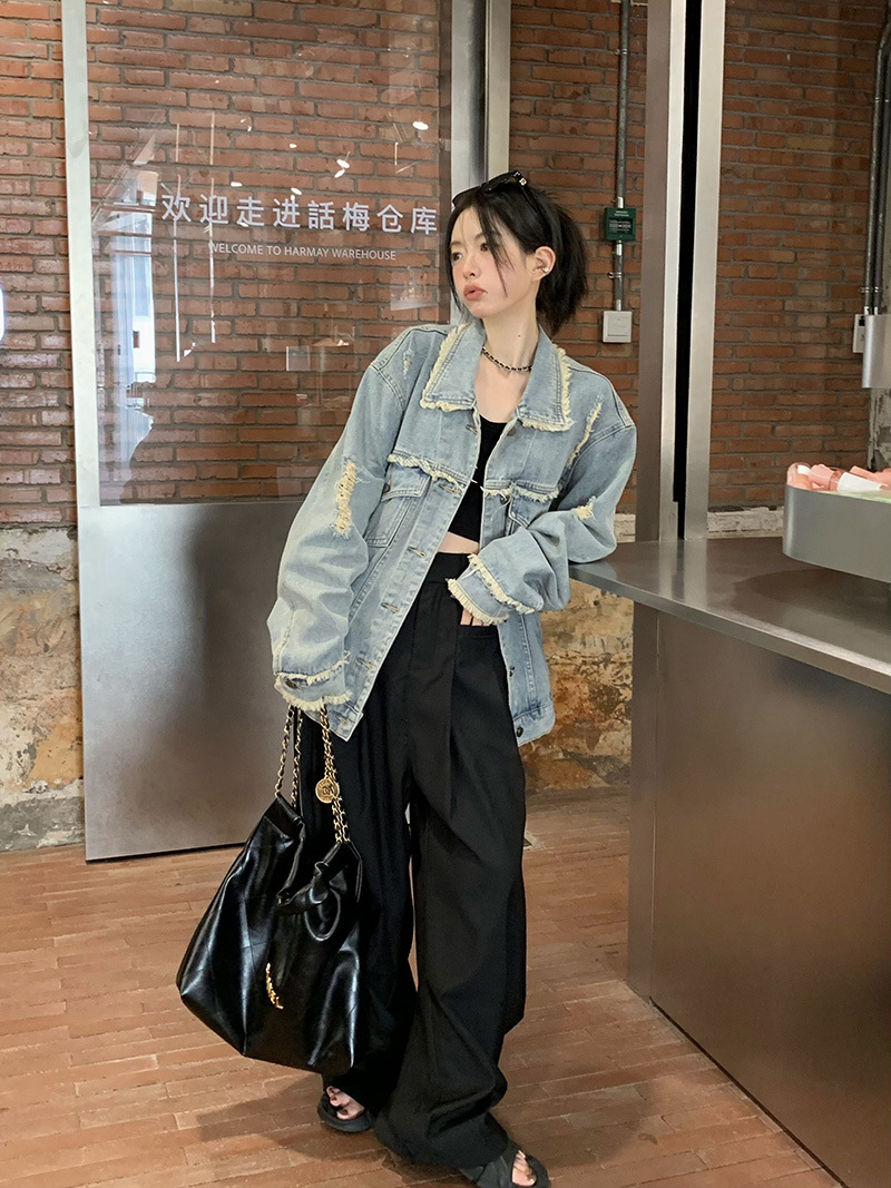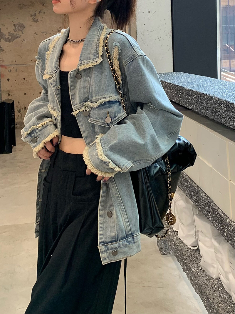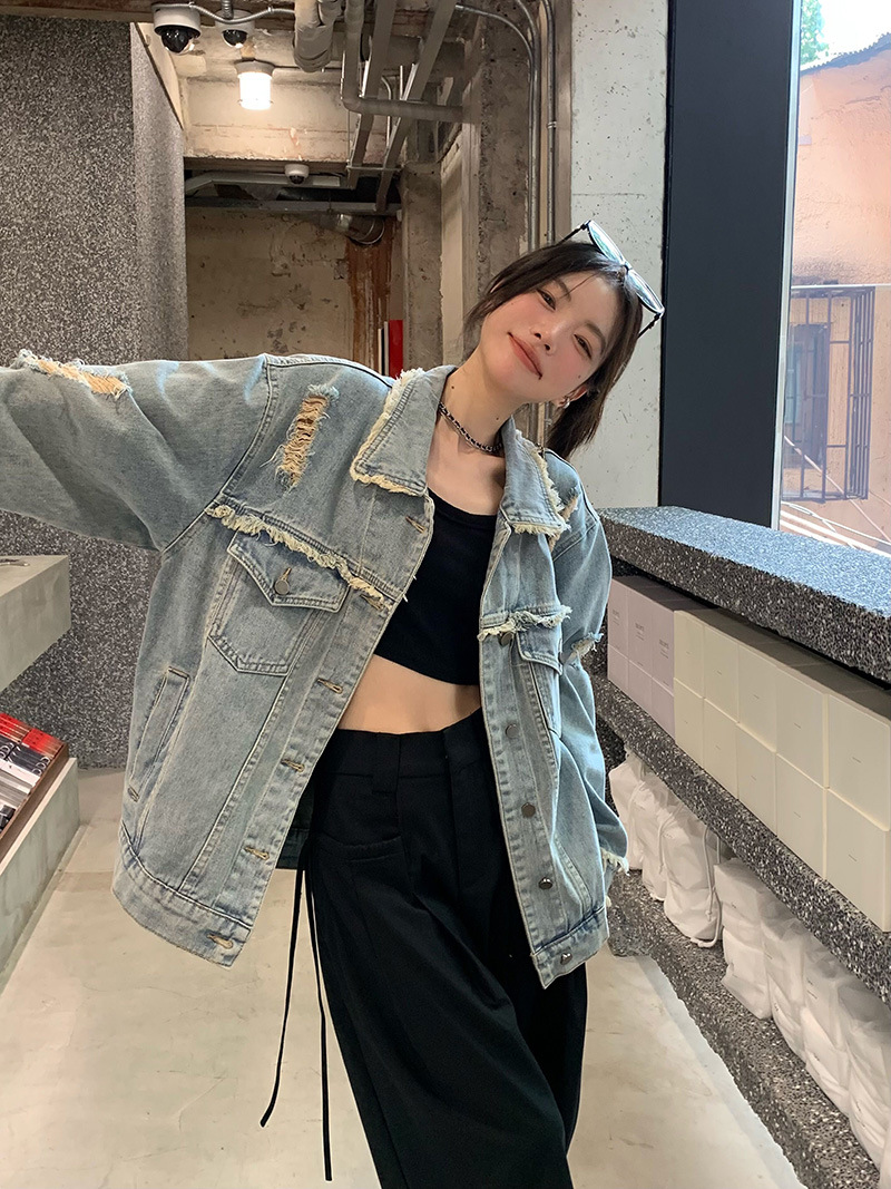 빈티지 버 에지 디스트레스드 데님 코트 여성의 봄과 가을 느슨한 캐주얼 모든 매치 작업복 긴팔 재킷 탑 트렌디 인스토어 가기