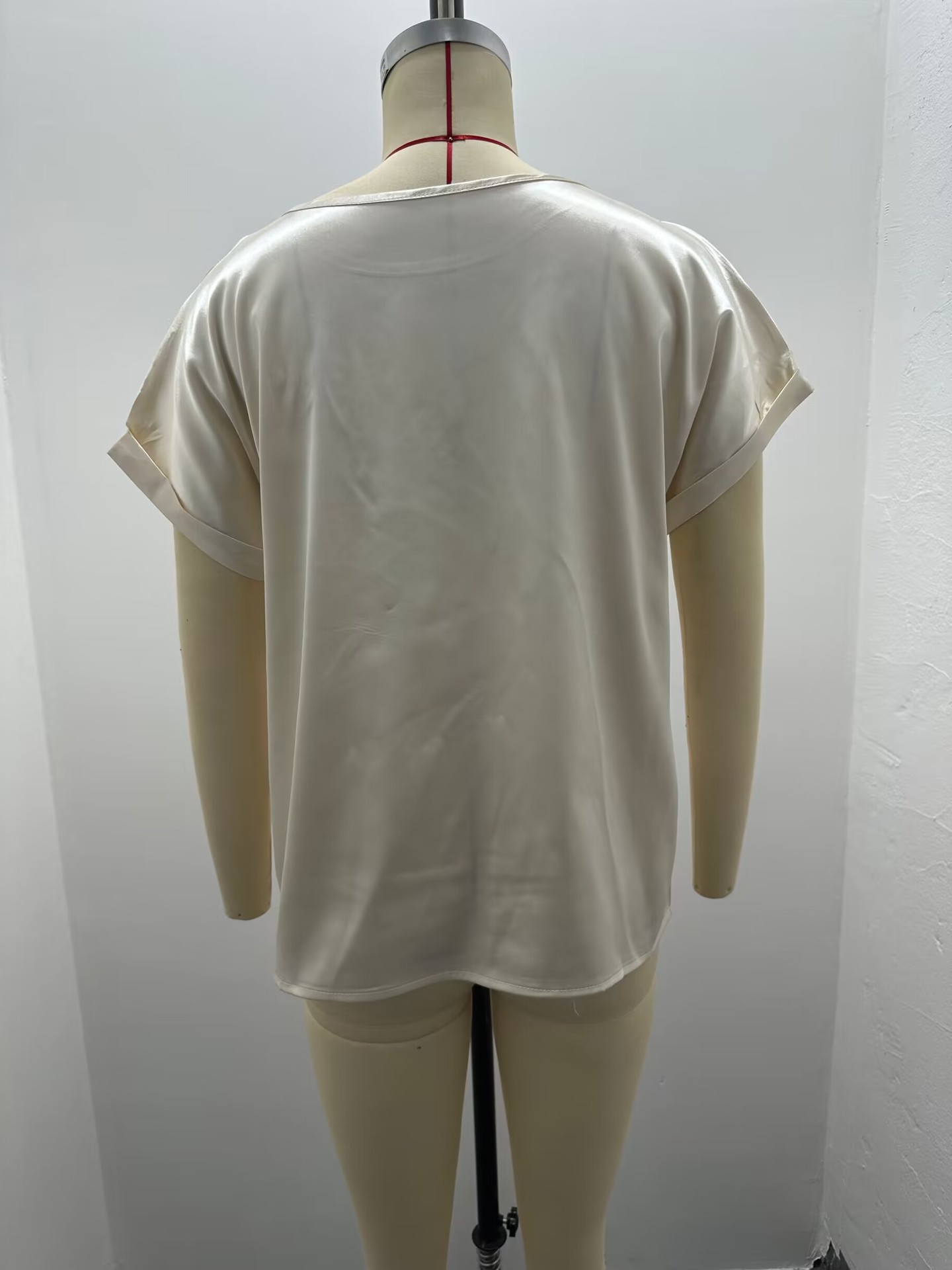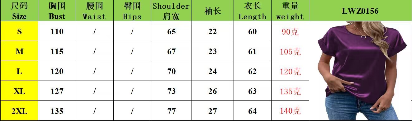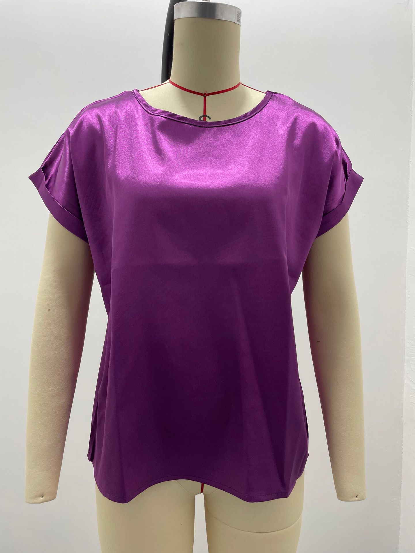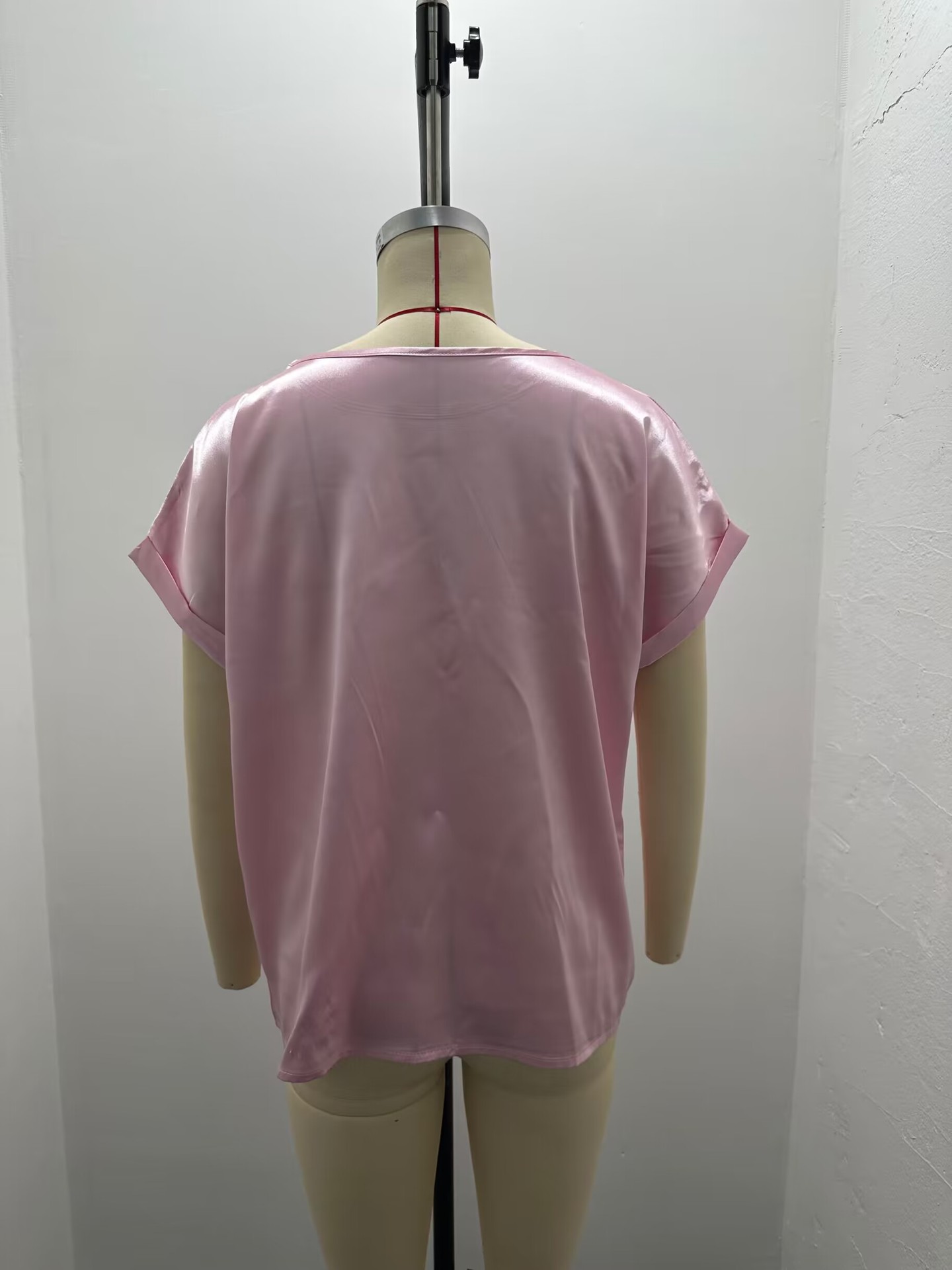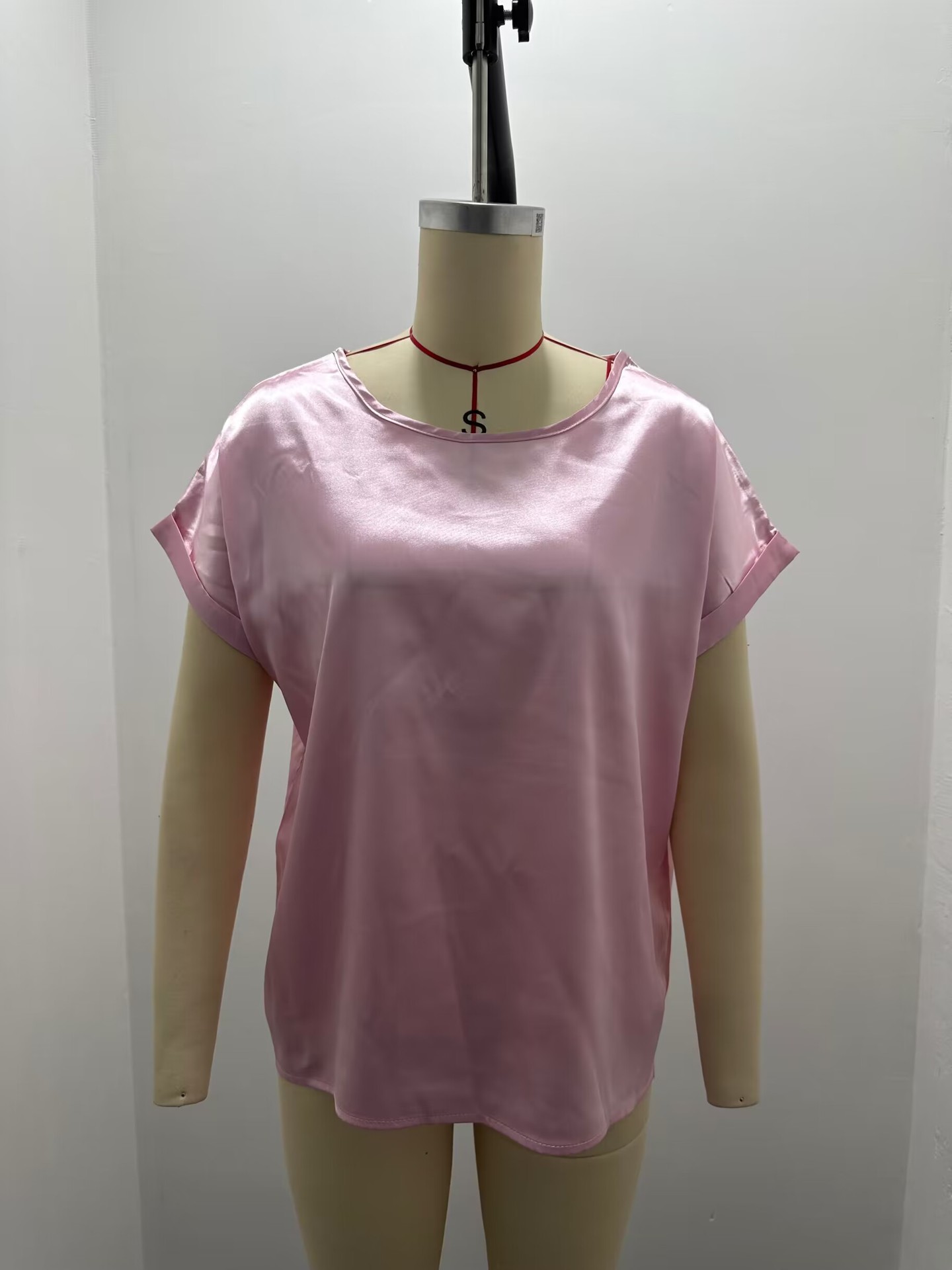2025년 아мазон 봄/여름 신상 여성용 반팔 새틴 셔츠 루즈핏 캐주얼 라운드넥 새틴 티셔츠