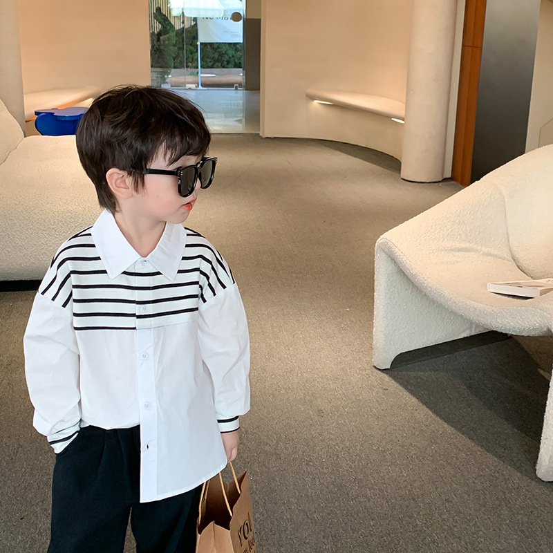 어린이 톱 소년 소녀 2024 봄 잘 생긴 올매치 스트라이프 셔츠 아기 루즈 옷깃 대비 컬러 셔츠 트렌디스토어 가기
