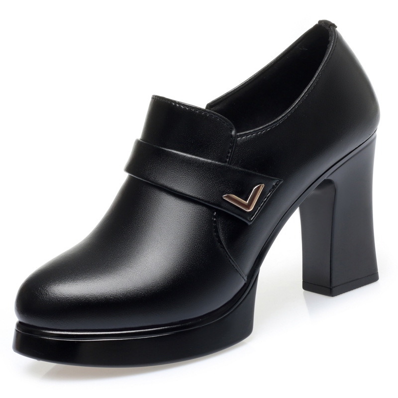 중년 여성용 가죽 신발 부드러운 가죽 미드 힐 두꺼운 밑창 단일 레이어 신발 봄과 가을 여성 어머니 신발 두꺼운 뒤꿈치 검은 작업 신발
