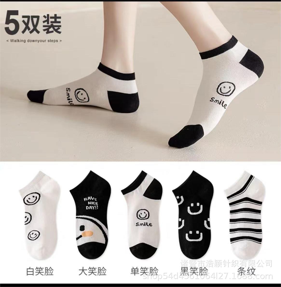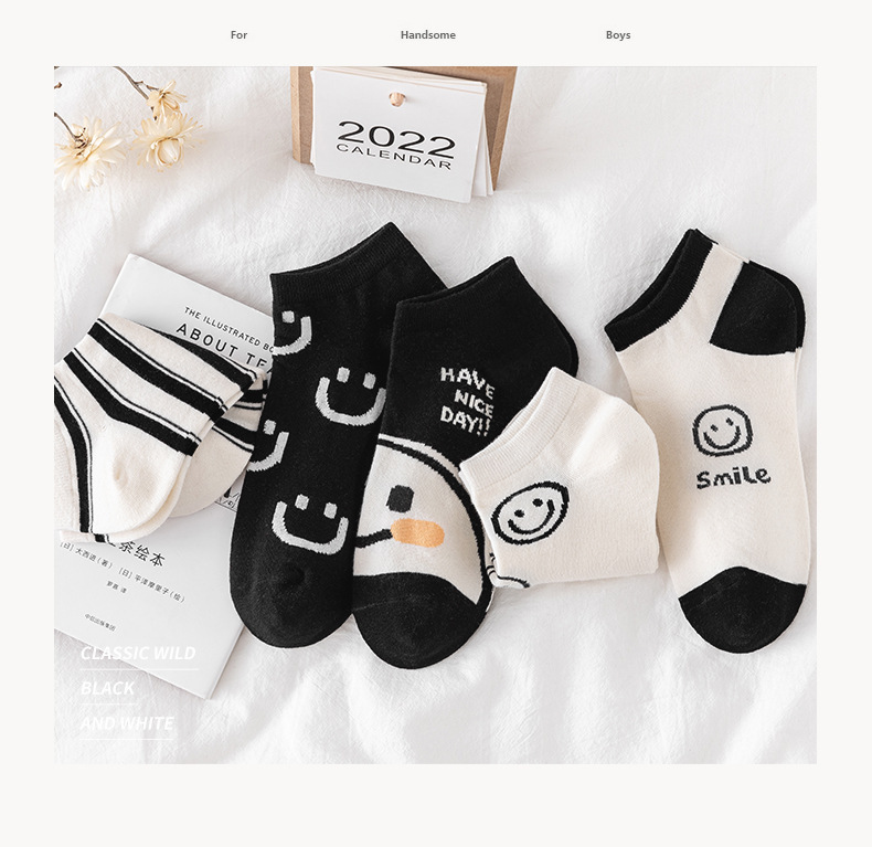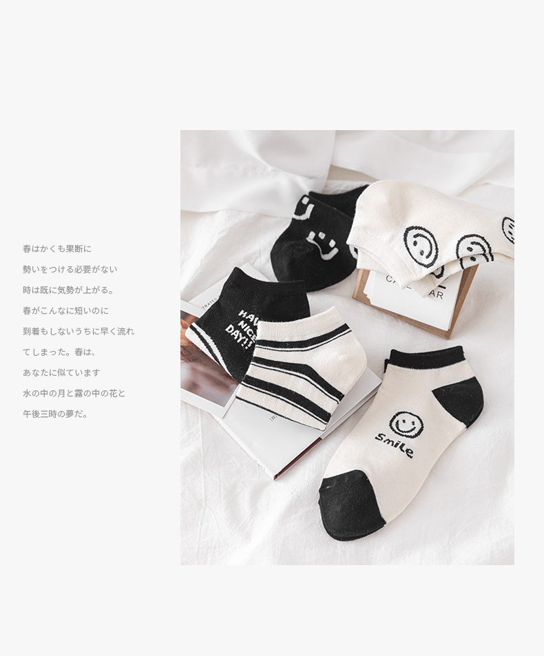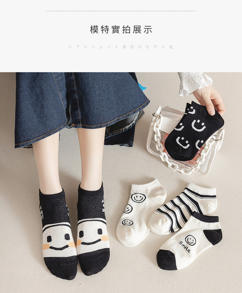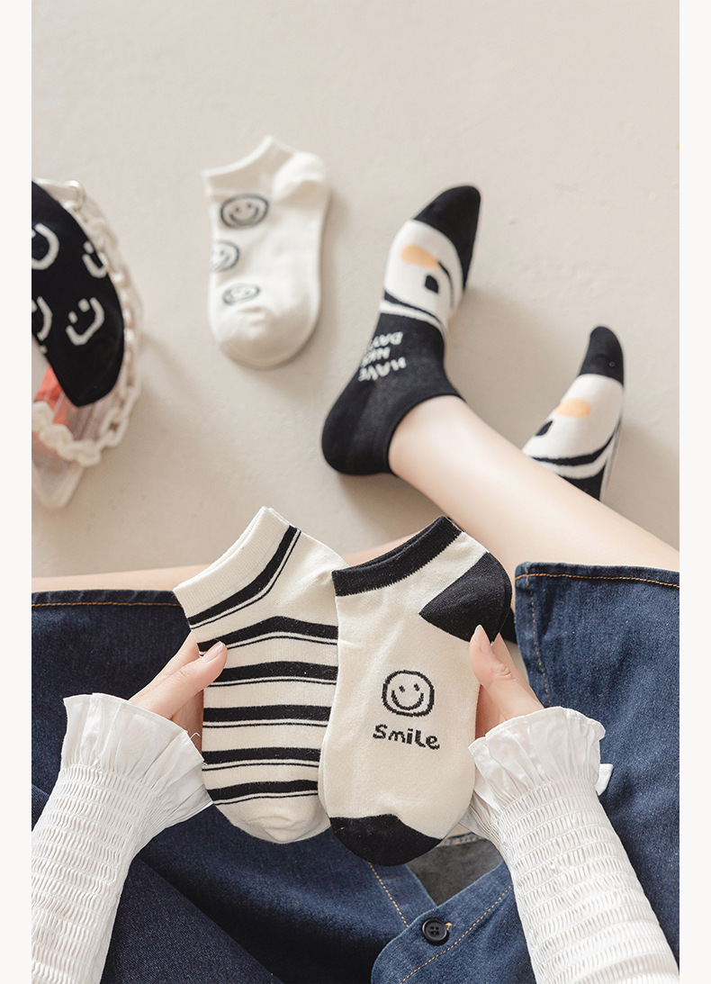 새로운 흑백 스마일 페이스 양말 여성 스포츠 n 조수 짧은 양말 봄과 가을면 양말 만화 모든 경기 그물 인기 조수 양말 얇은