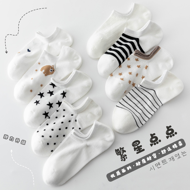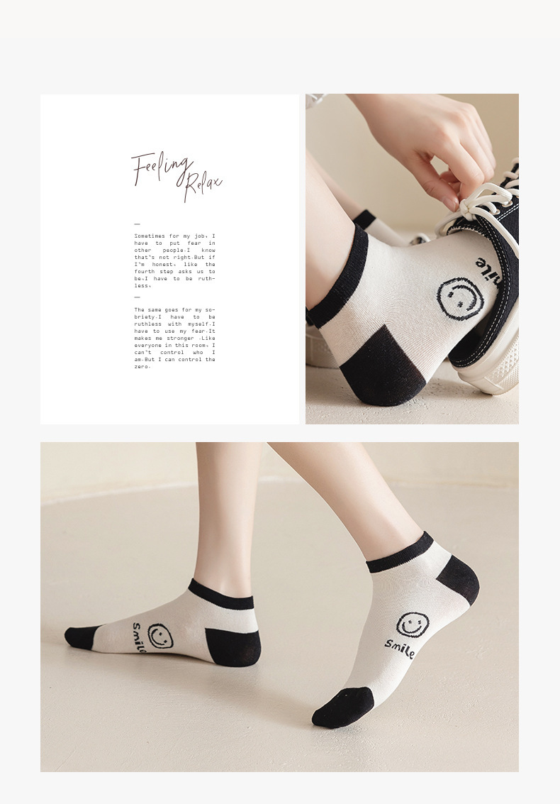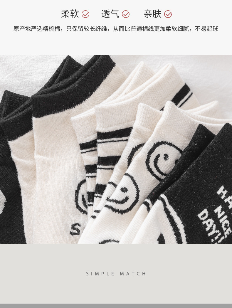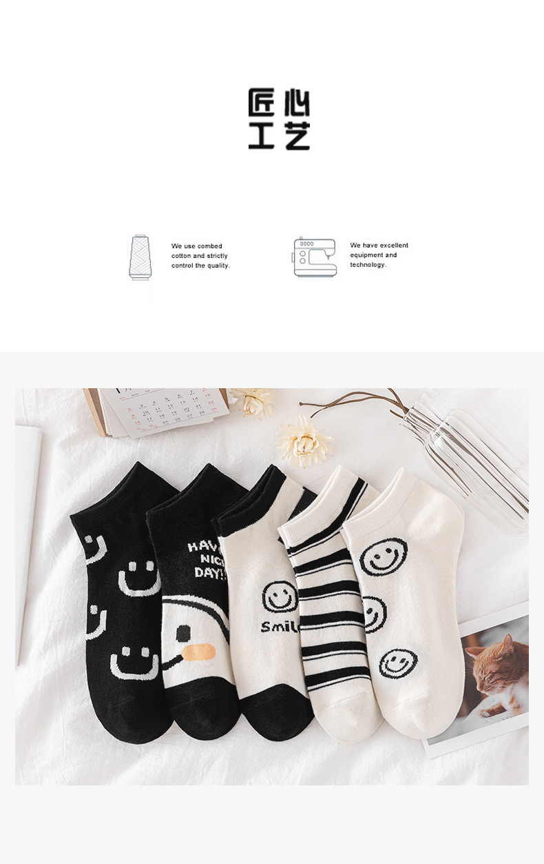 새로운 흑백 스마일 페이스 양말 여성 스포츠 n 조수 짧은 양말 봄과 가을면 양말 만화 모든 경기 그물 인기 조수 양말 얇은
