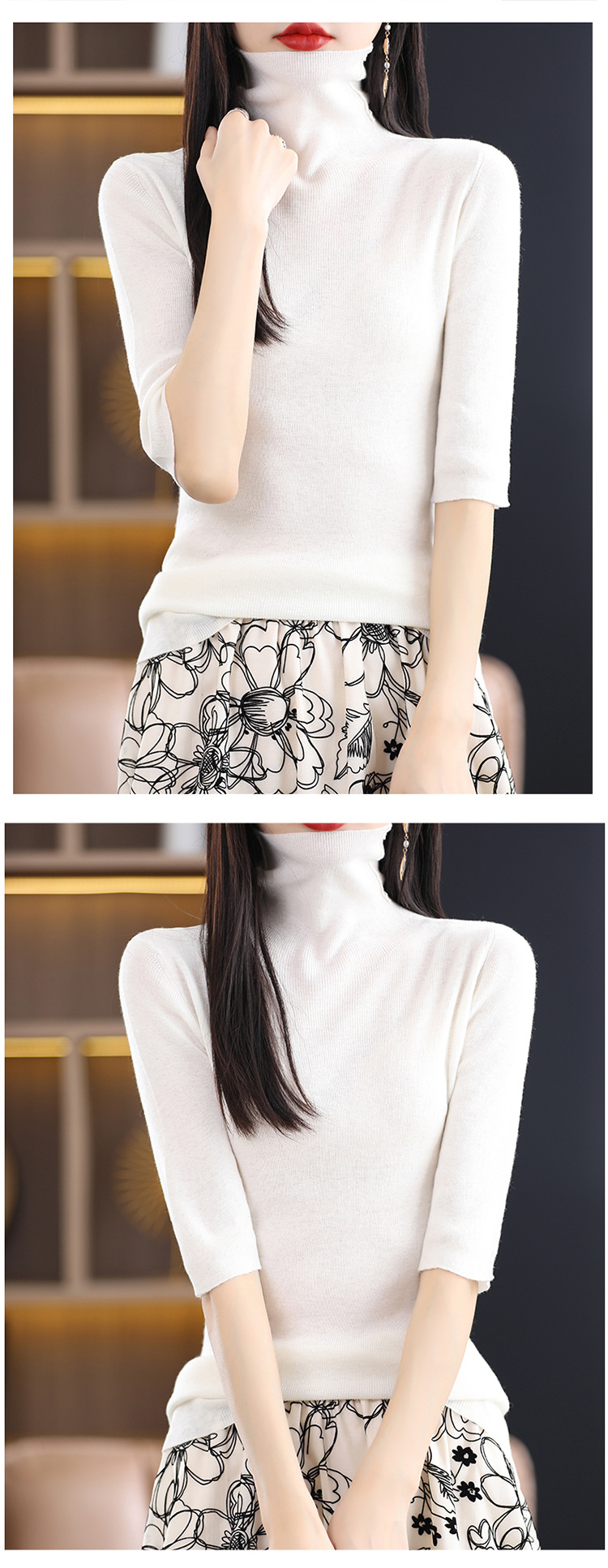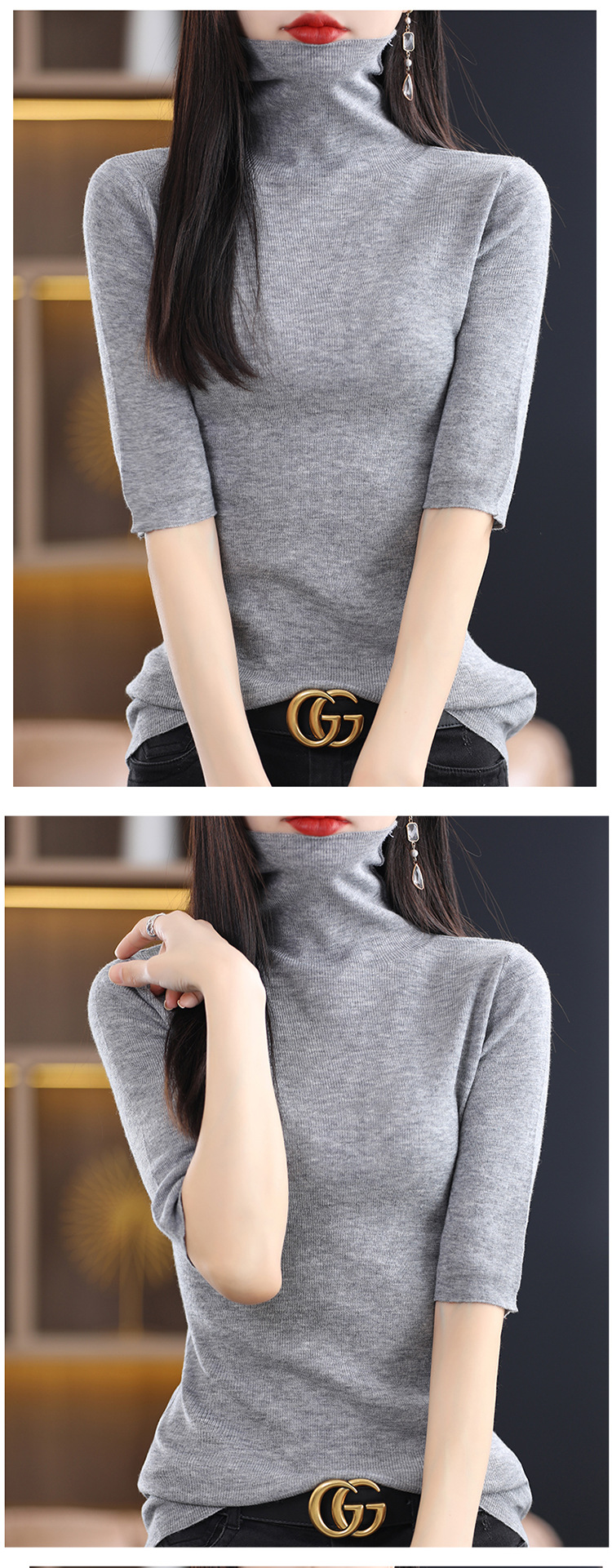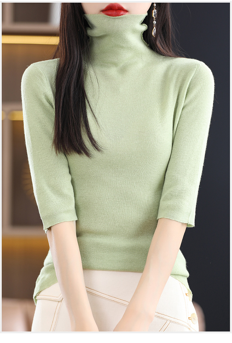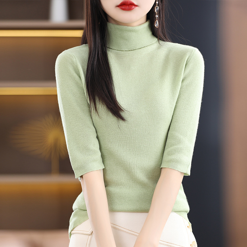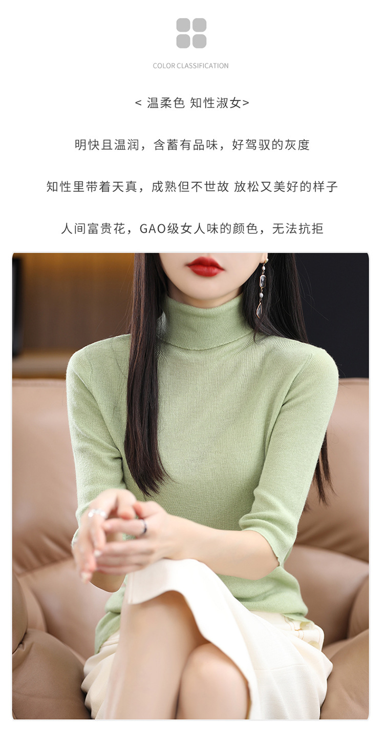 60 초미세 파일 칼라 베이스 셔츠 여성용 슬림핏 중소매 니트 스웨터 터틀넥 봄 뉴 울 반소매 스웨터
