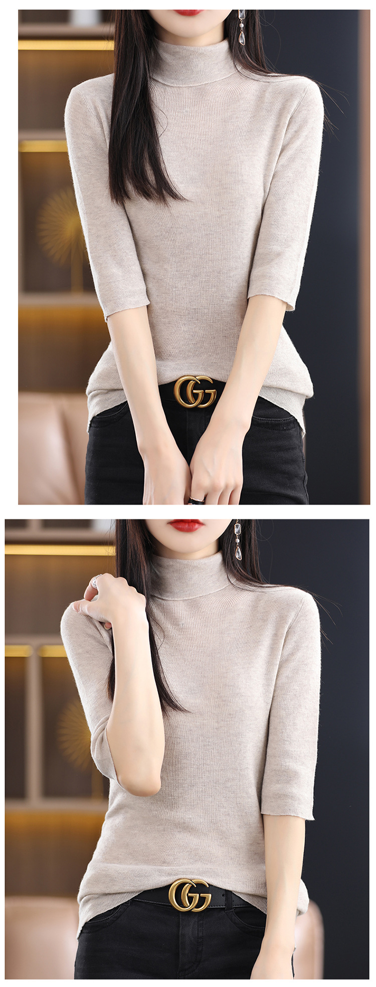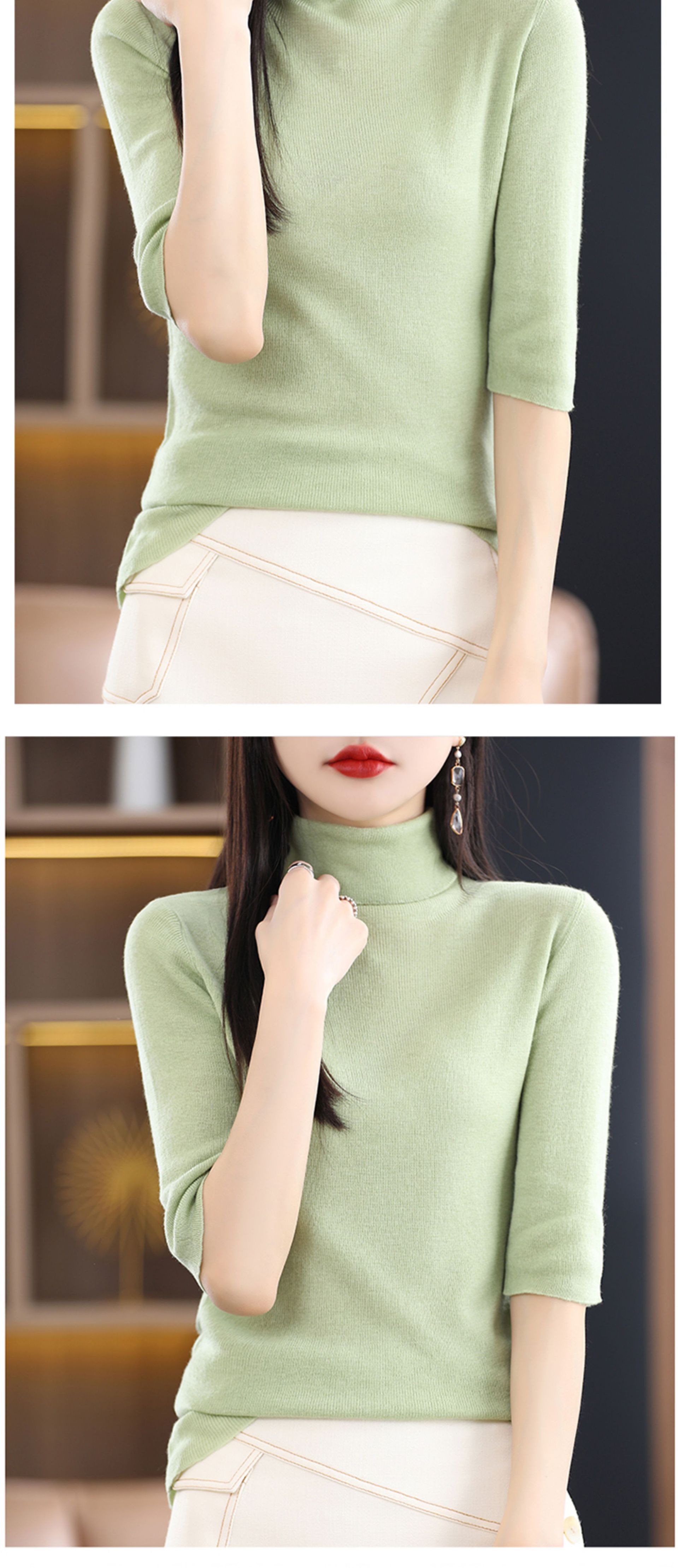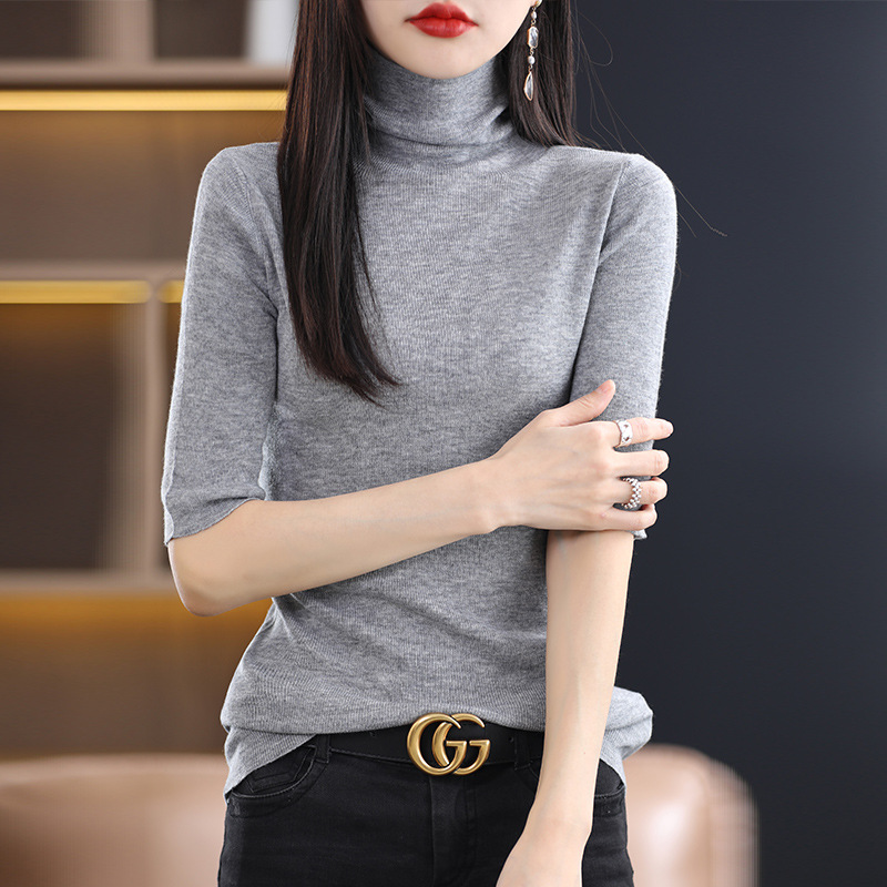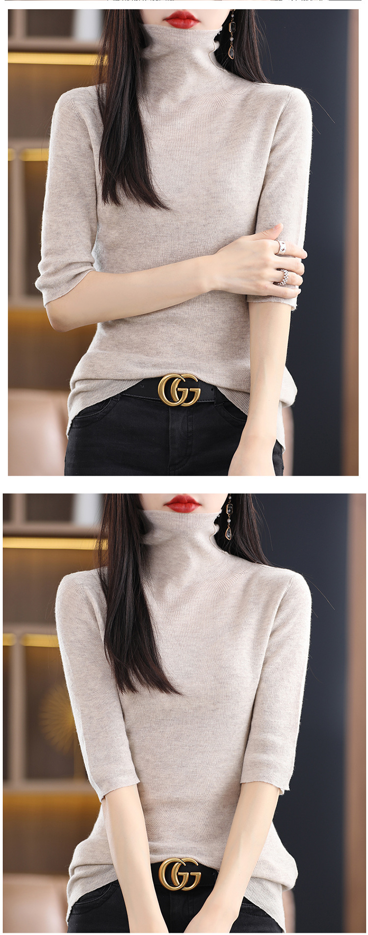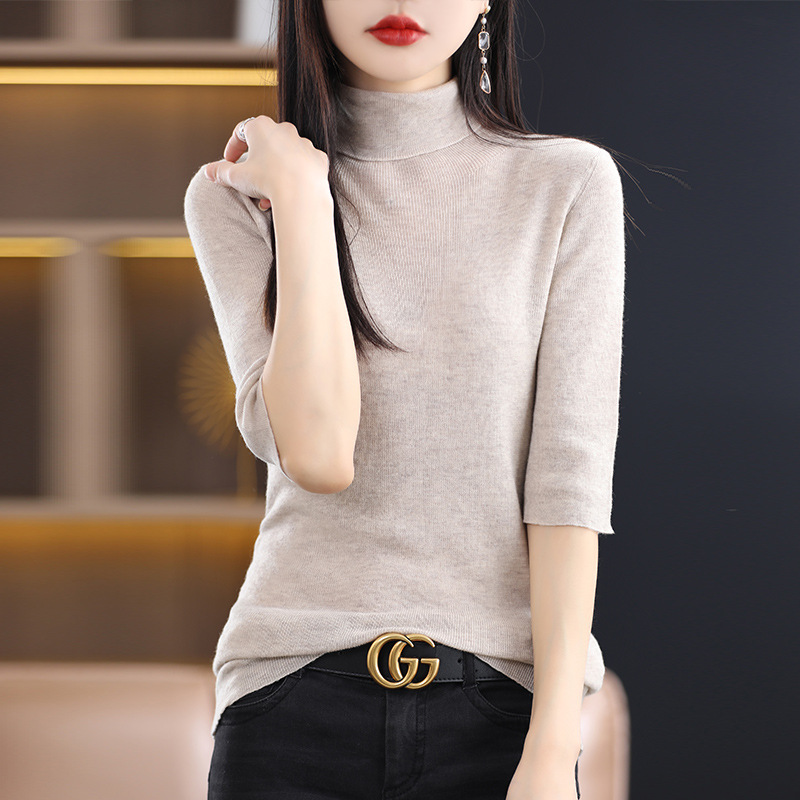 60 초미세 파일 칼라 베이스 셔츠 여성용 슬림핏 중소매 니트 스웨터 터틀넥 봄 뉴 울 반소매 스웨터