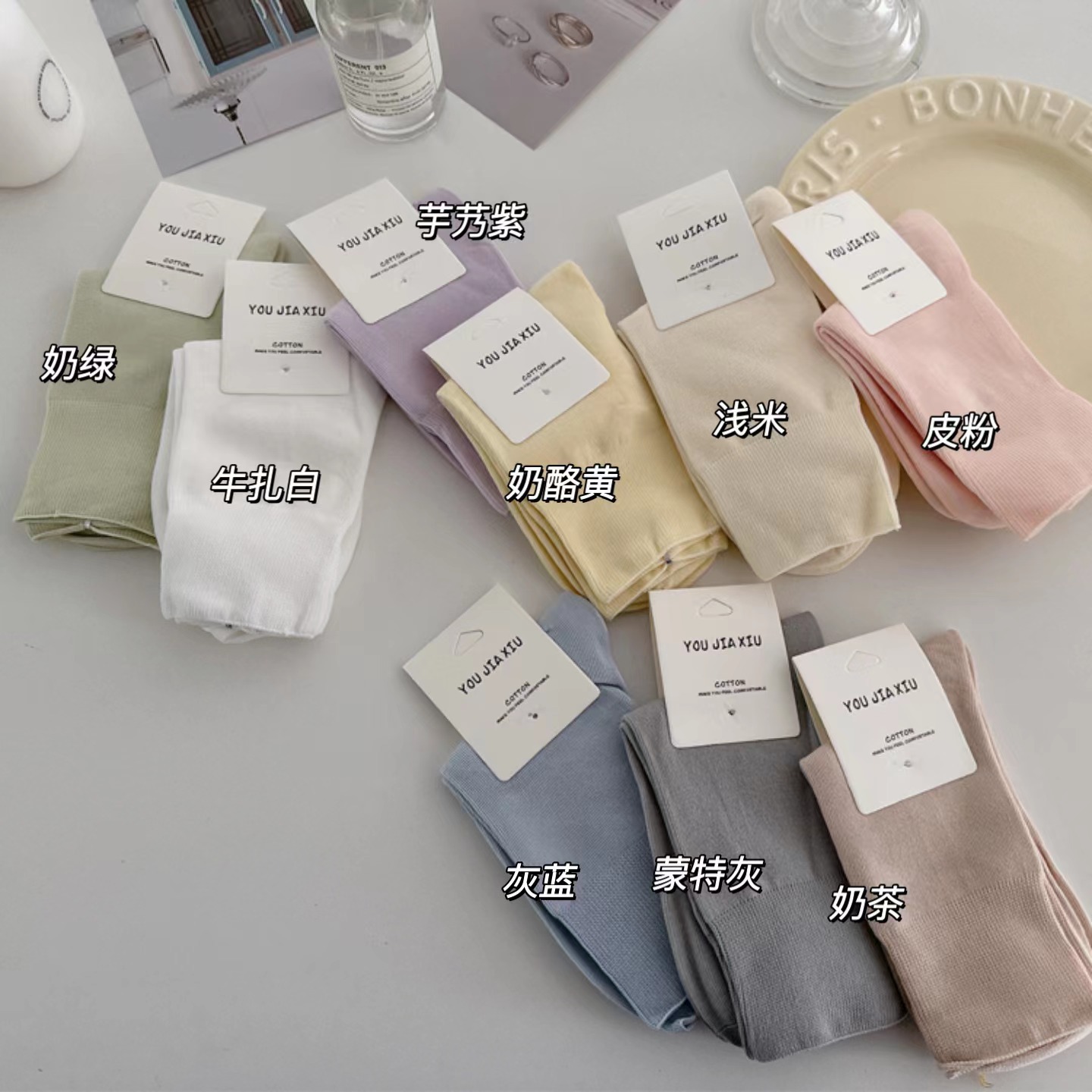 봄과 여름 새로운 in 면 소나무 입 중간 양말 얇은 통기성 여성 양말 캔디 컬러 단색 더미 양말 Sakagiya