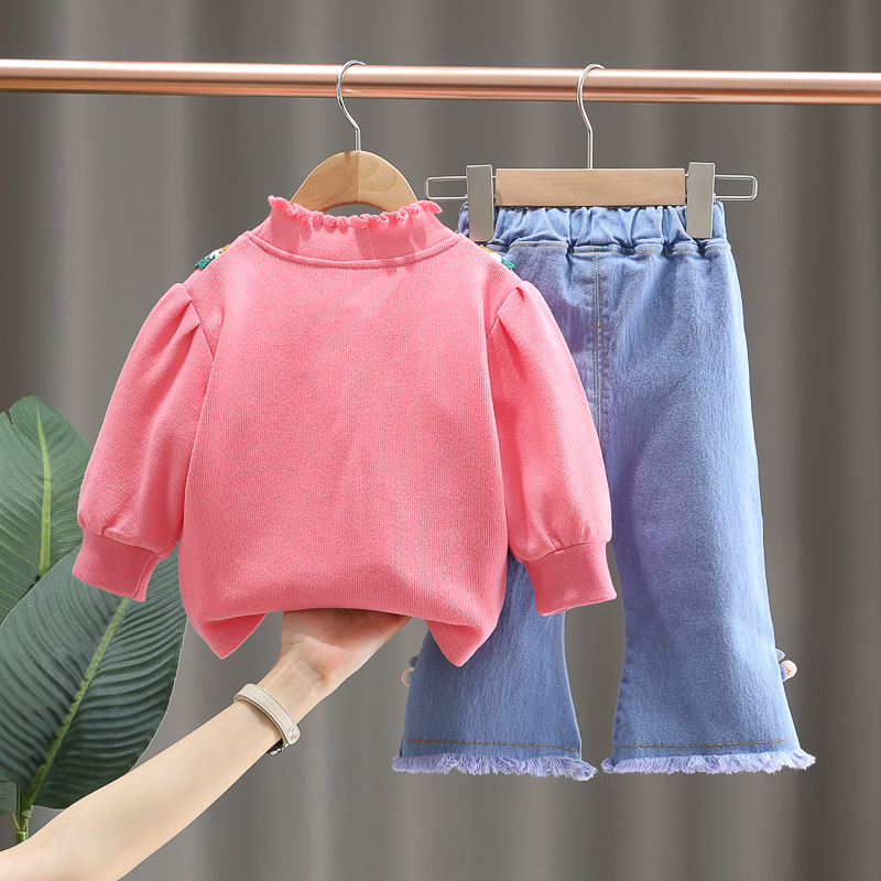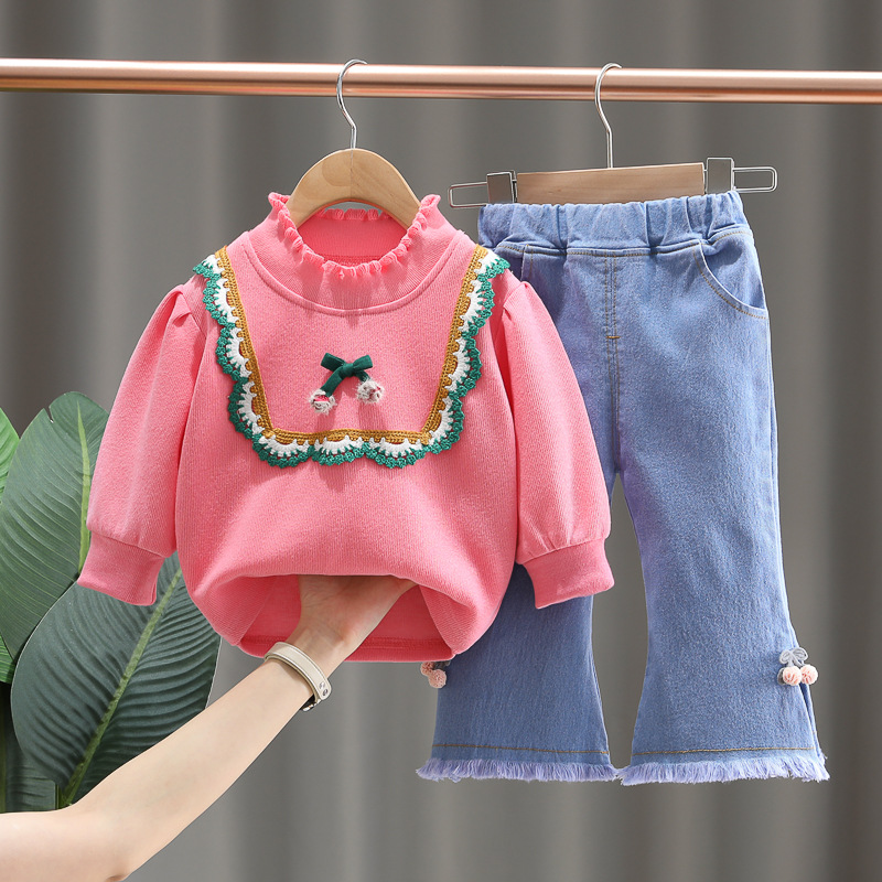 봄 웨스턴 스타일 크로 셰 뜨개질 레이스 여아 투피스 세트 아동 캐주얼 모든 매치 투피스 세트 아기의 봄과 가을 패션 세트스토어 가기