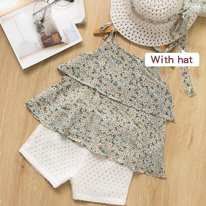 77153 여름 소녀 케이크 꽃 쉬폰 탑 + 속이 빈 흰색 반바지 + 밀짚 모자 3 외국 스타일 세트