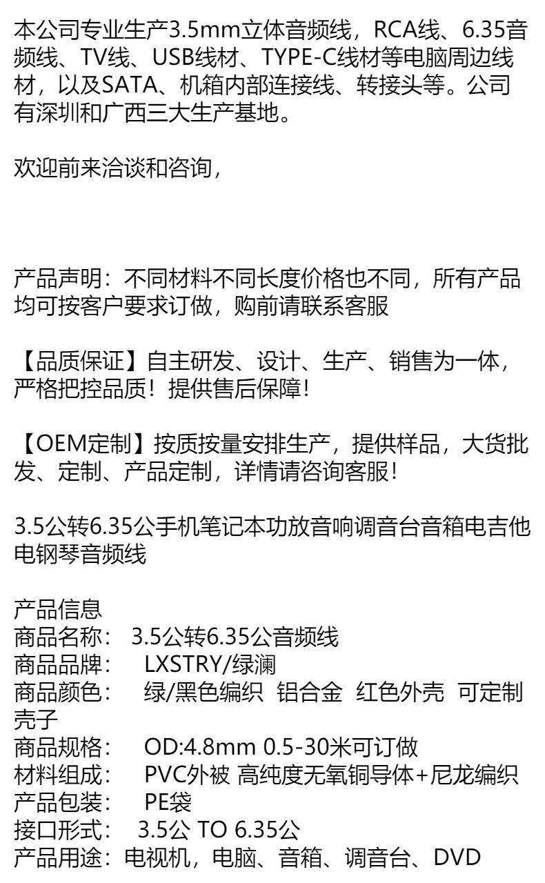 오디오 믹서를 오디오 케이블에 연결하기 위해 3.5 ~ 6.5 대형 3 코어 남성 대 남성 휴대 전화 출력 도매