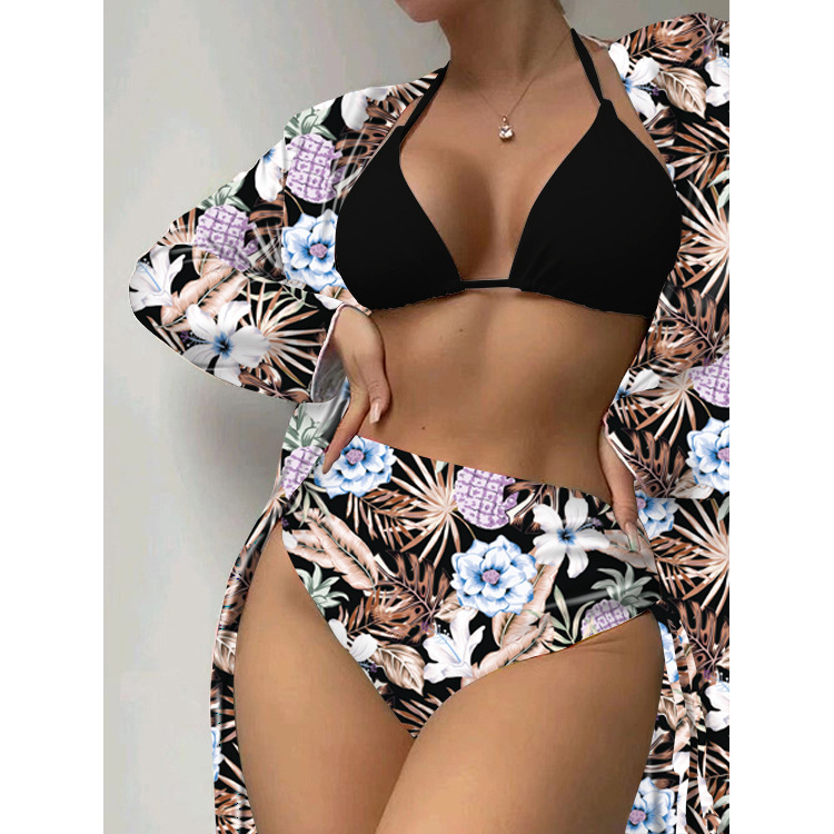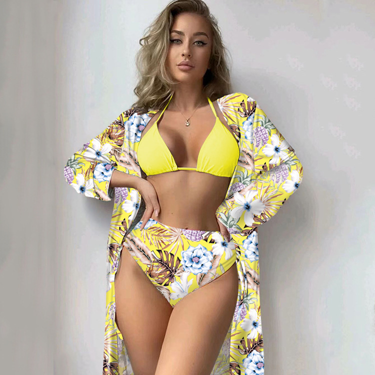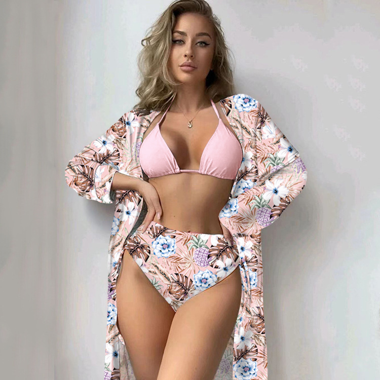 2023 유럽과 미국 크로스 보더 뉴 비키니 쓰리피스 수영복 아마존 하이 웨이스트 프린트 긴 소매 블라우스 비키니