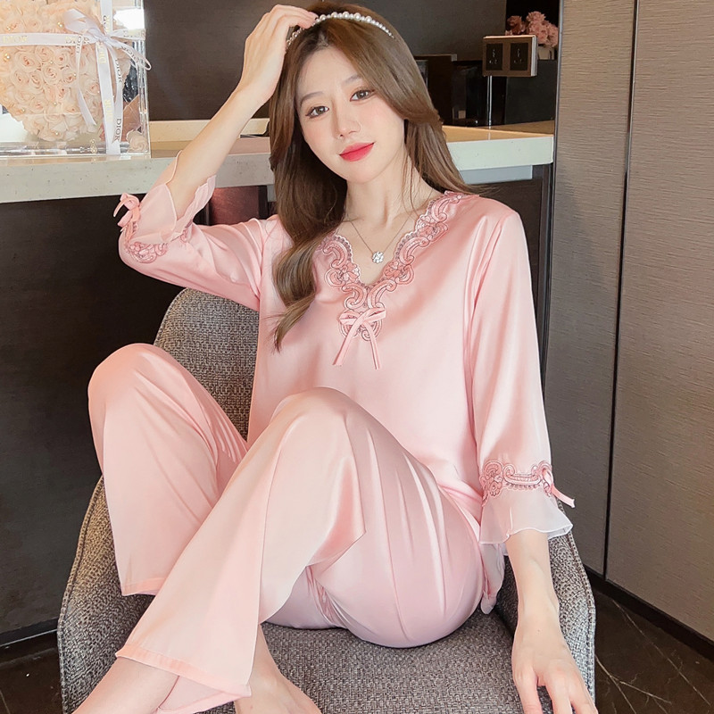 여자의 실크 잠옷 가정 옷 봄과 여름 얇은 얼음 실크 새틴 고급 긴팔 세트 섹시한 레이스