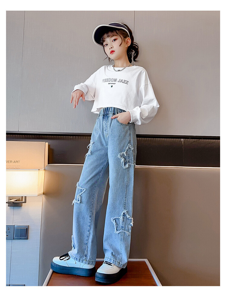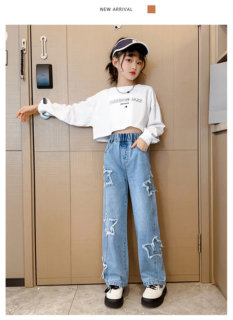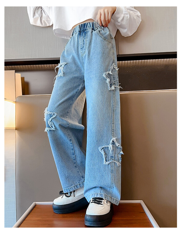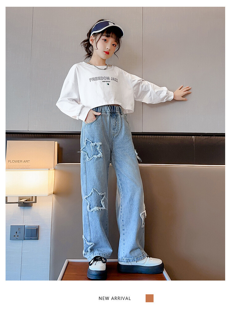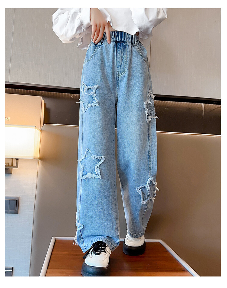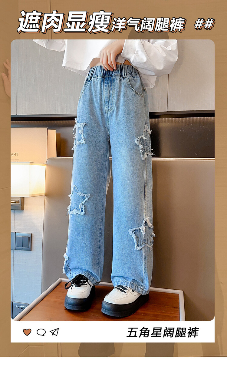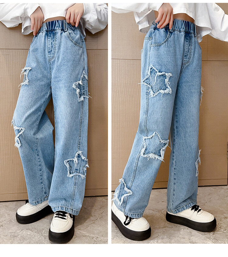 여아 와이드 팬츠 2023 스트레이트 캐주얼 롱 팬츠 아동용 중대형 어린이 별무늬 인기 데님 팬츠 한국 스타일 아동복스토어 가기