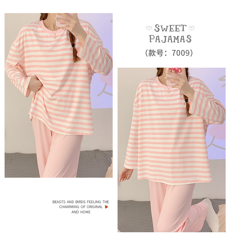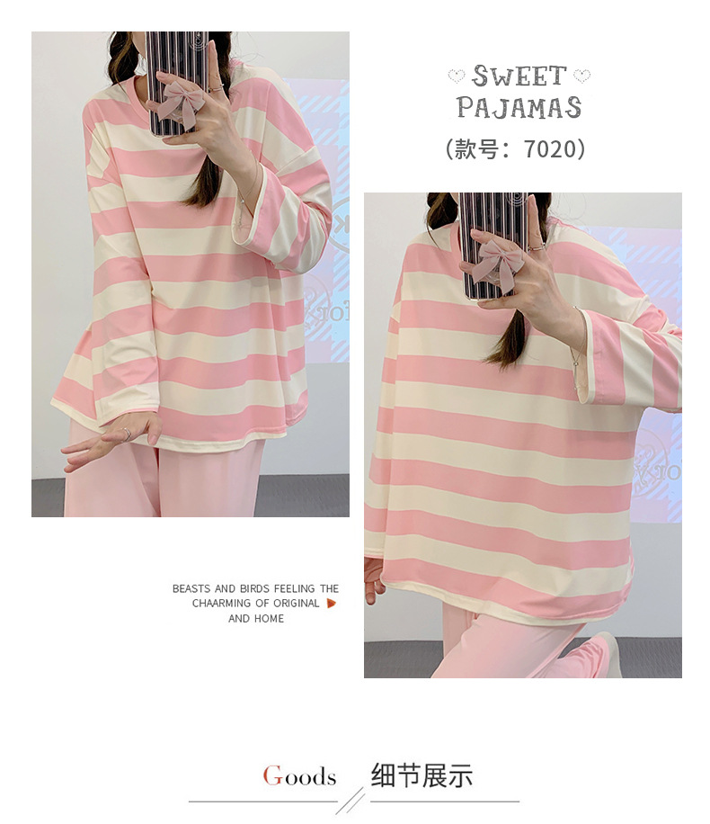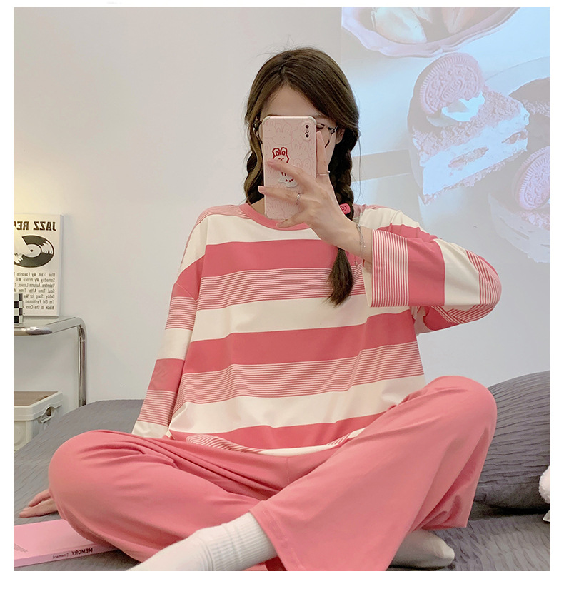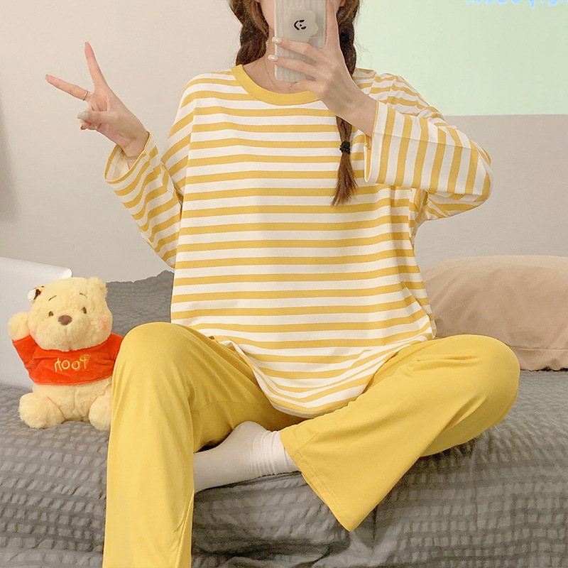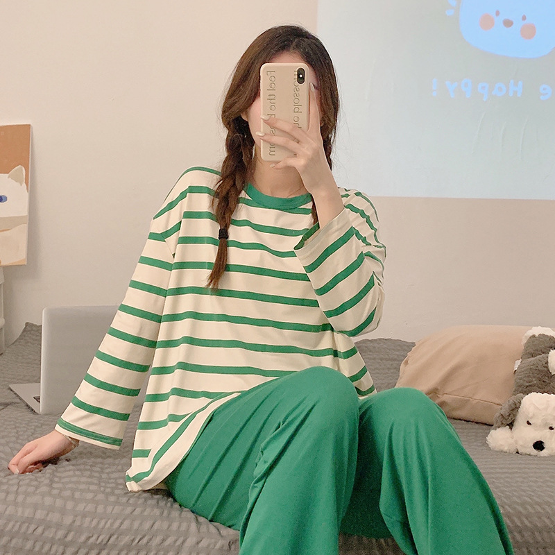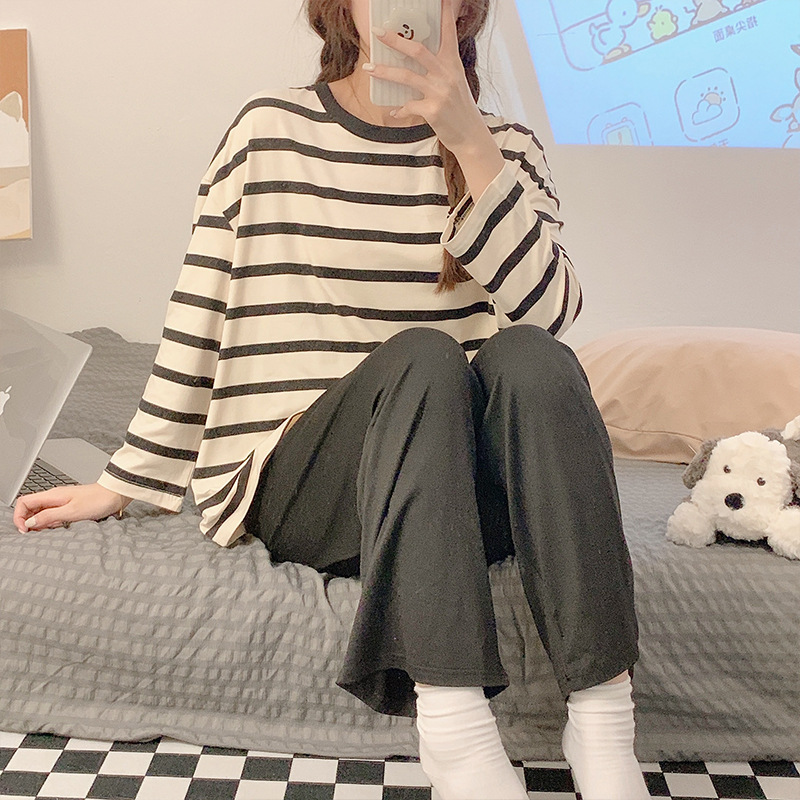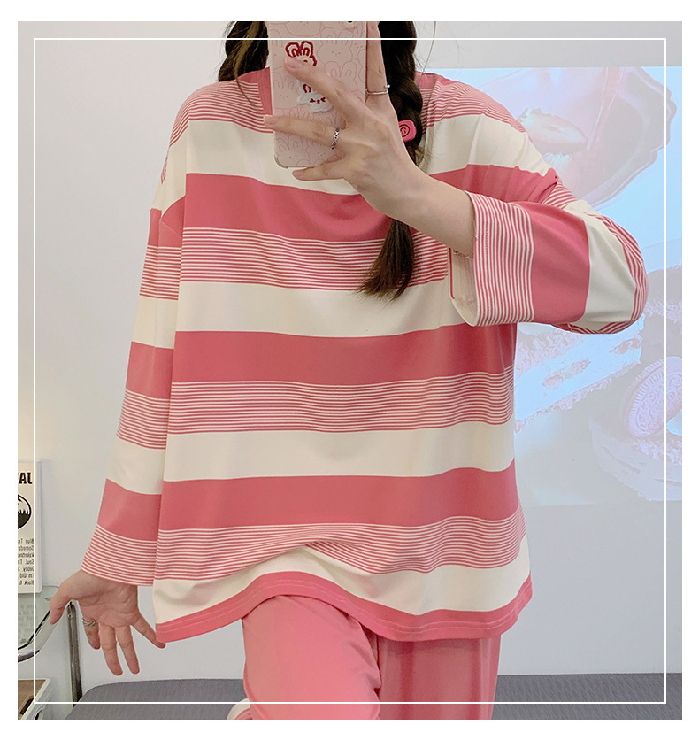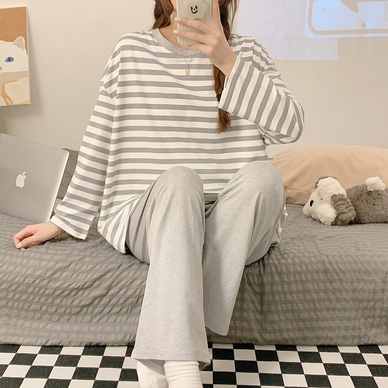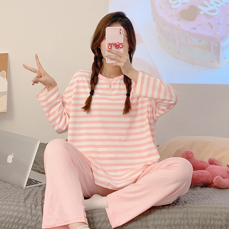 새로운 잠옷 여성용 긴팔 모조 면 봄과 가을 세트 느슨한 일본식 게으른 바지 가정복 스트라이프 캐주얼 투피스 세트스토어 가기