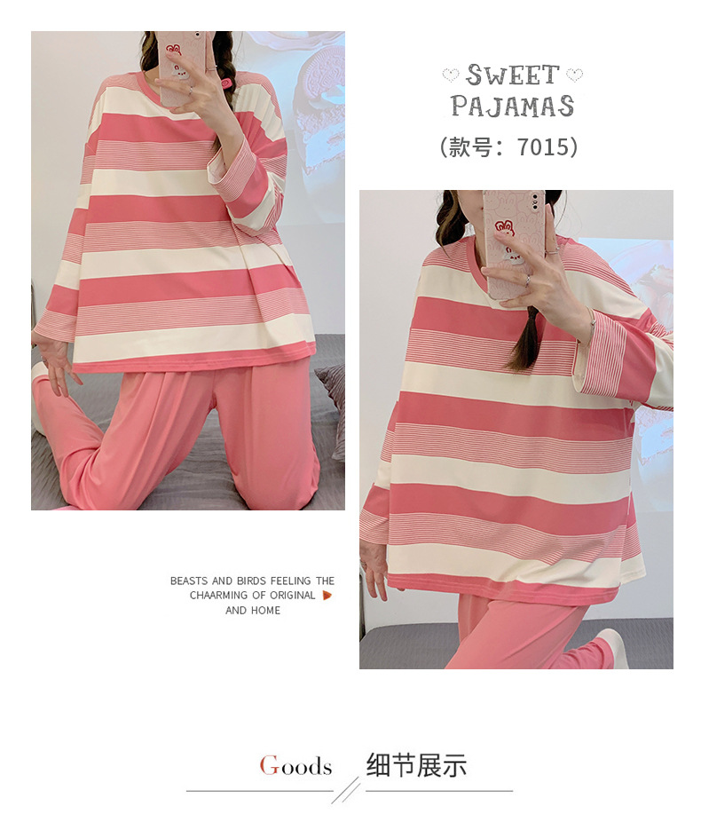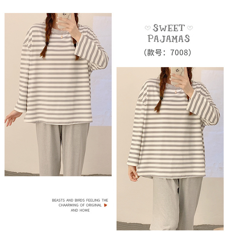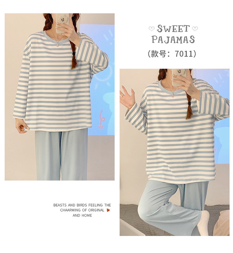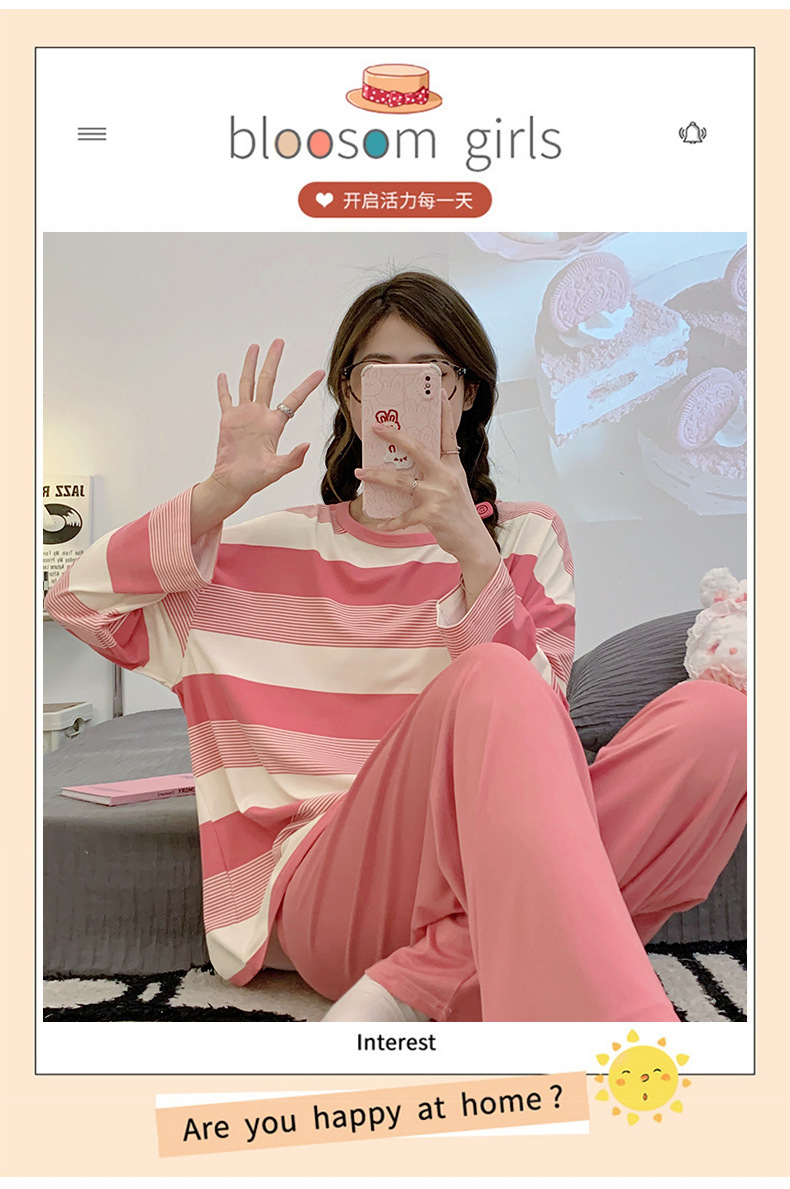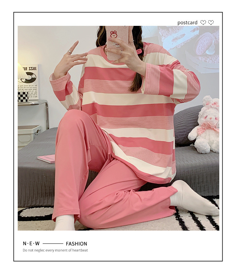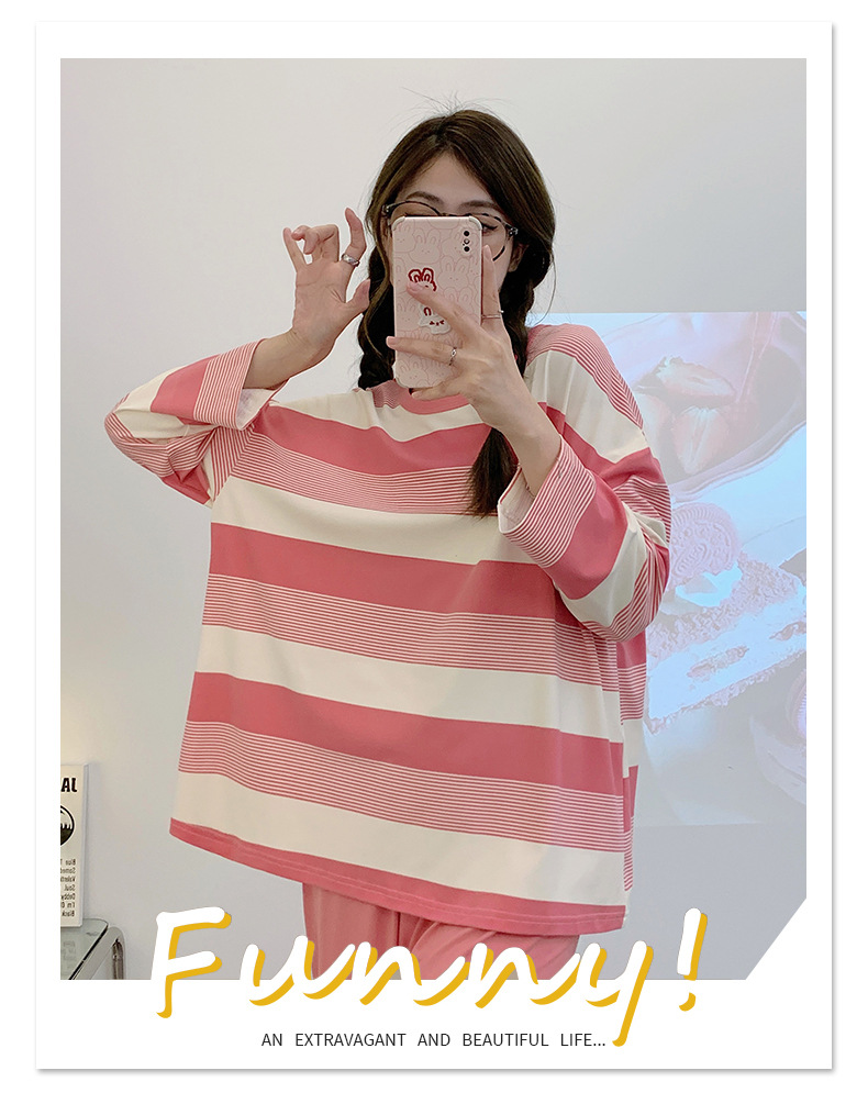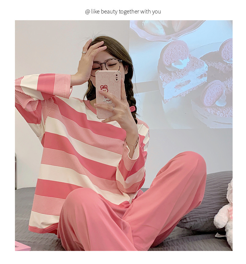 새로운 잠옷 여성용 긴팔 모조 면 봄과 가을 세트 느슨한 일본식 게으른 바지 가정복 스트라이프 캐주얼 투피스 세트스토어 가기