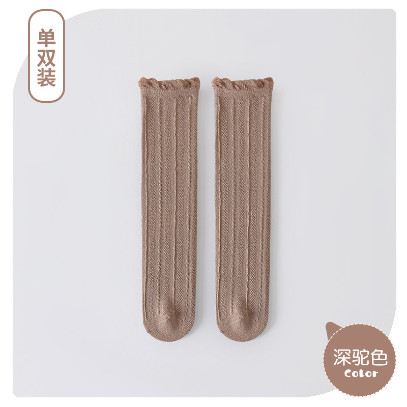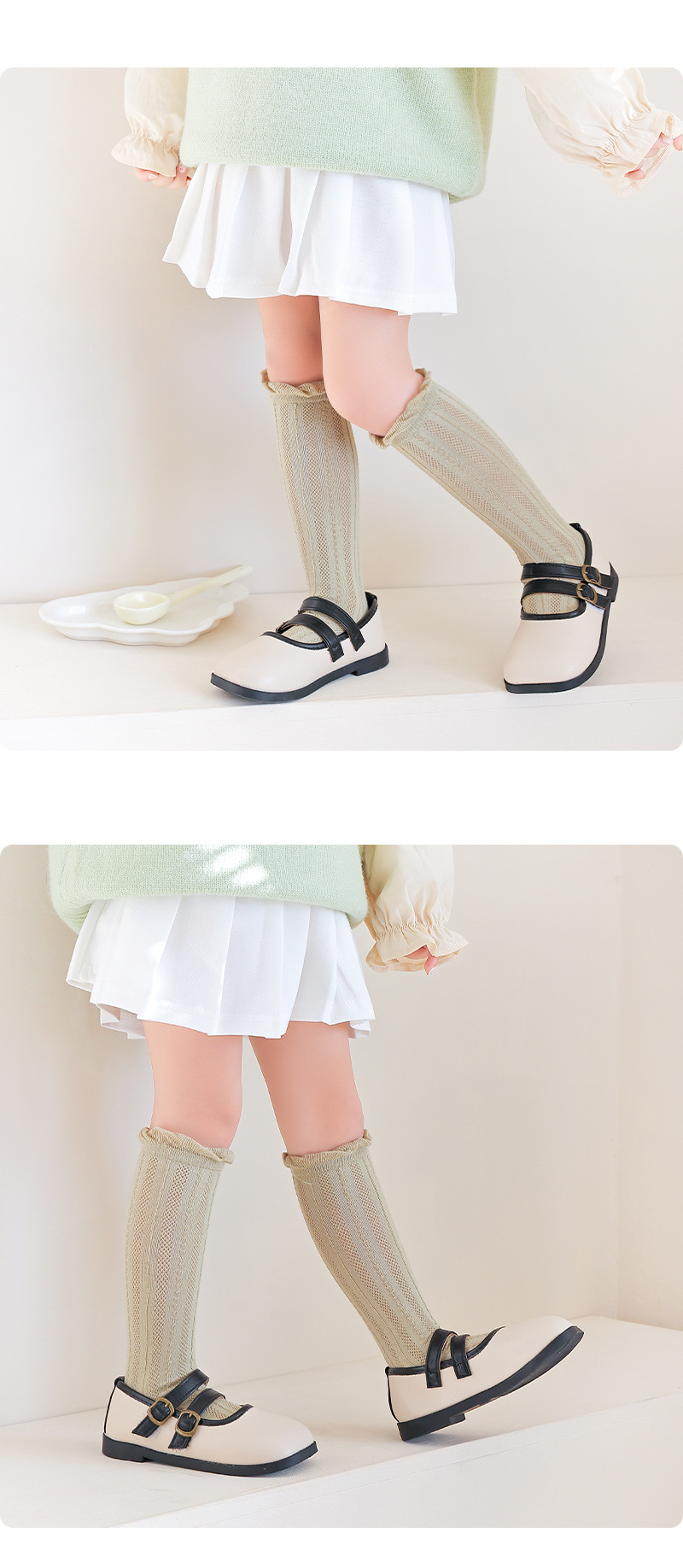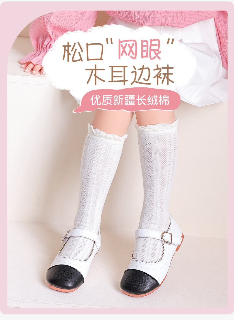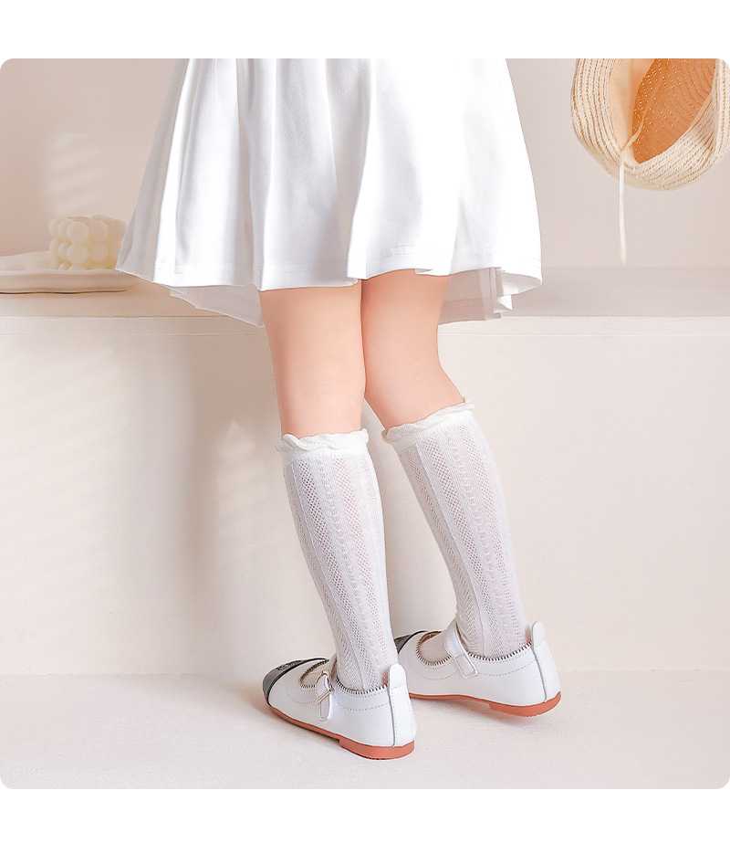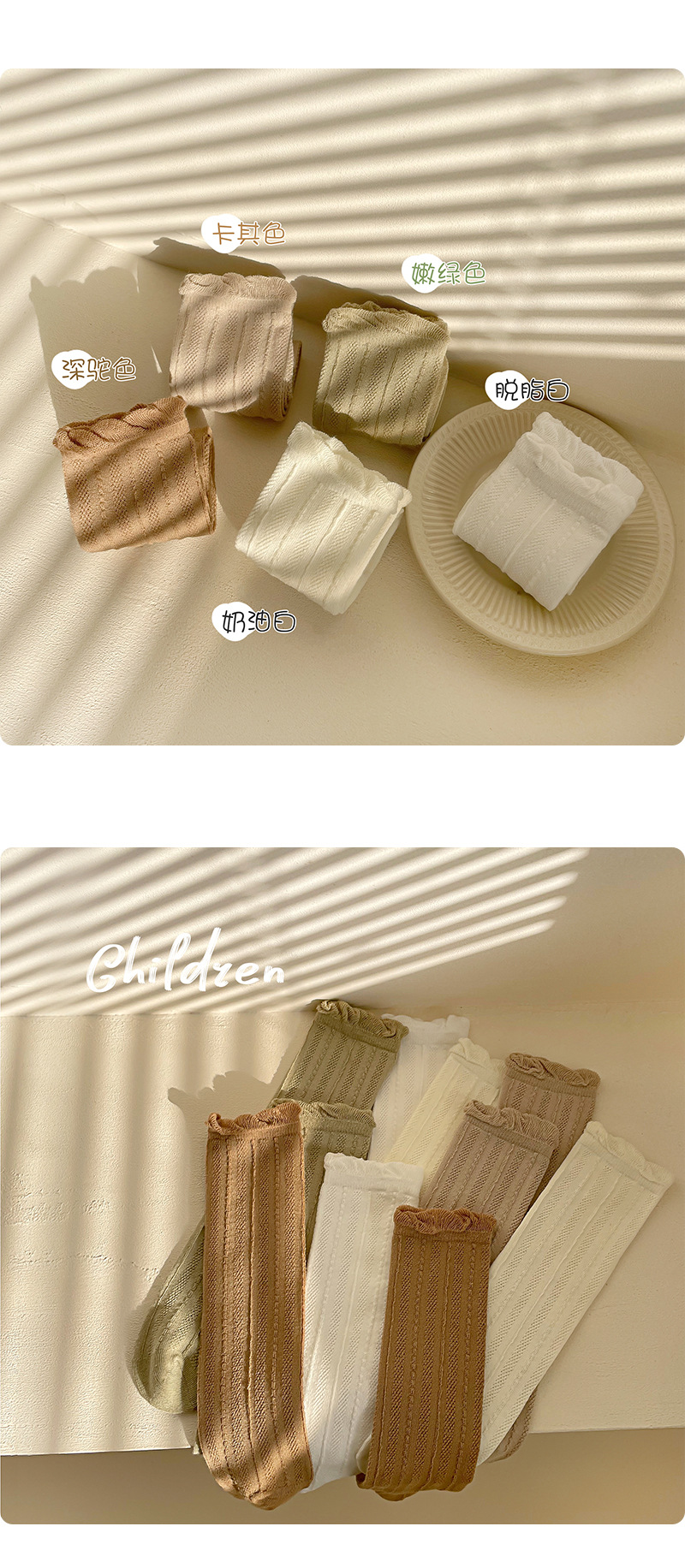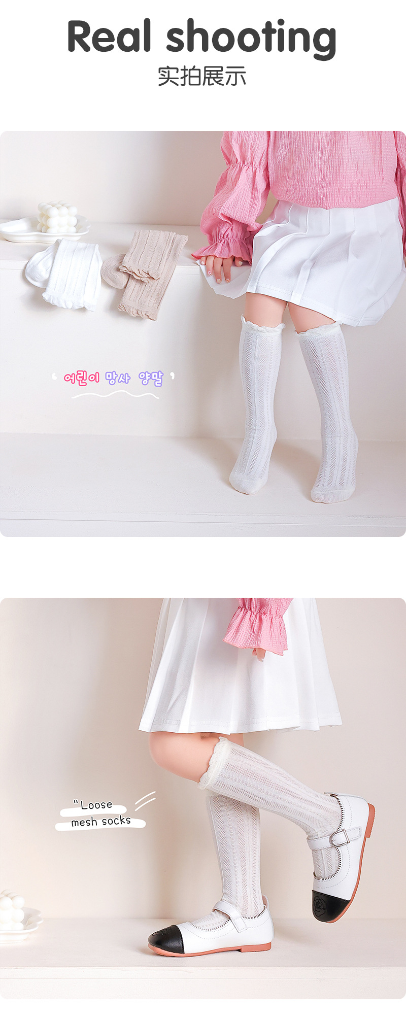 어린이 양말 느슨한 상단 파일 양말 2023 여름 새로운 메쉬 소녀 송아지 양말 단색 얇은 레이스 그물 배치