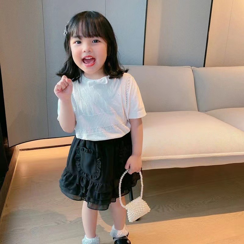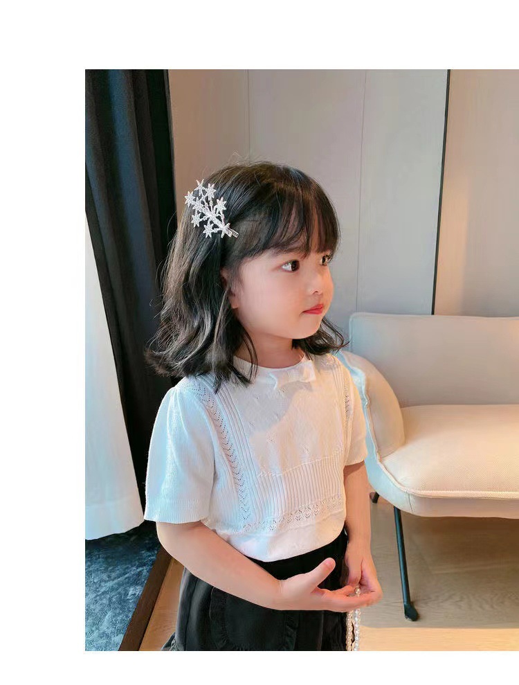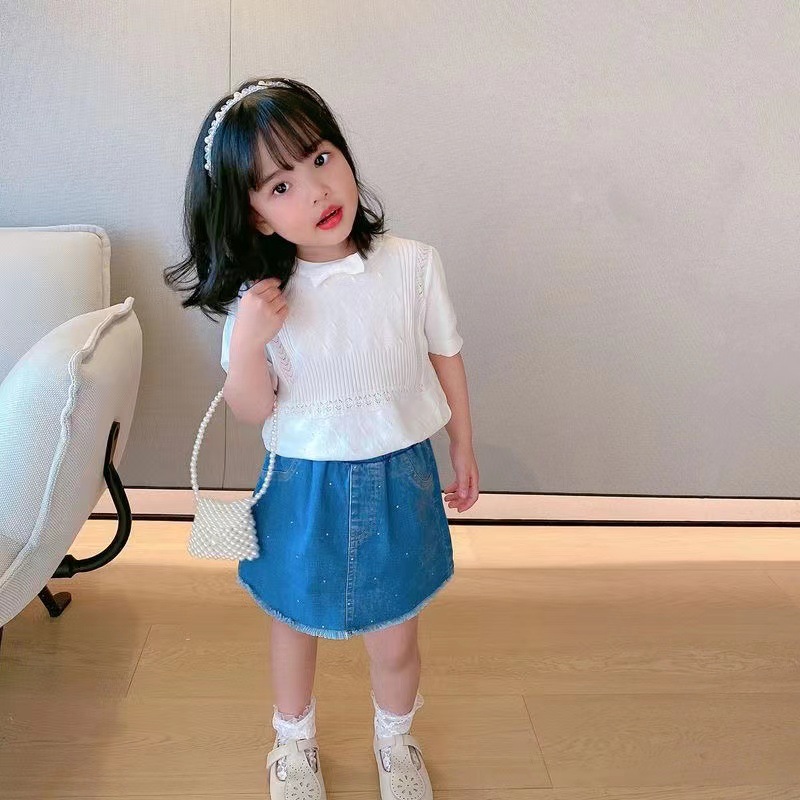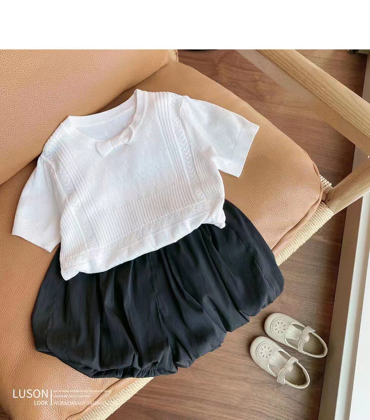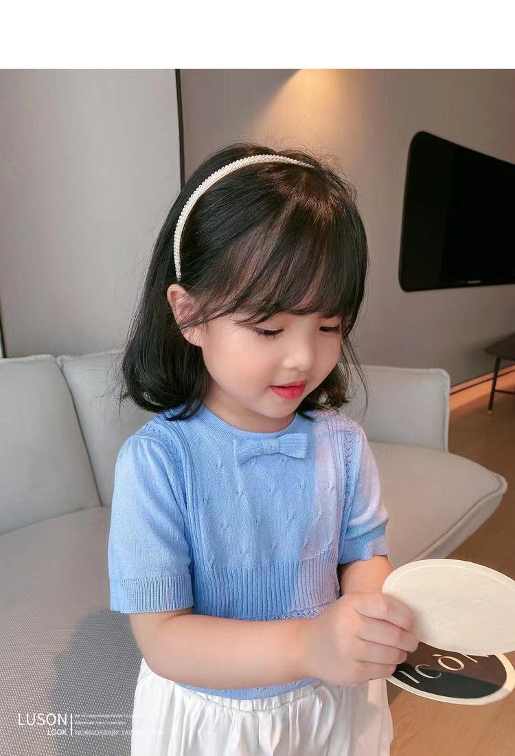 아동복 2023 여름 어린이 니트 라운드 넥 반팔 티셔츠 화이트 보우 여아 한국식 아이스 실크 탑