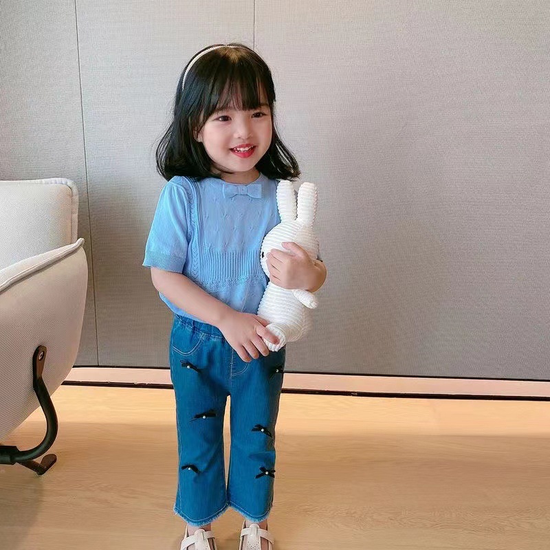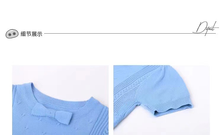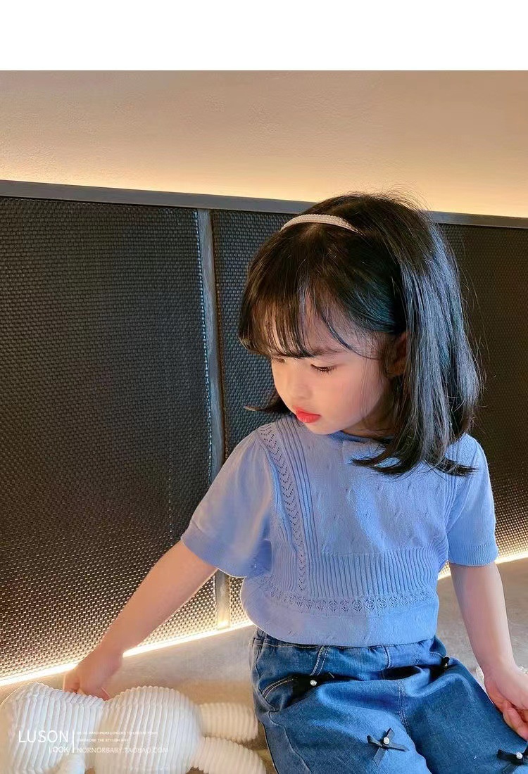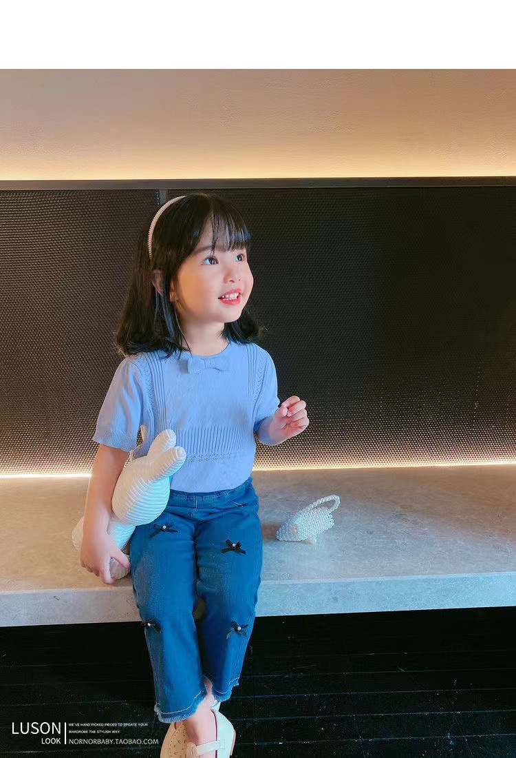 아동복 2023 여름 어린이 니트 라운드 넥 반팔 티셔츠 화이트 보우 여아 한국식 아이스 실크 탑스토어 가기