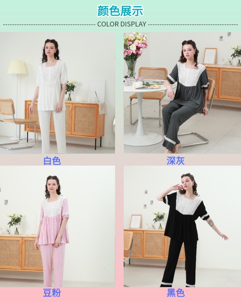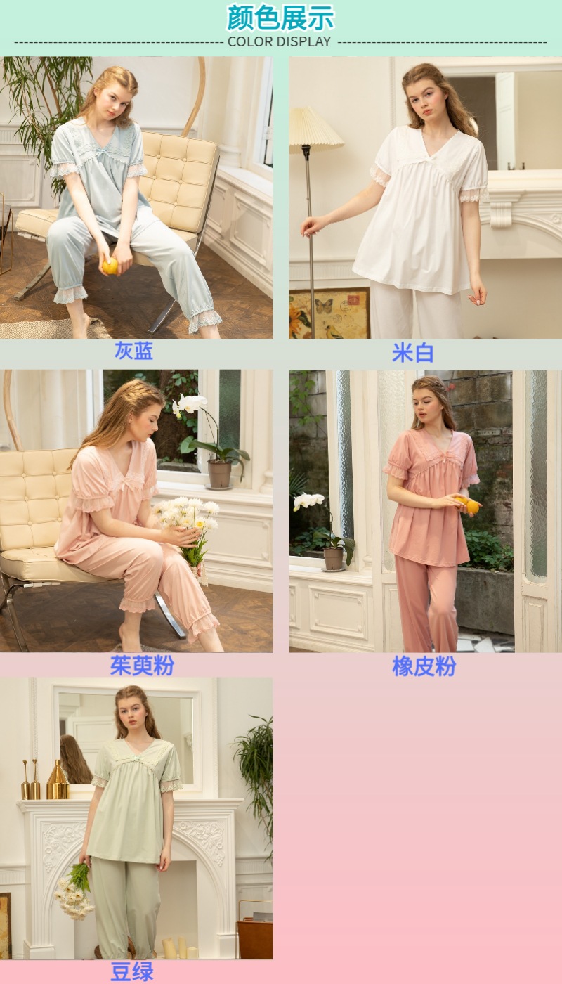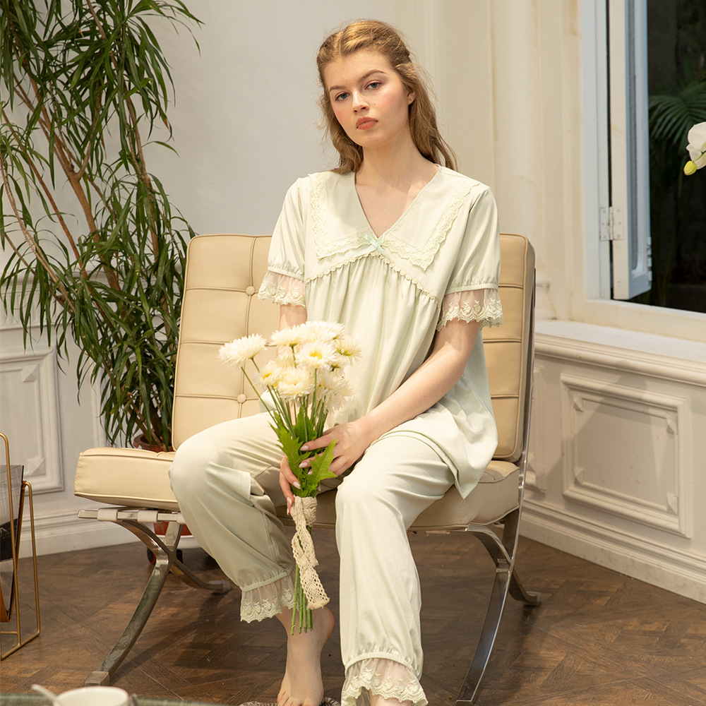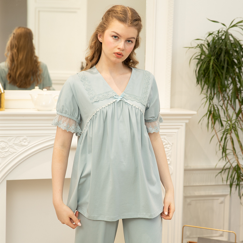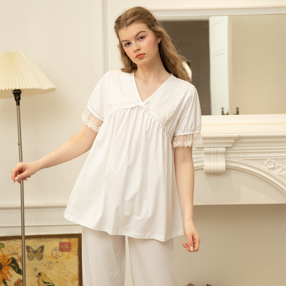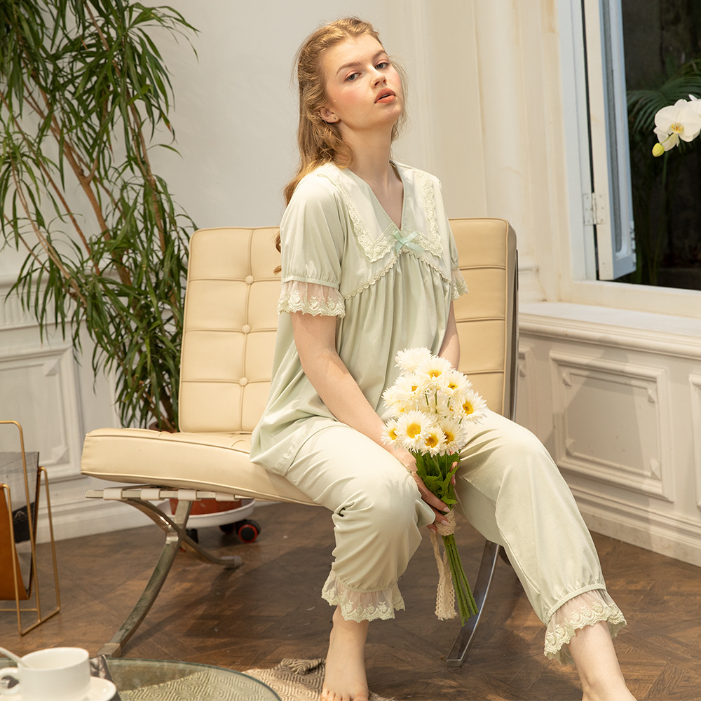 프랑스 스타일 달콤한 잠옷 여자의 여름 새로운 순면 귀여운 느슨한 통기성 레이스 공주 궁전 스타일 가정 옷 세트