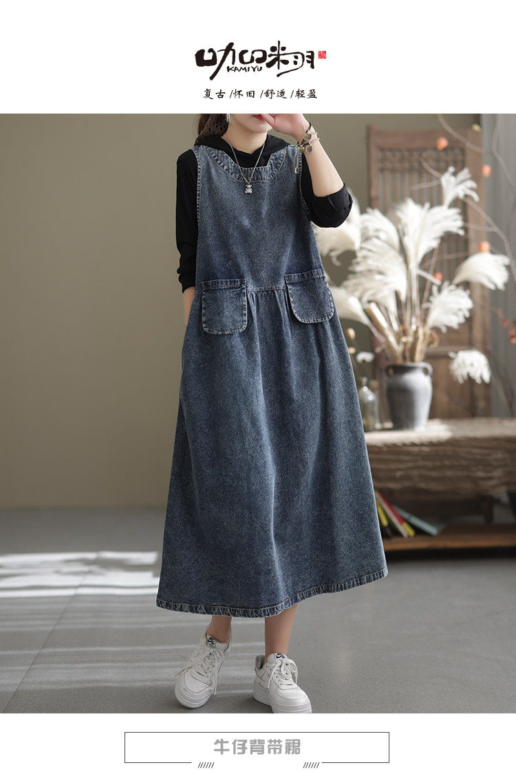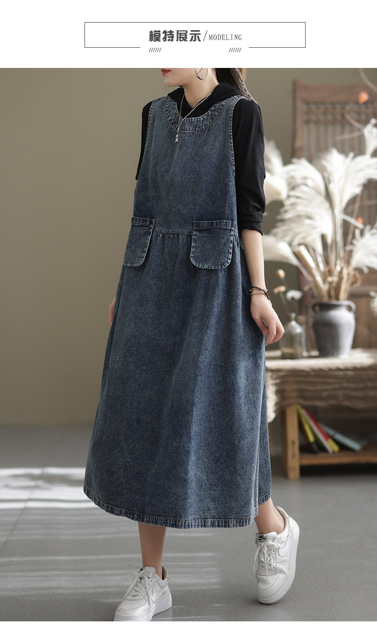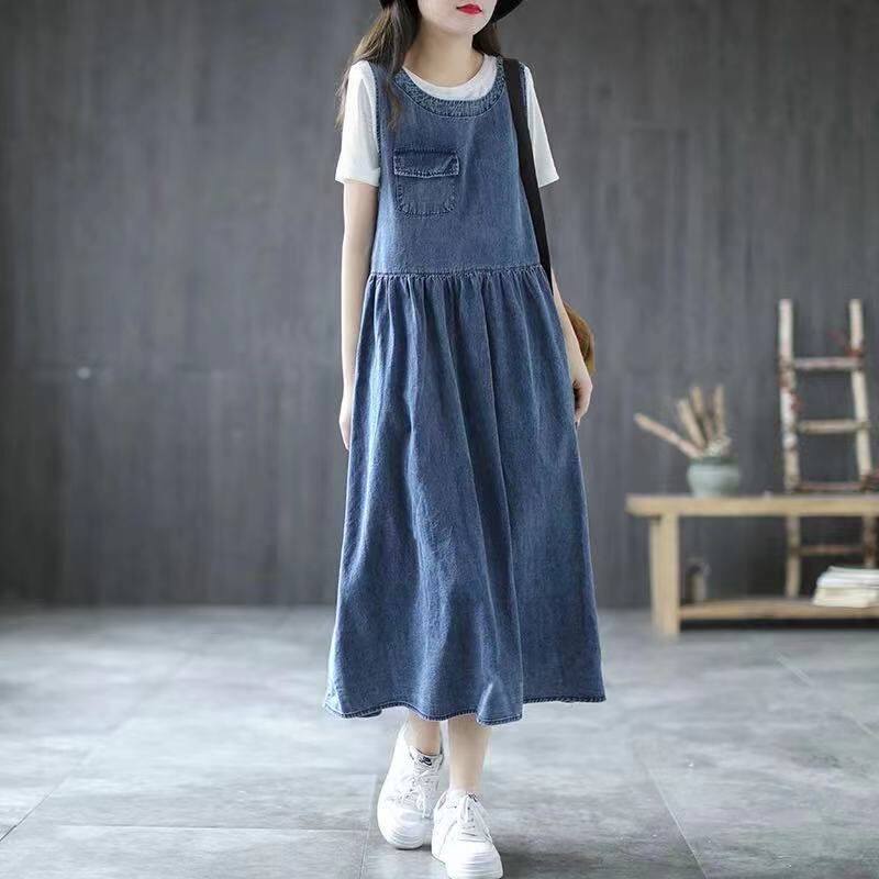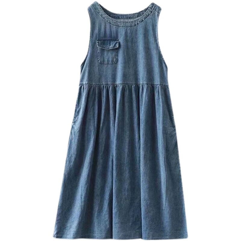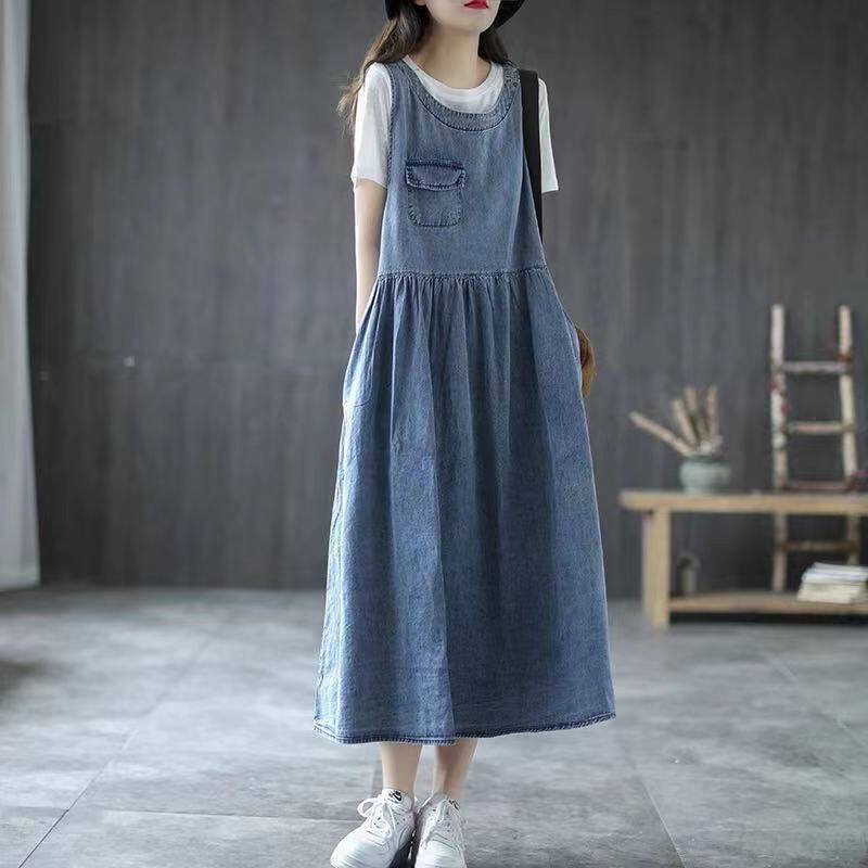 데님 원피스 여자의 봄과 여름 라운드 넥 중간 길이 캐주얼 예술적 느슨한 슬리밍 빈티지 플러스 사이즈 여자의 조끼 스커트스토어 가기