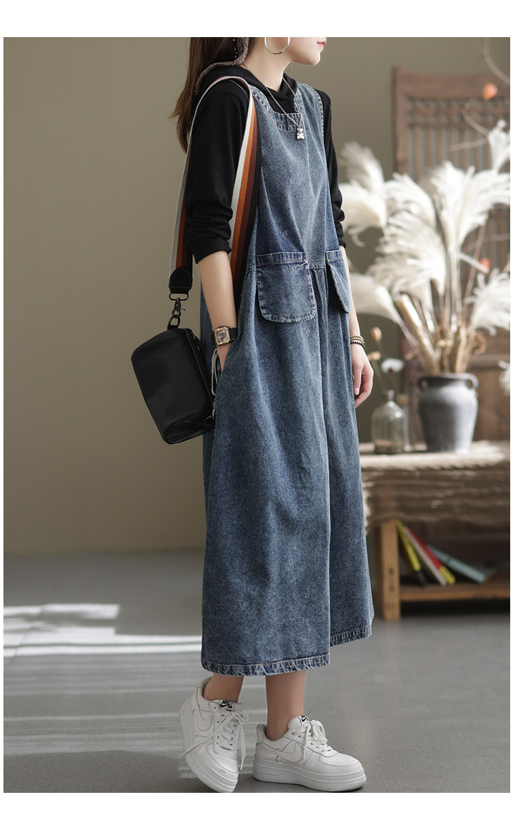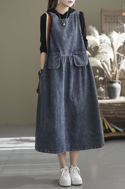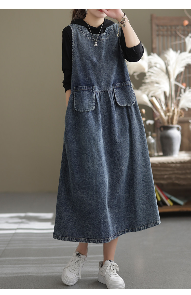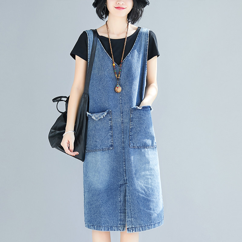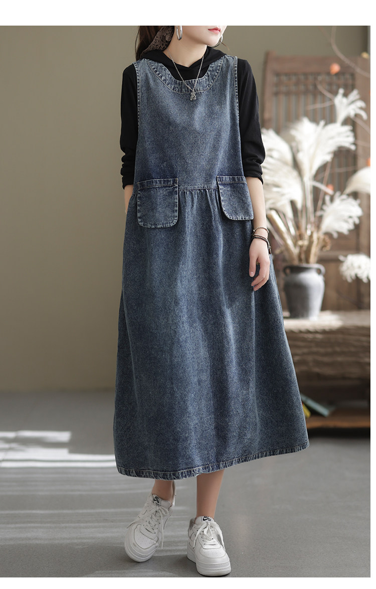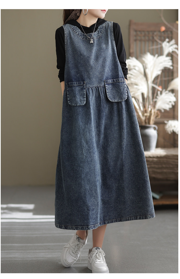 데님 원피스 여자의 봄과 여름 라운드 넥 중간 길이 캐주얼 예술적 느슨한 슬리밍 빈티지 플러스 사이즈 여자의 조끼 스커트스토어 가기