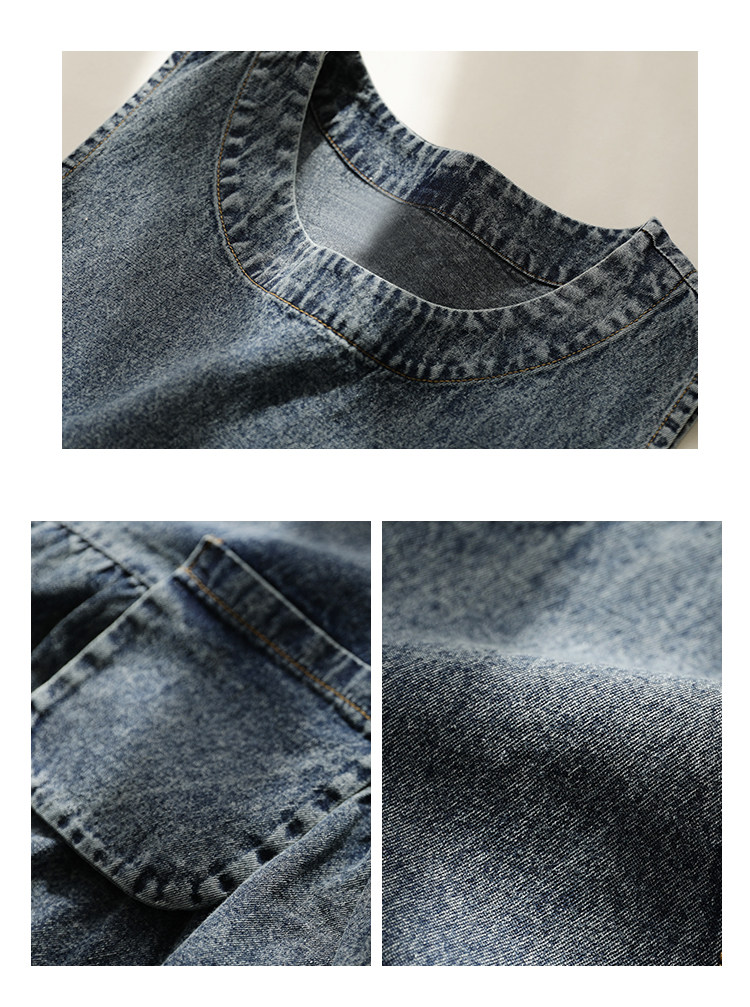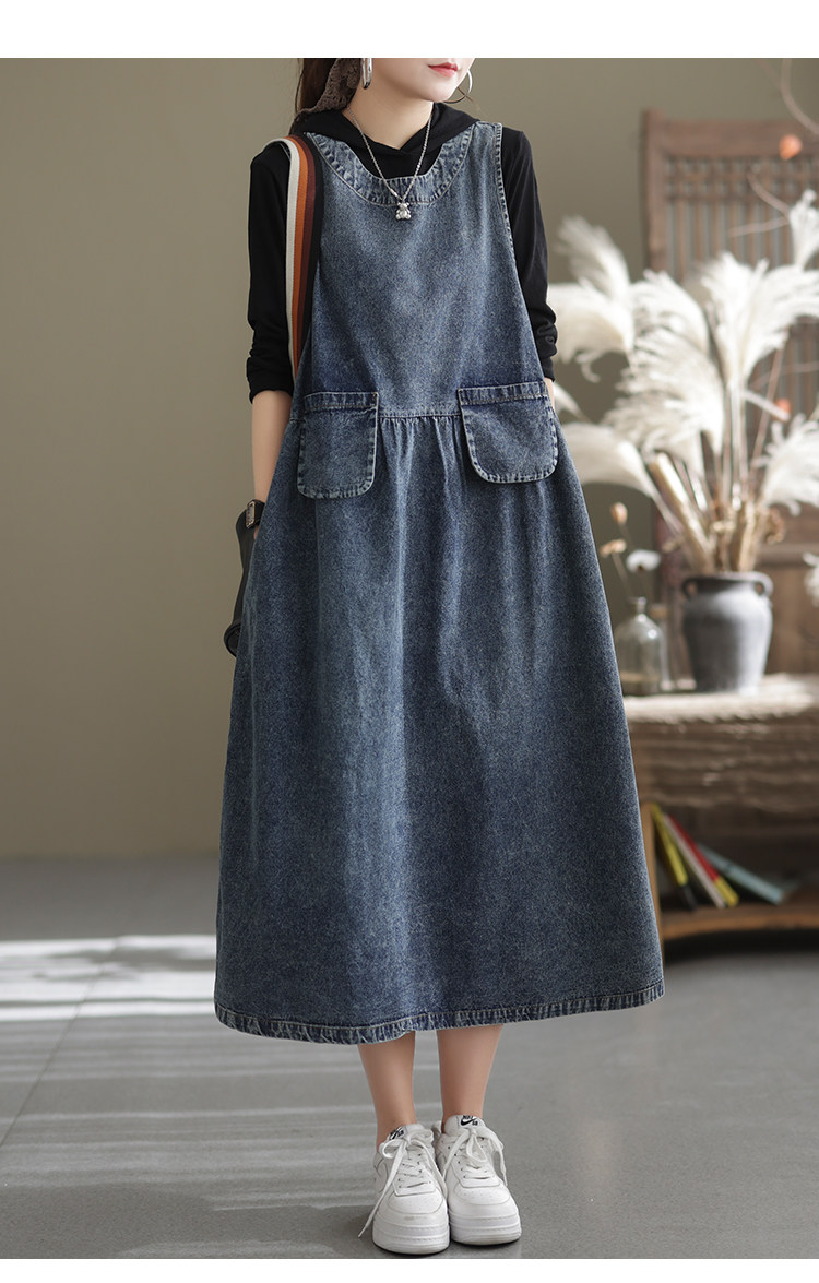 데님 원피스 여자의 봄과 여름 라운드 넥 중간 길이 캐주얼 예술적 느슨한 슬리밍 빈티지 플러스 사이즈 여자의 조끼 스커트